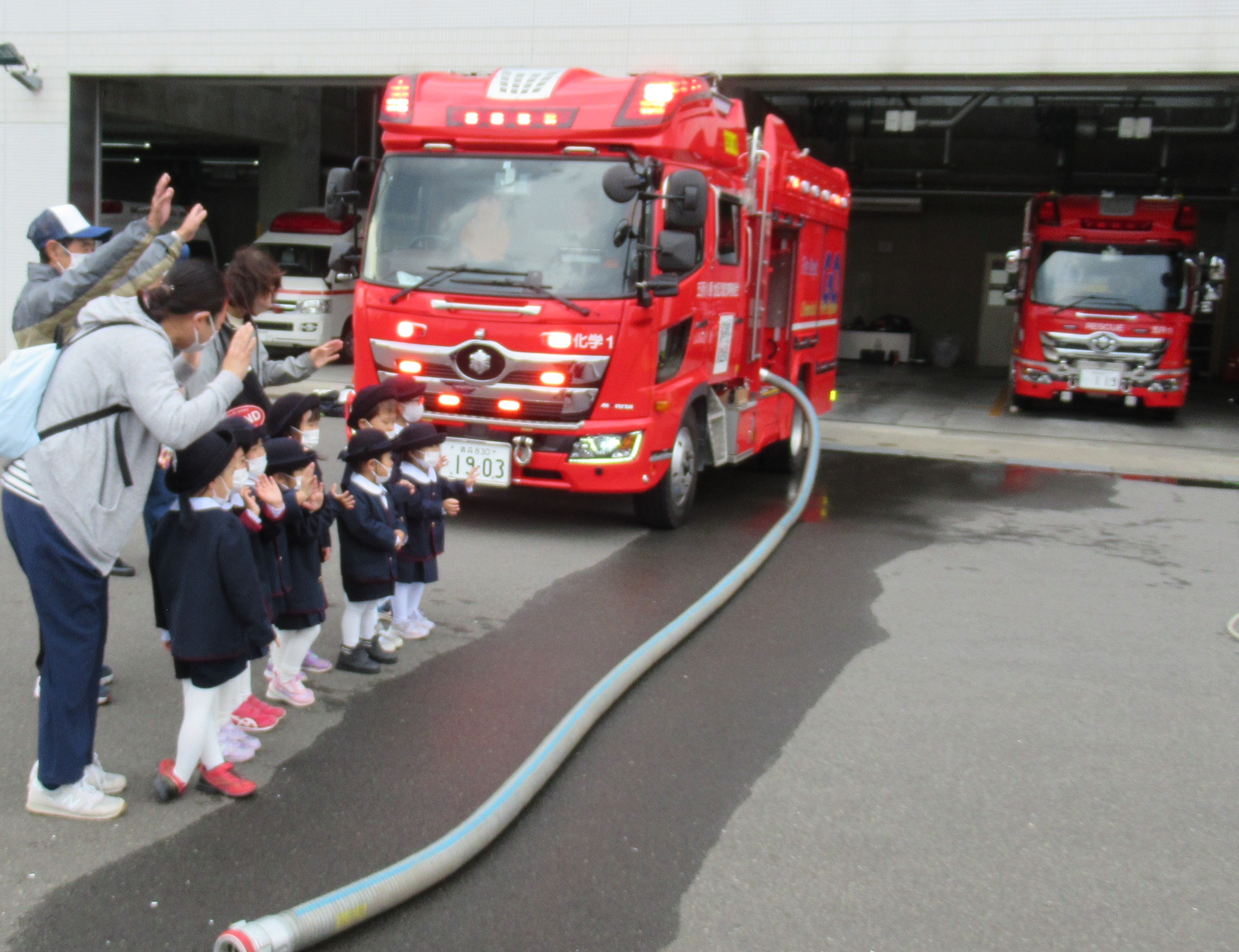 うさぎ組とひよこ組さんと一緒に行き、消防署内の見学や救急車、消防車などを見ることができました。