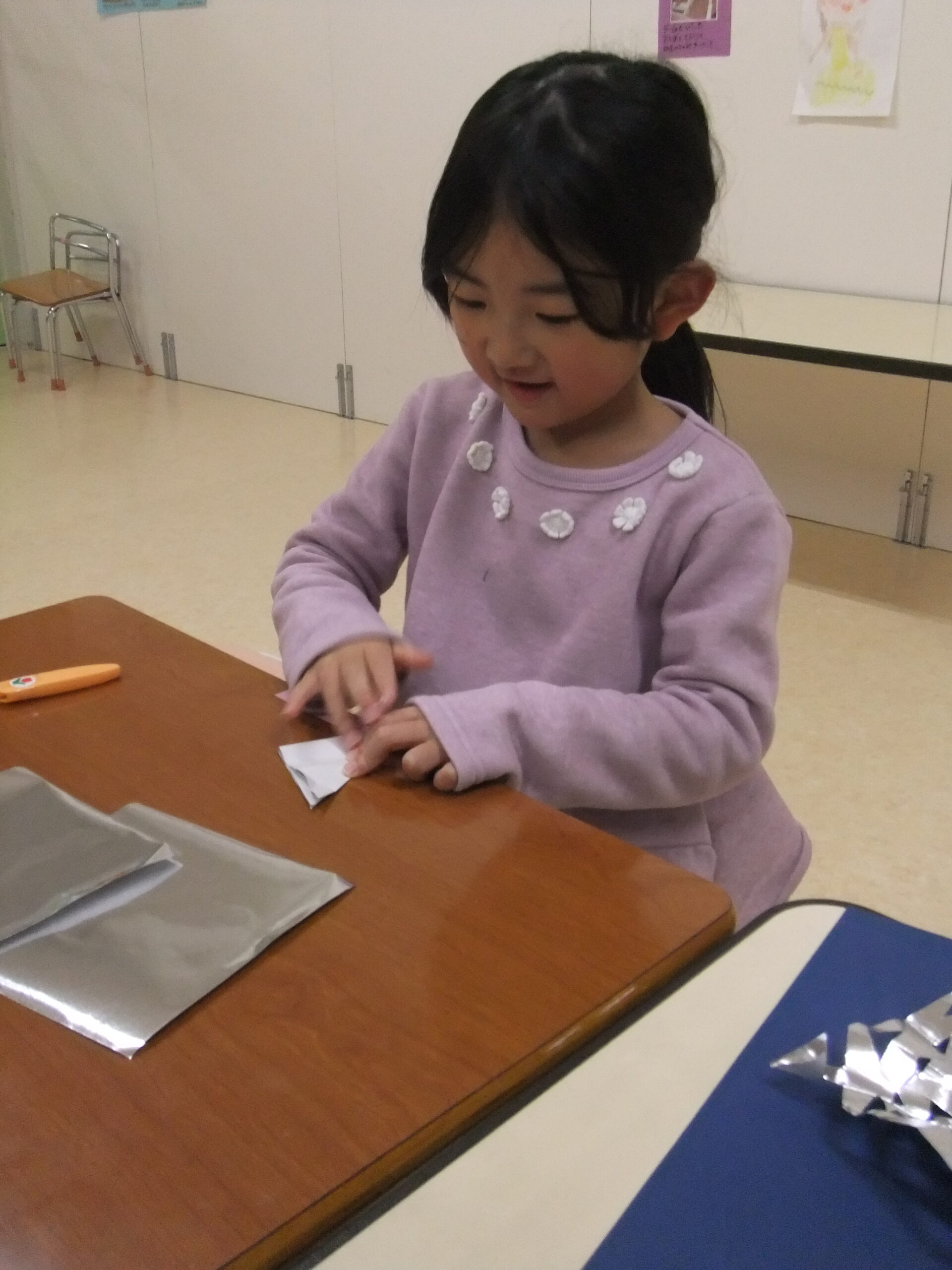 銀の折り紙を何度か折り、鉛筆で書いて印をつけたところを切り抜き、完成後広げて見るたび「うわ~!とてもキレ~✨」と歓声を上げていました。