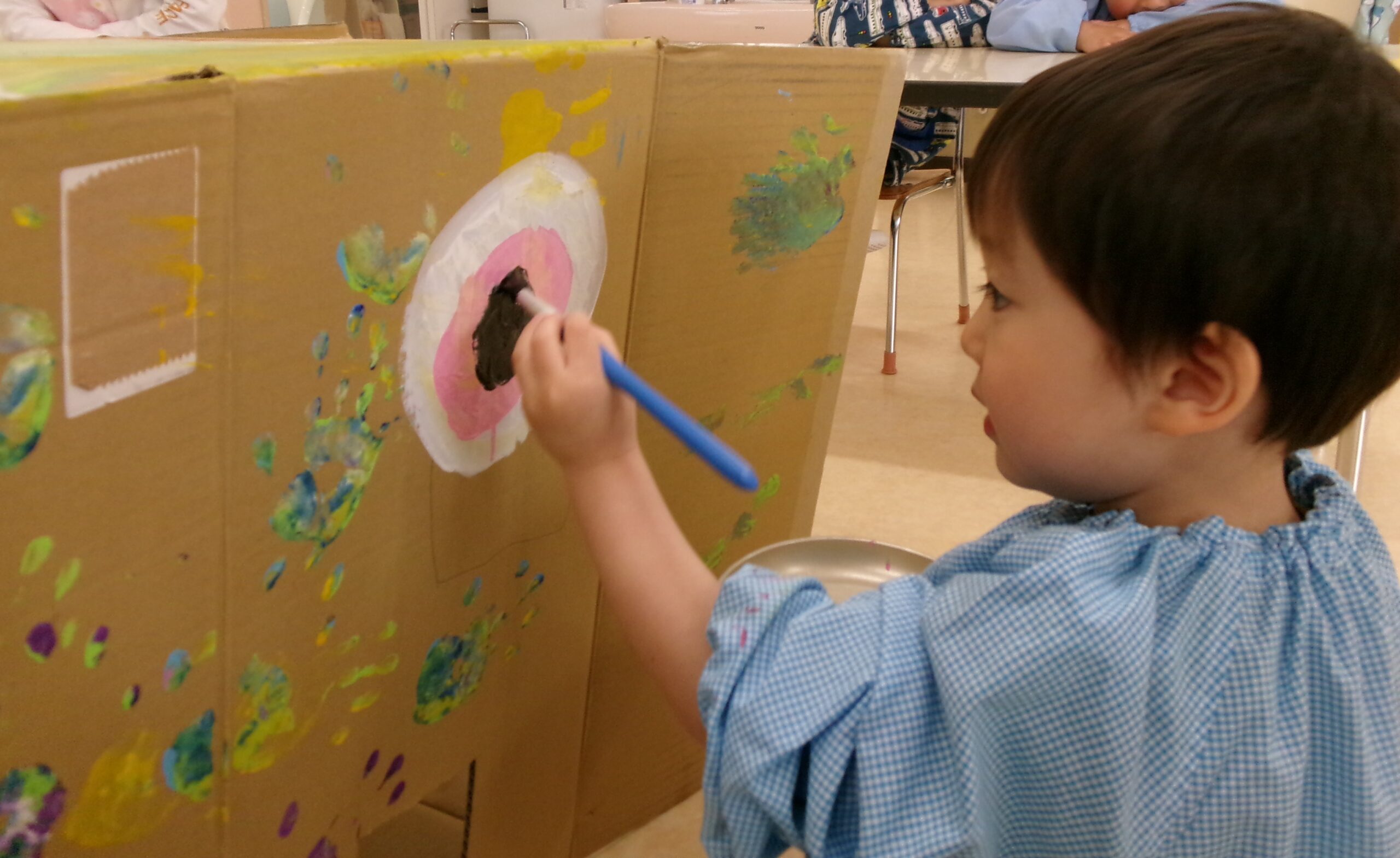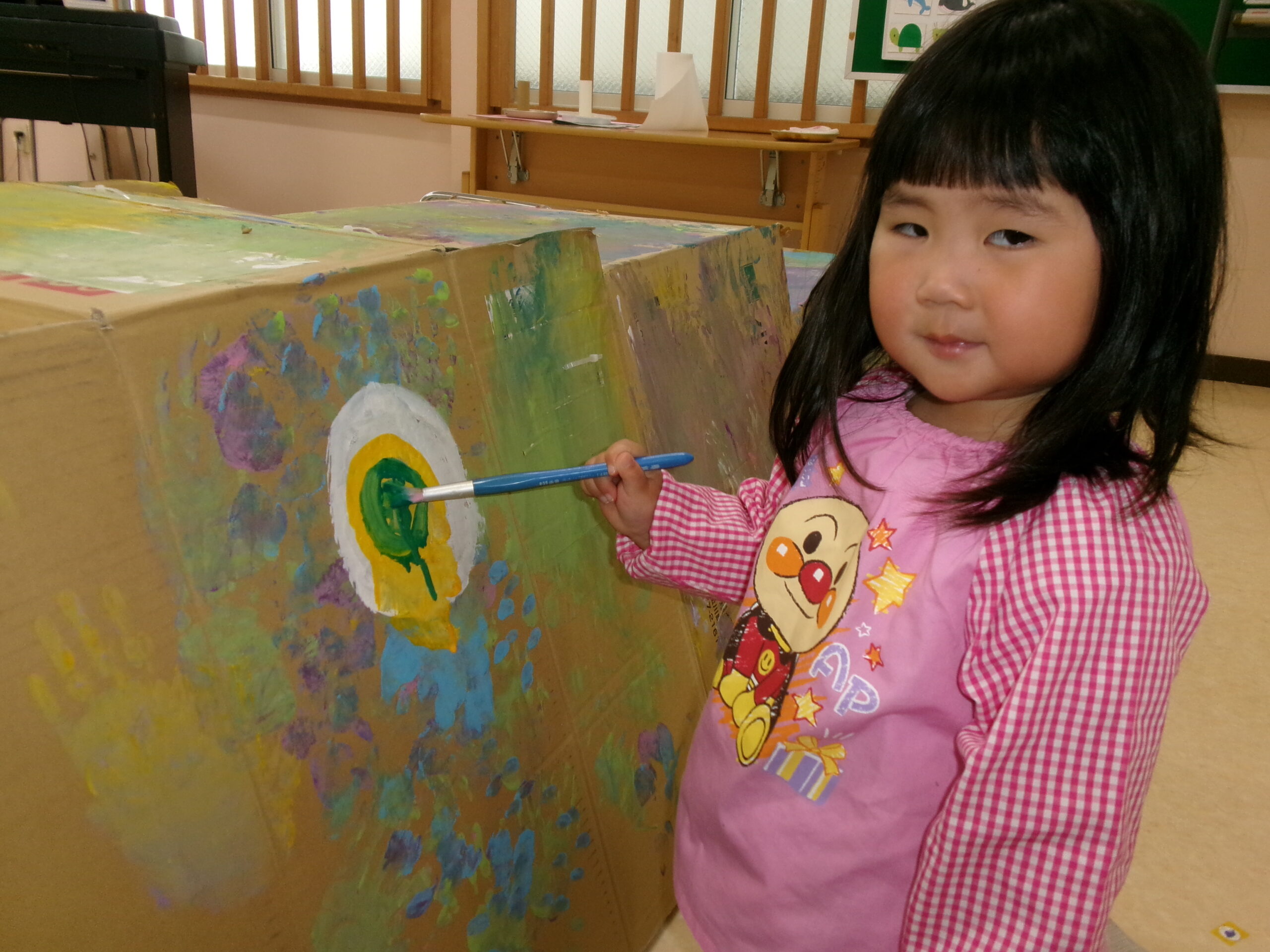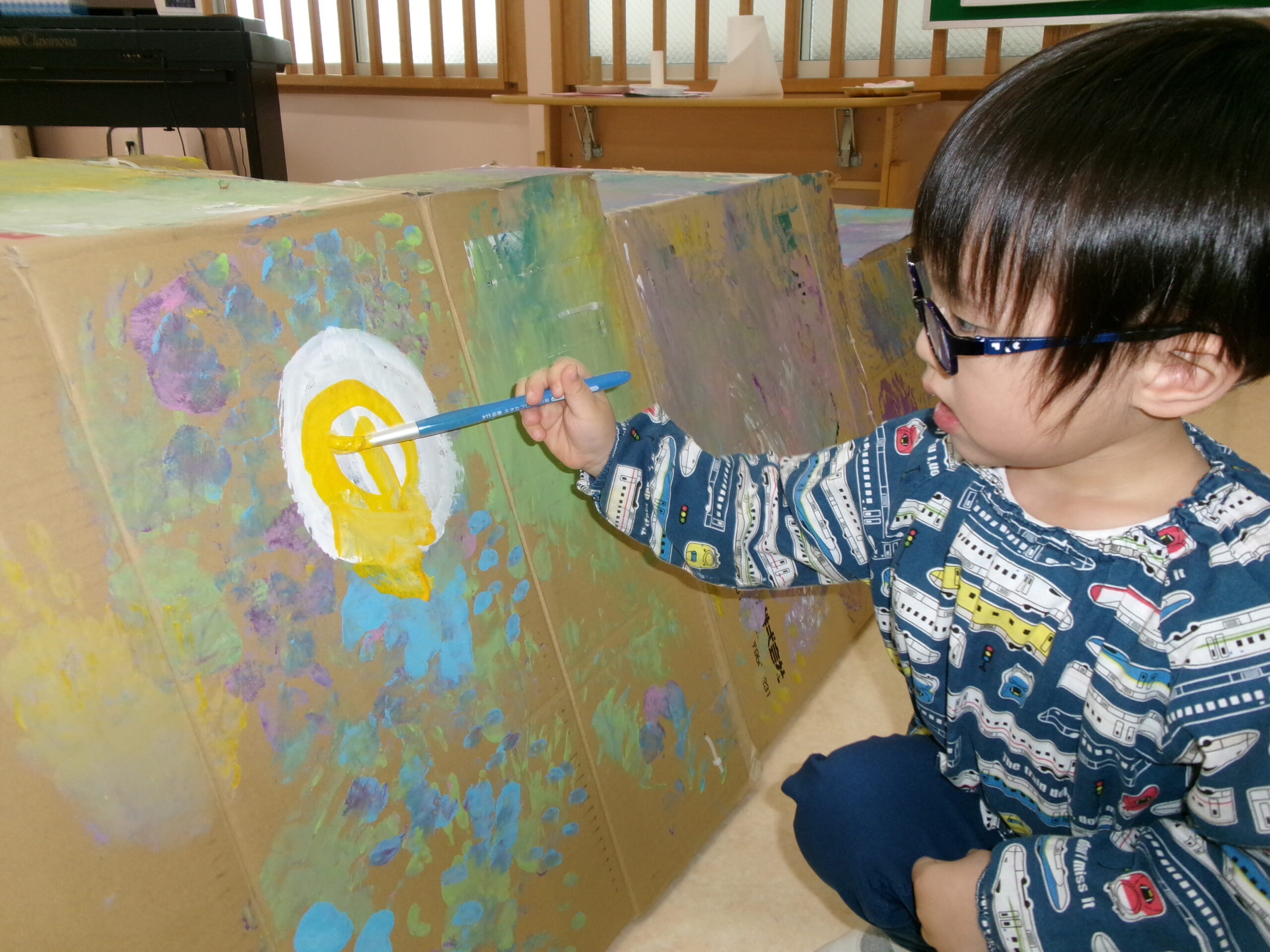 終わりごろには手も足も顔にも絵の具がべったりついていて