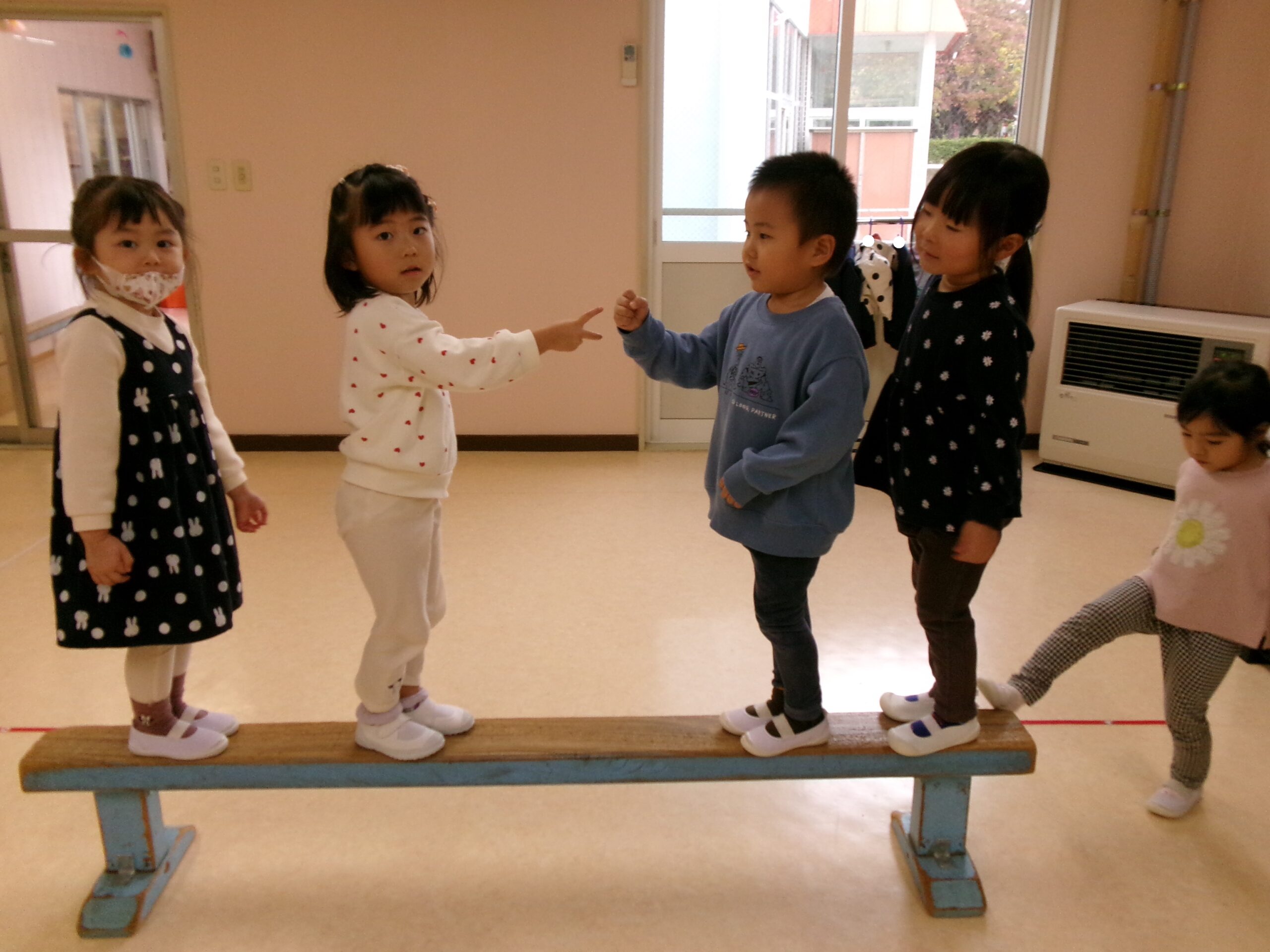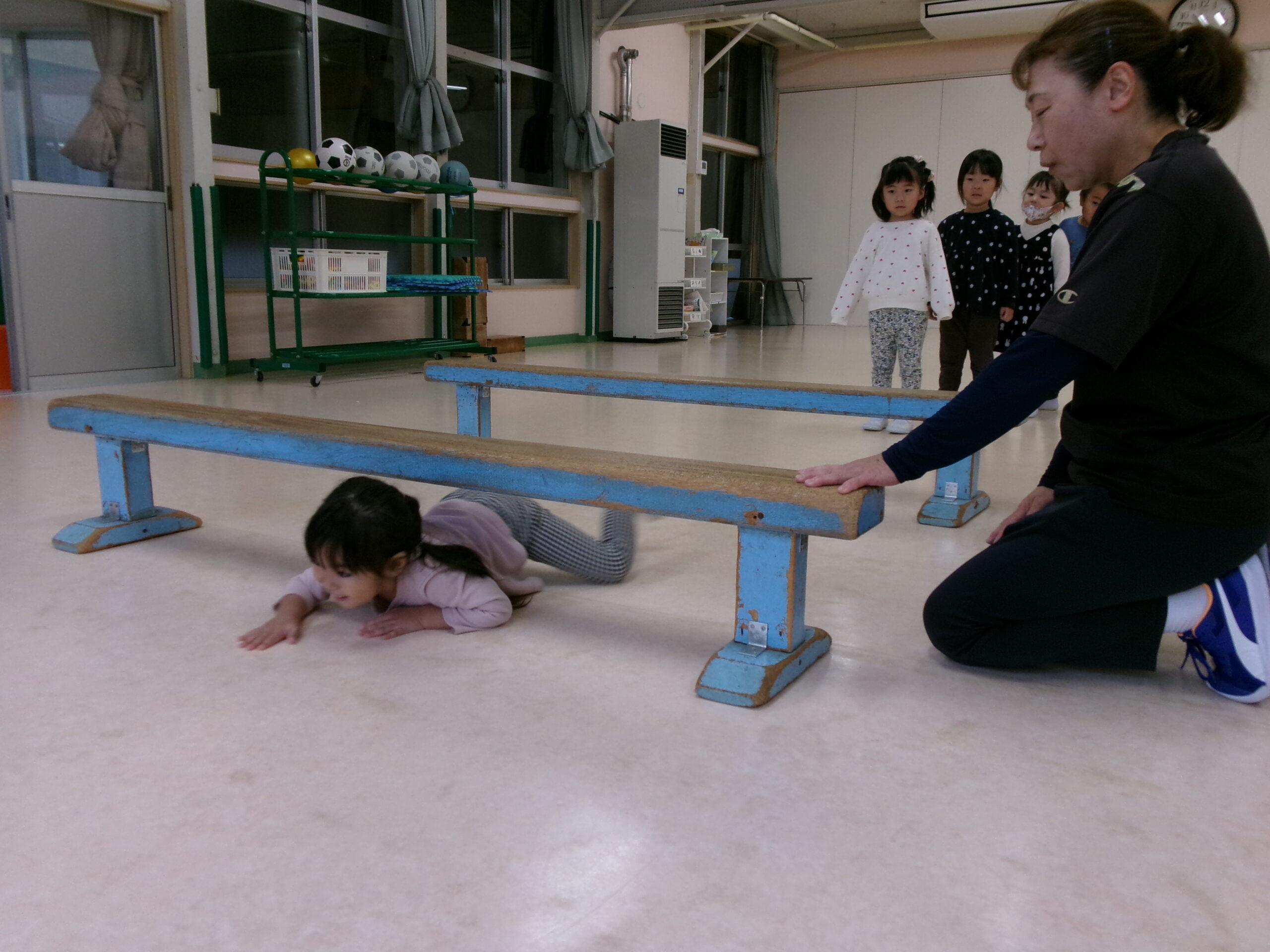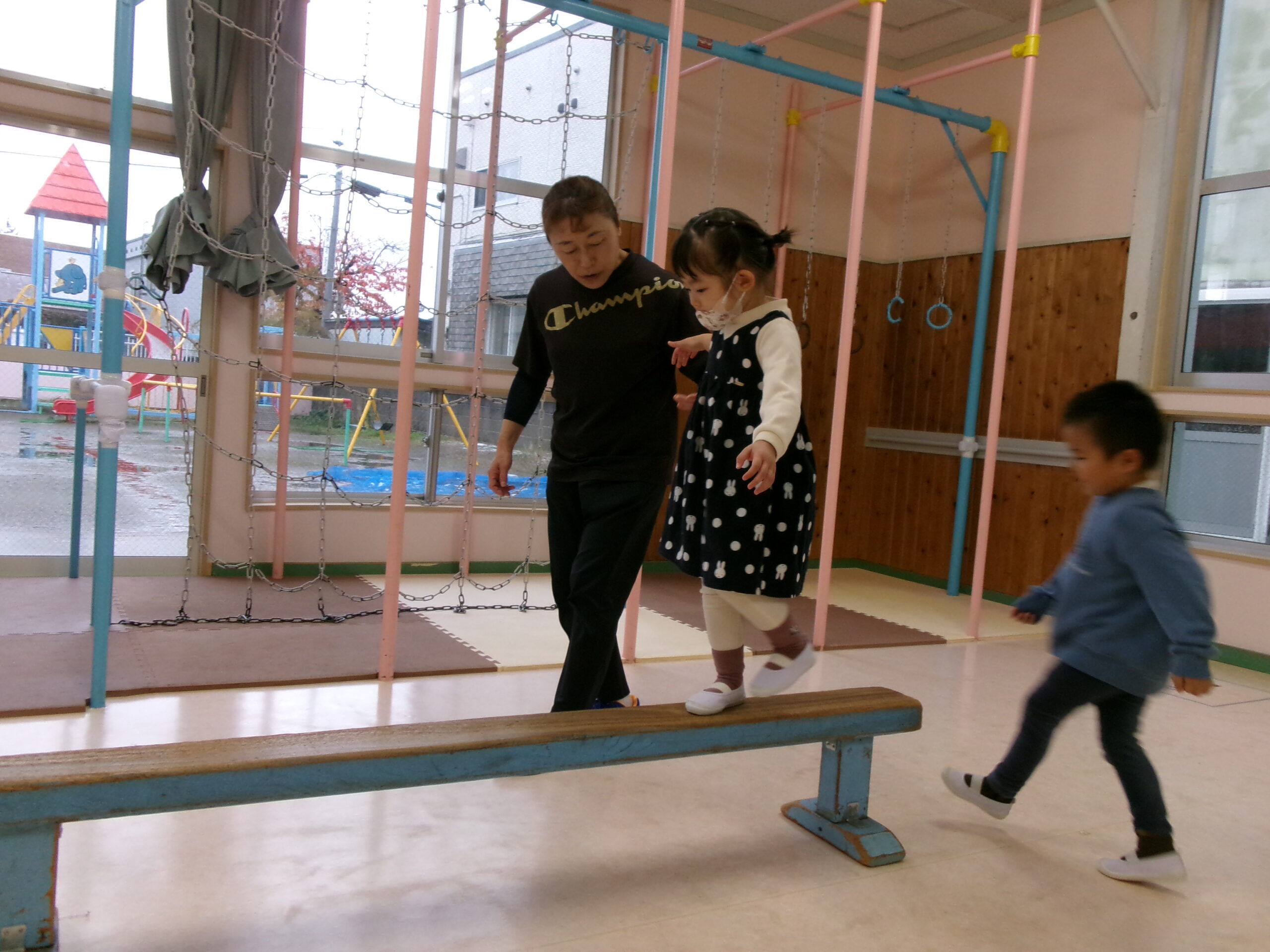 体操教室の後も、お部屋で平均台を使ってじゃんけん橋をして遊びましたよ。