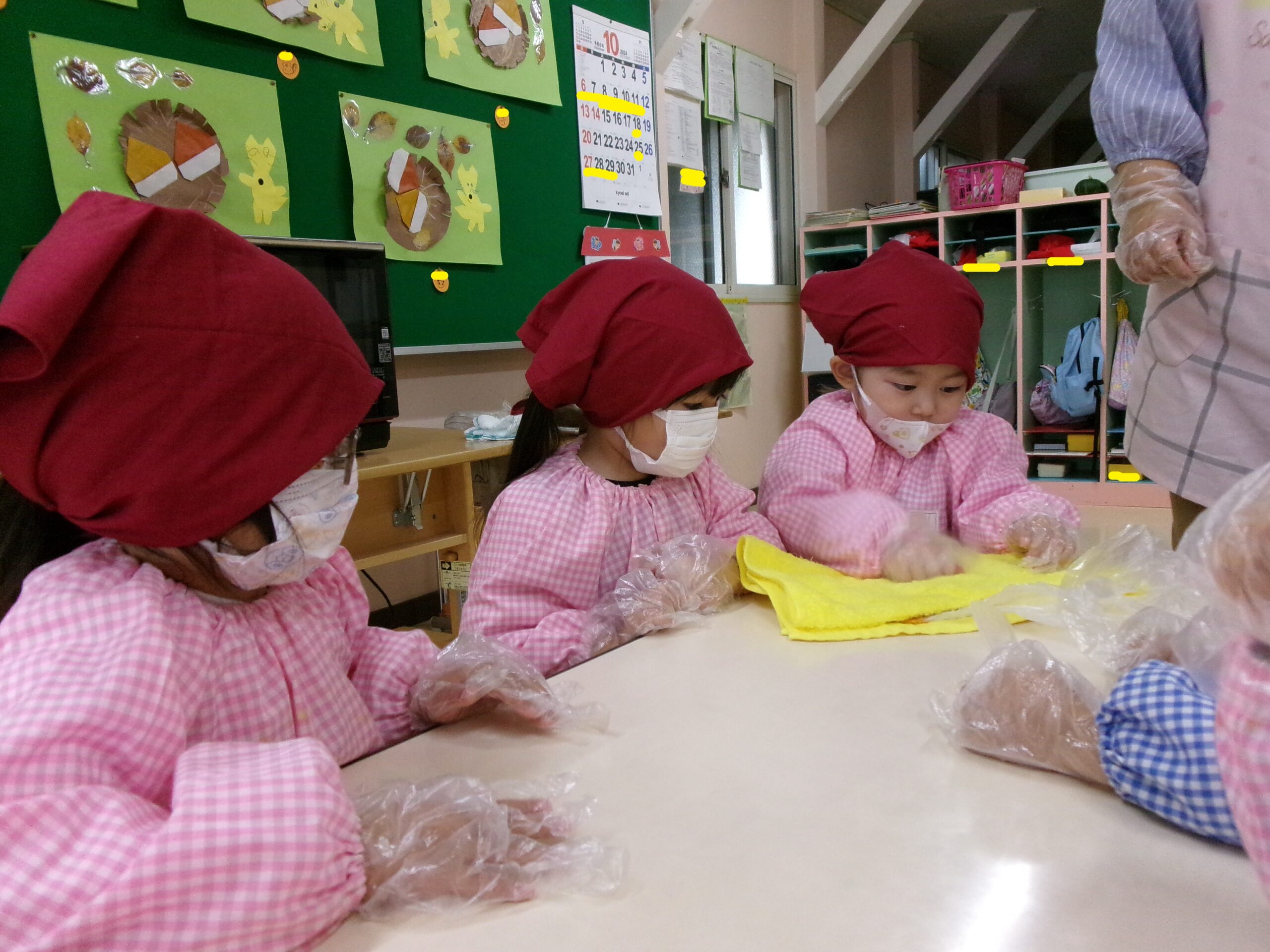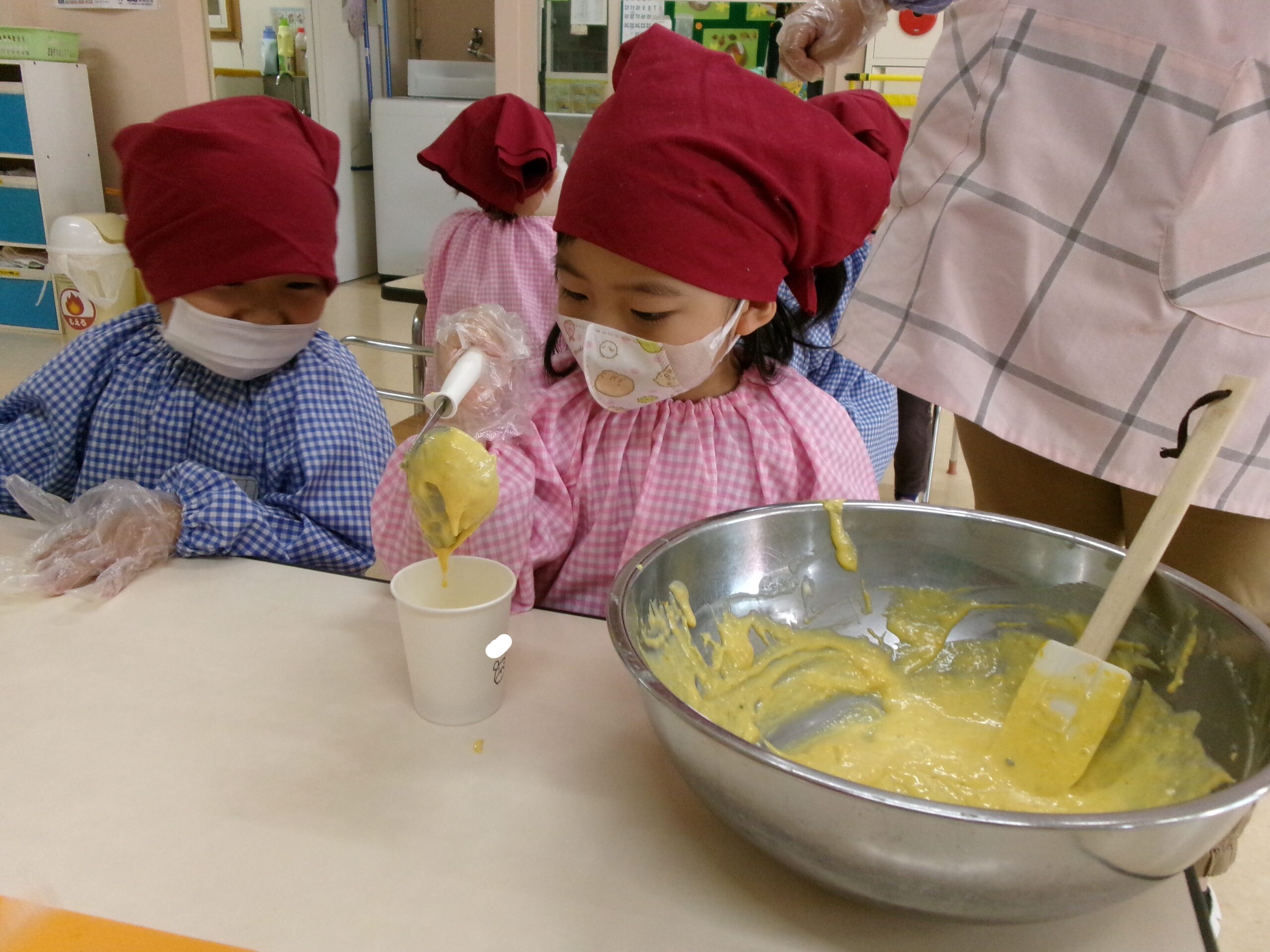 ハッピー畑で収穫したかぼちゃを使って、うさぎ組のお友だちとクッキングをしました。