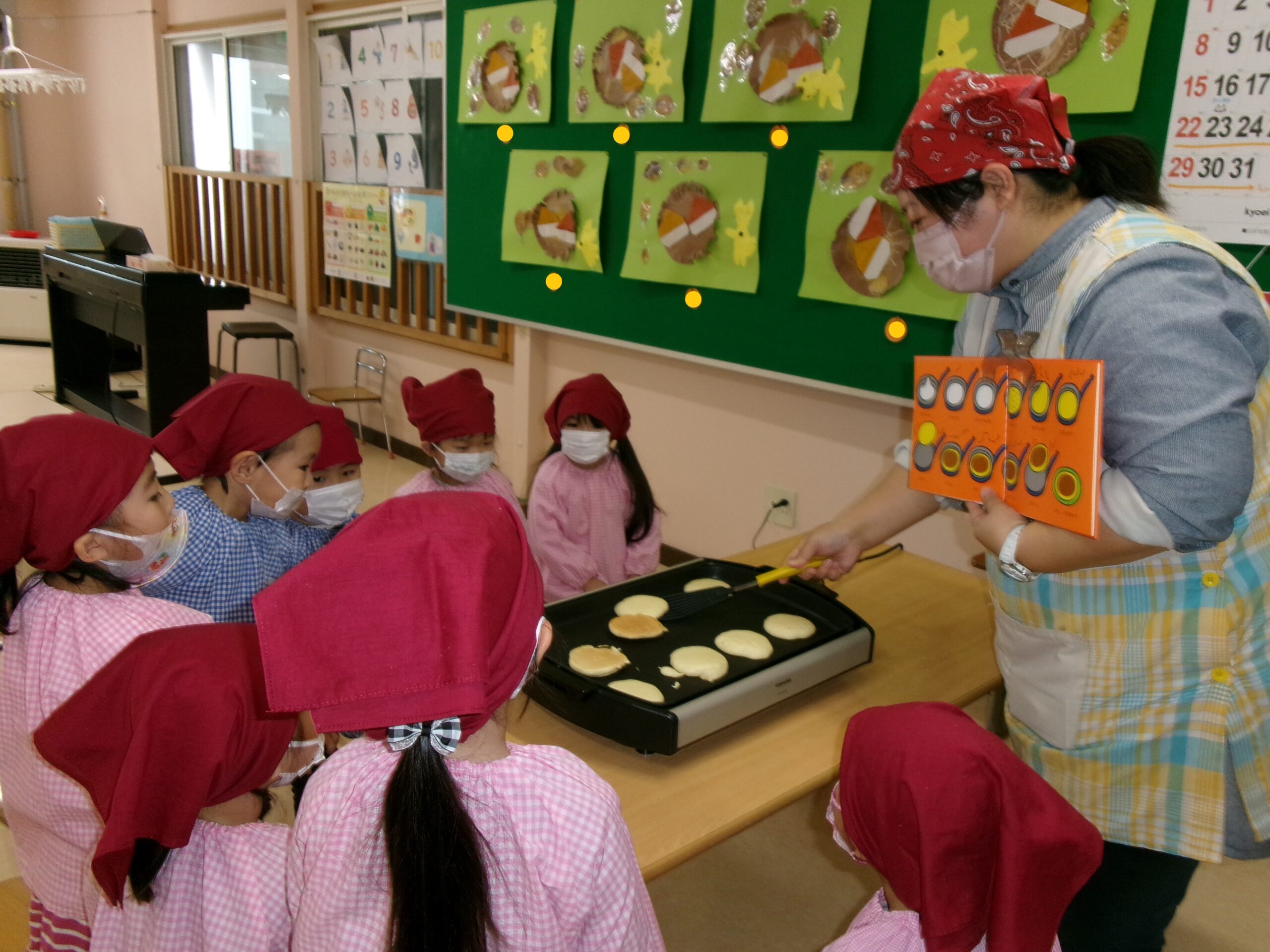 『しろくまちゃんのホットケーキ』の絵本を見本に、焼き加減を確認しました。