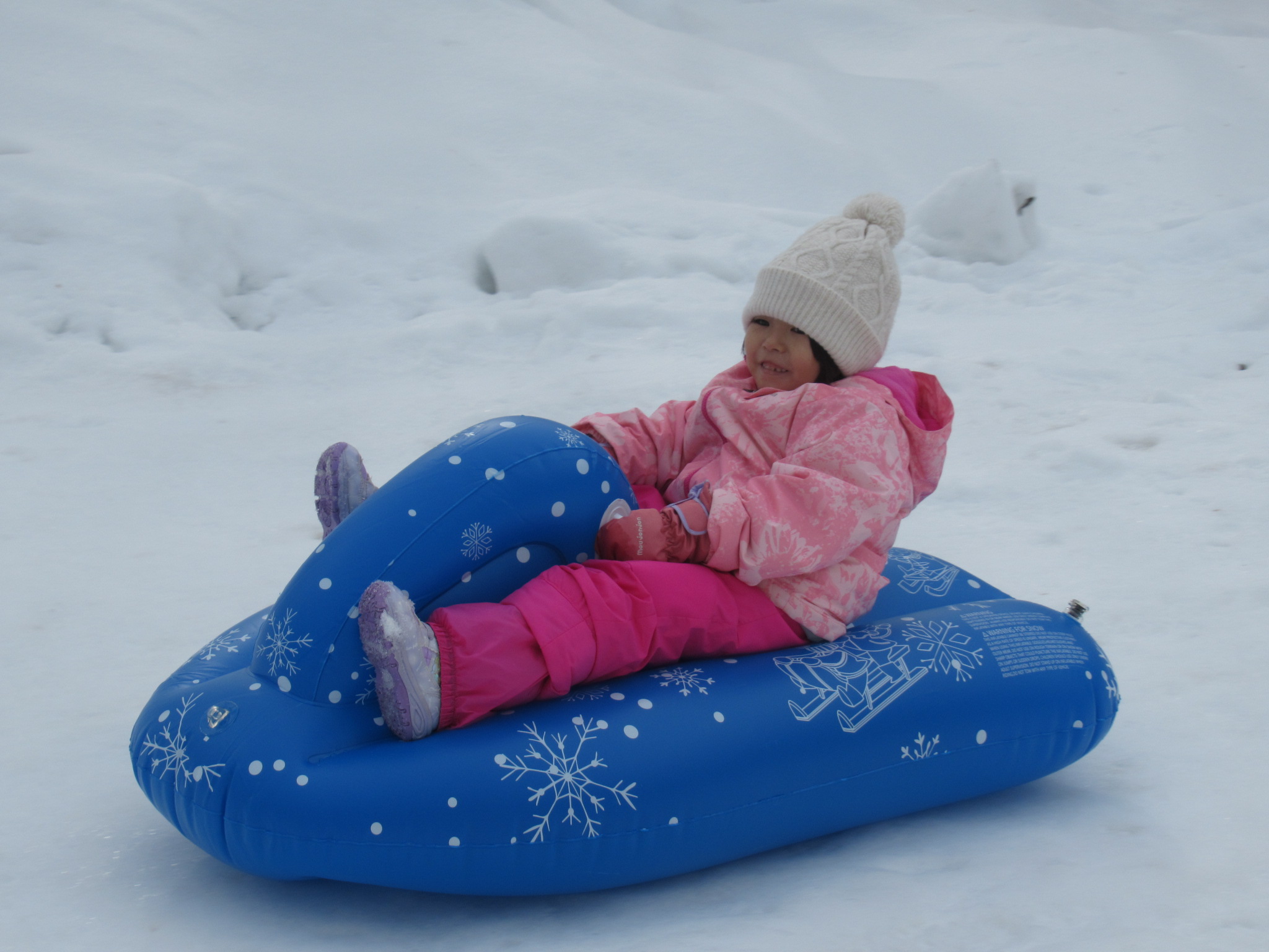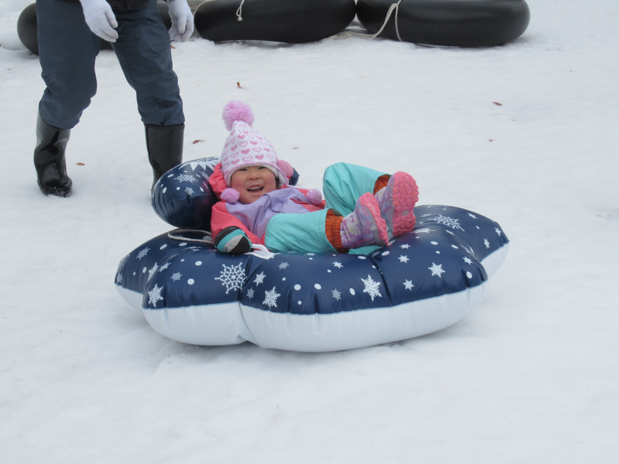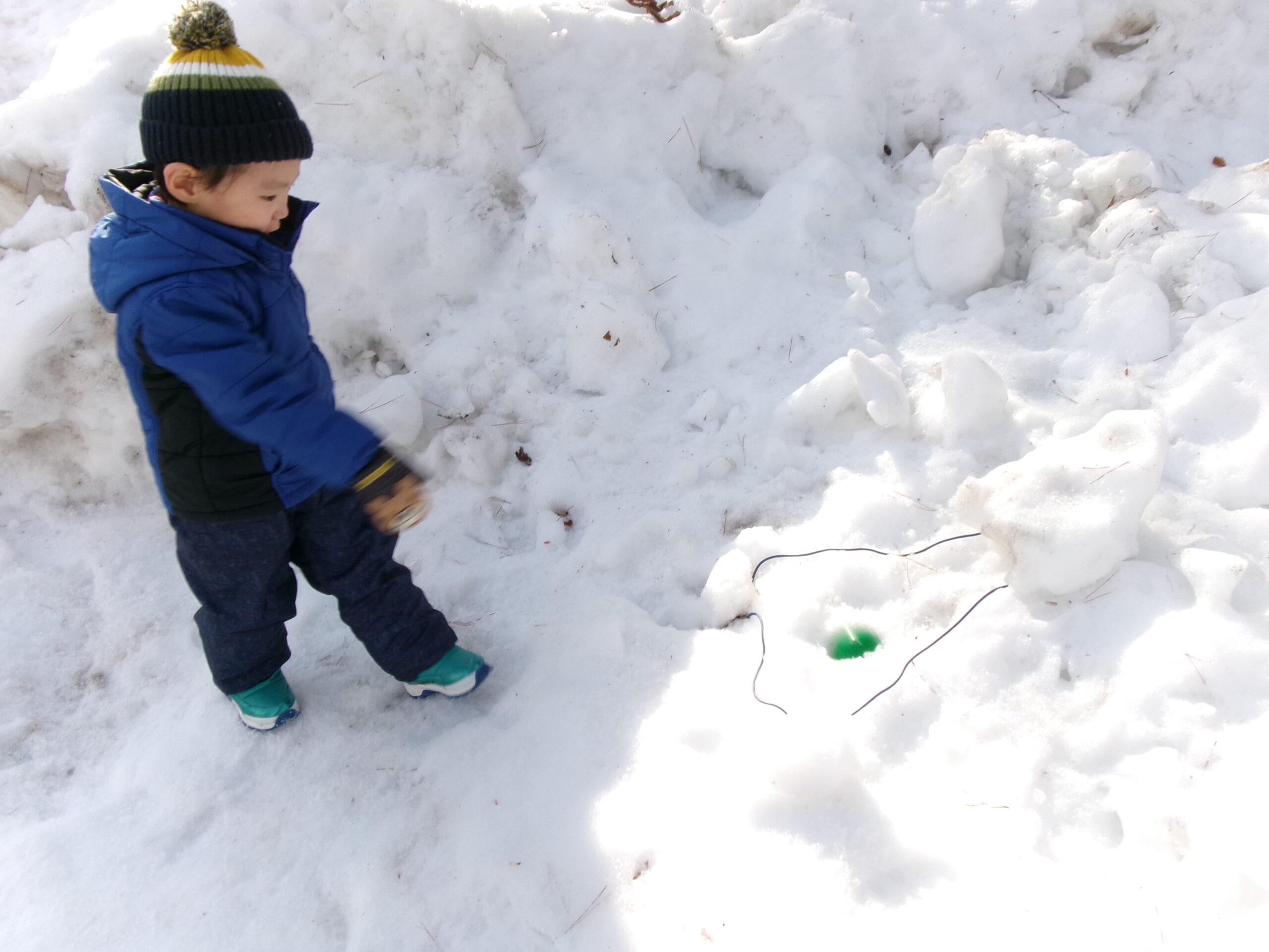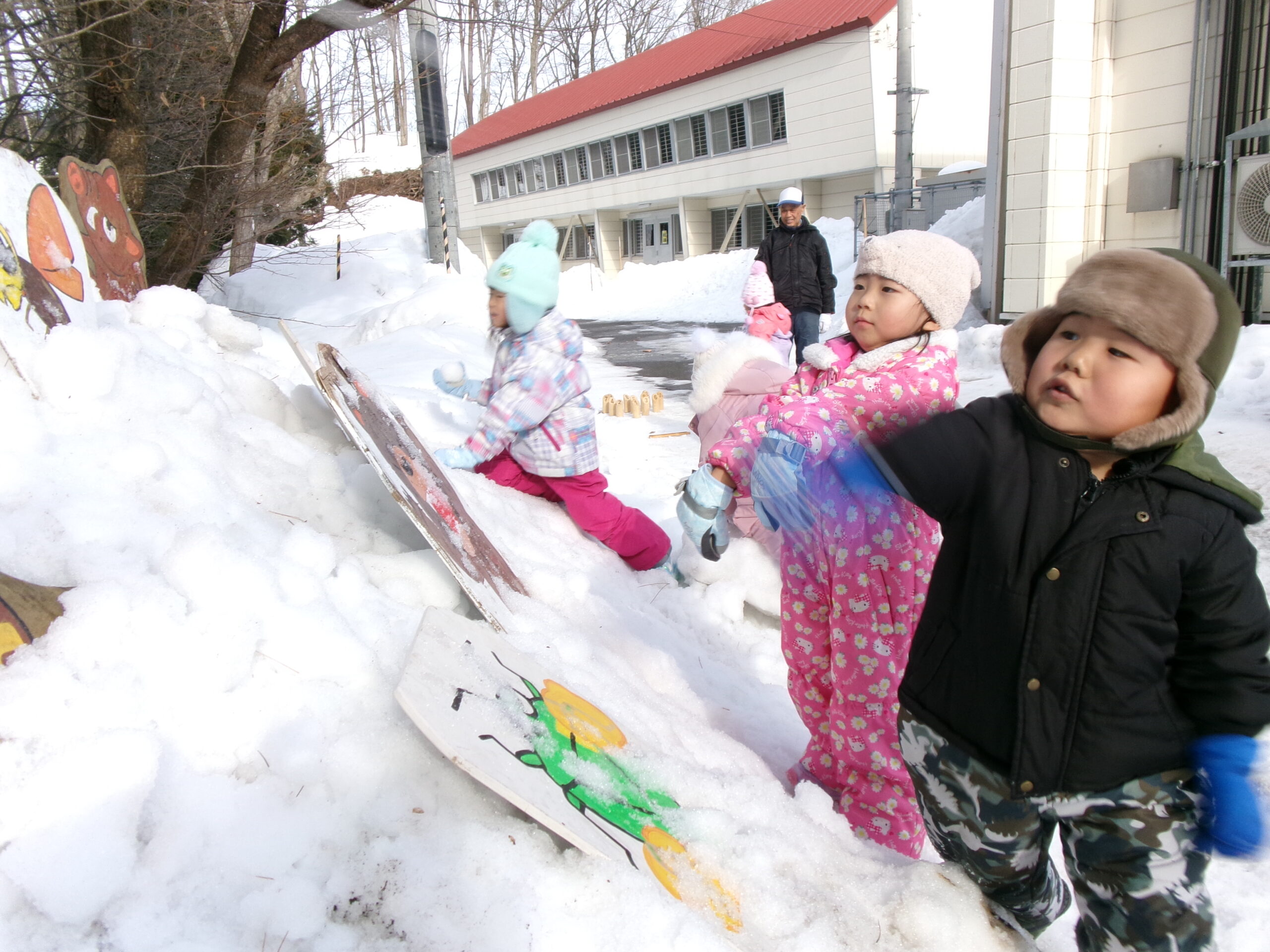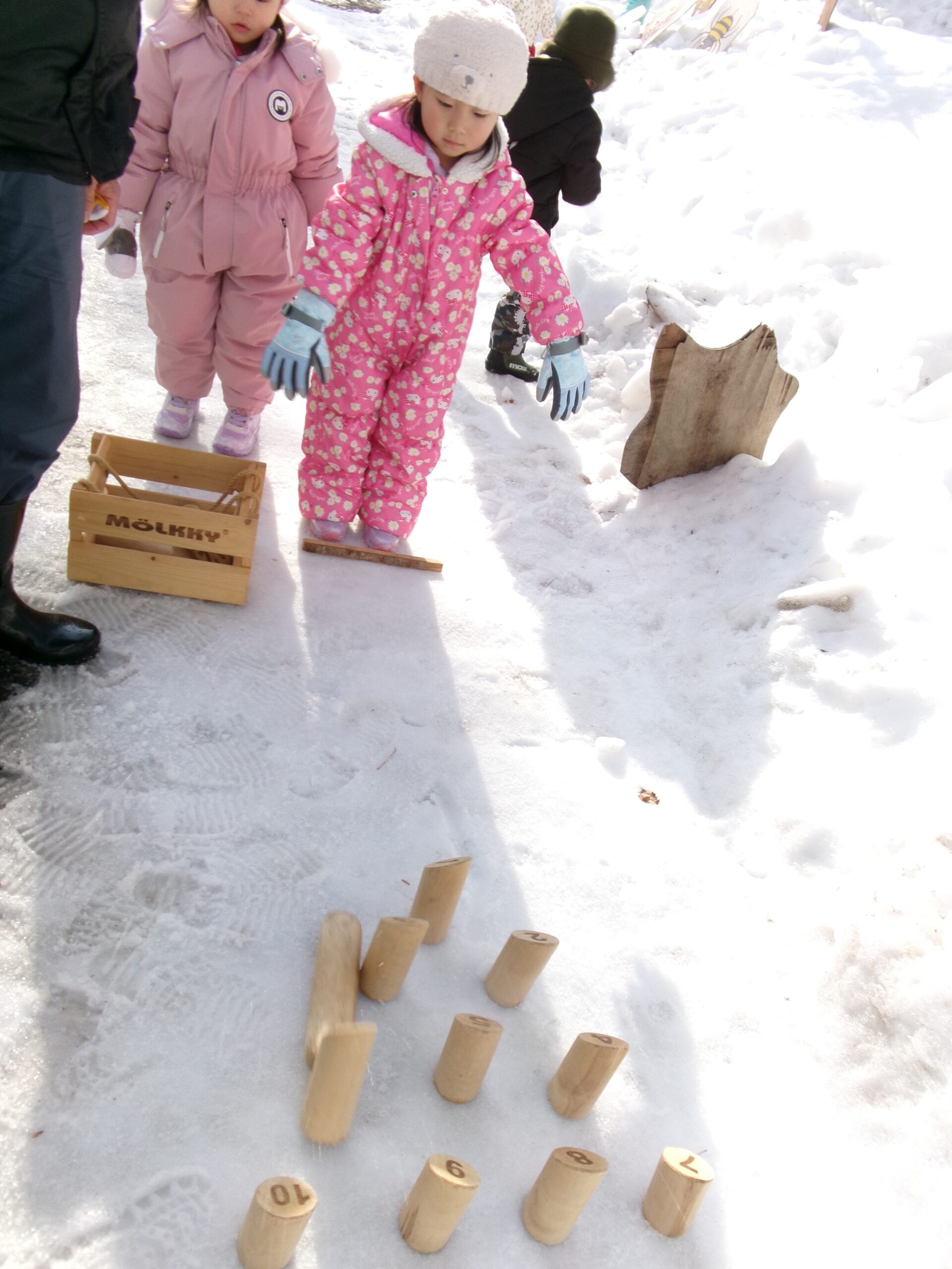 🐣スノーランド遊び🛷⛄ 先週、梵珠少年自然の家にある『スノーランド遊び』に行ってきました。 とても天気が良く、みんな楽しく遊べましたよ。 三角の枠の中にボールを入れる遊び モルックという、木を倒すゲーム 動物などの絵に雪玉を当てる遊びは、的が倒れるまで投げましたよ。 そしてお待ちかねのソリ遊び! 大きなチューブソリを持って坂を上るのは大変そうでしたが、 歓声を上げながらみんな何回も楽しんでいました。 帰るとき「明日も行きたい!」と話す子もいて、大満足なひよこ組さんでした。