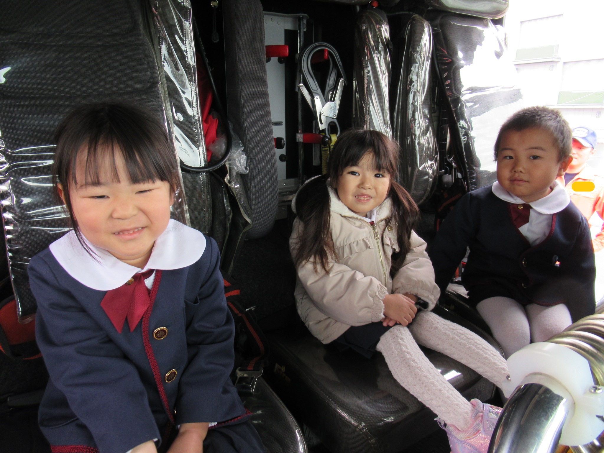 緊急時に使用する道具を見せてもらったり、消防車の見学、はしご車の椅子に座らせてもらいました。