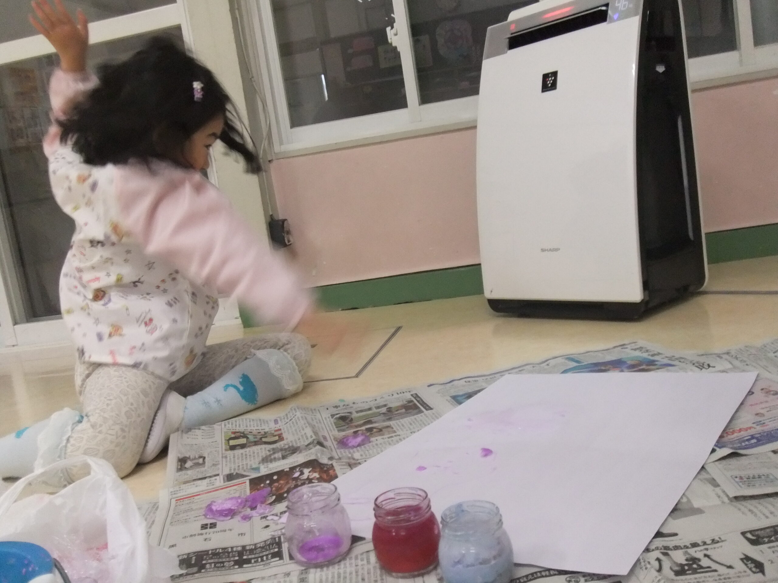 以前から戸外で絵具を使って作っていたスイーツが、氷になっていたので、氷のクレヨンとしてお絵描きをして楽しみました。