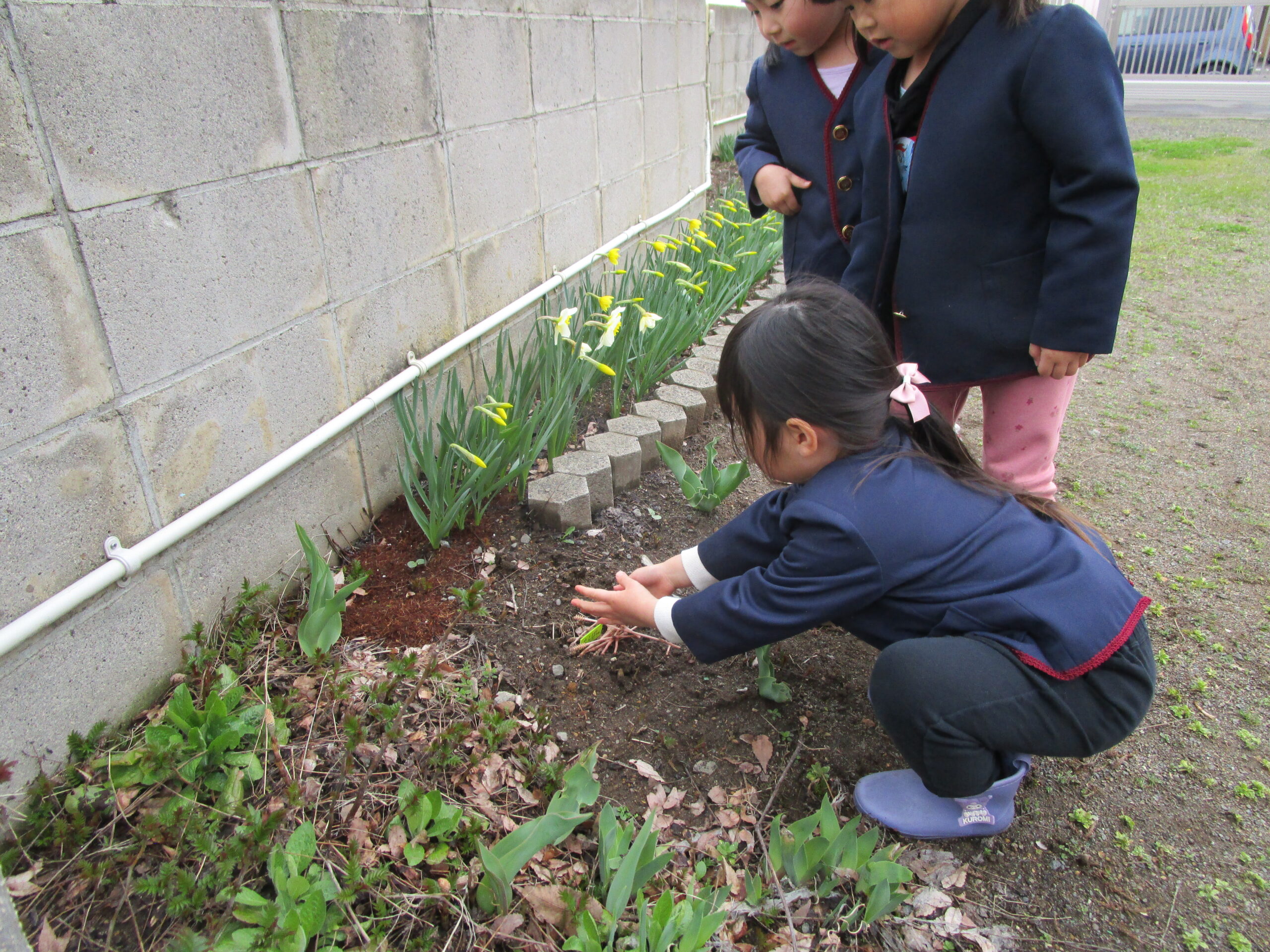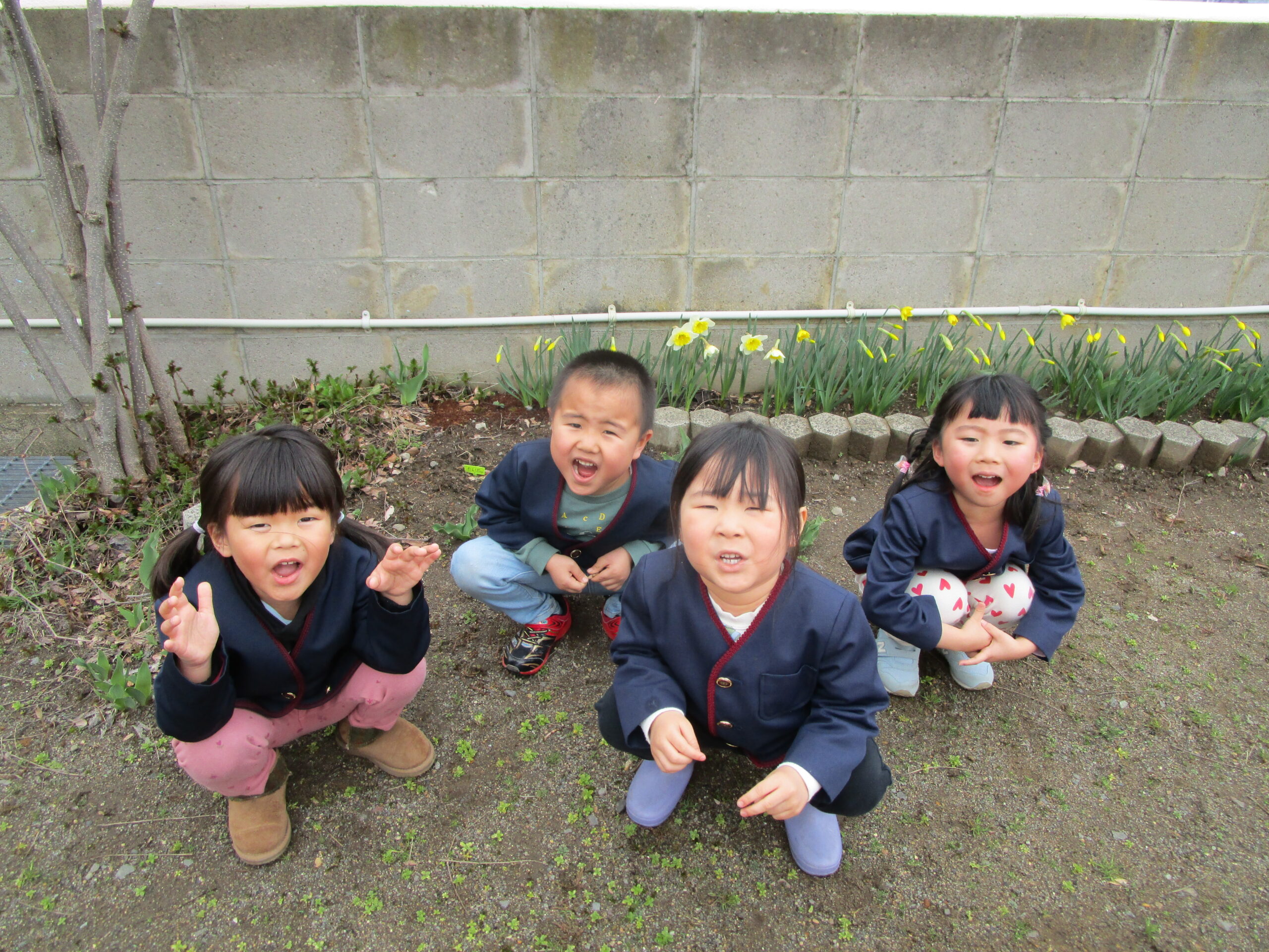 花壇のスイセンもにこにこ笑って子ども達を見ているようです😊✨