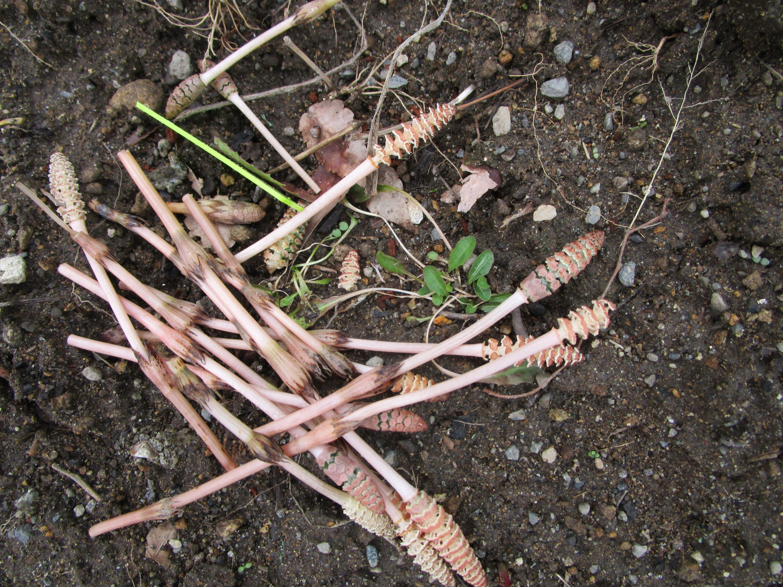 つくしの間から見える緑色の葉っぱがたんぽぽのたんぽちゃんです。