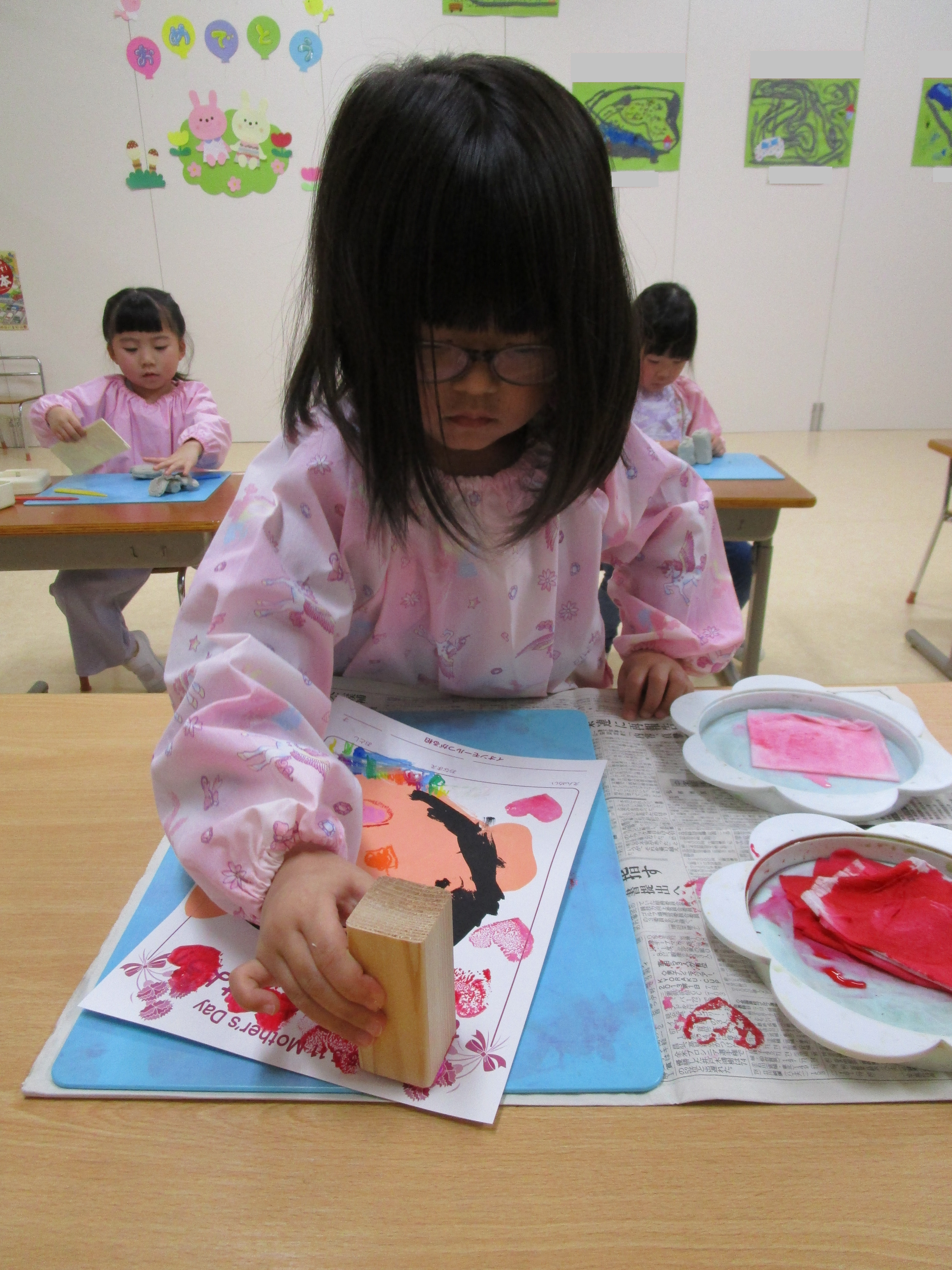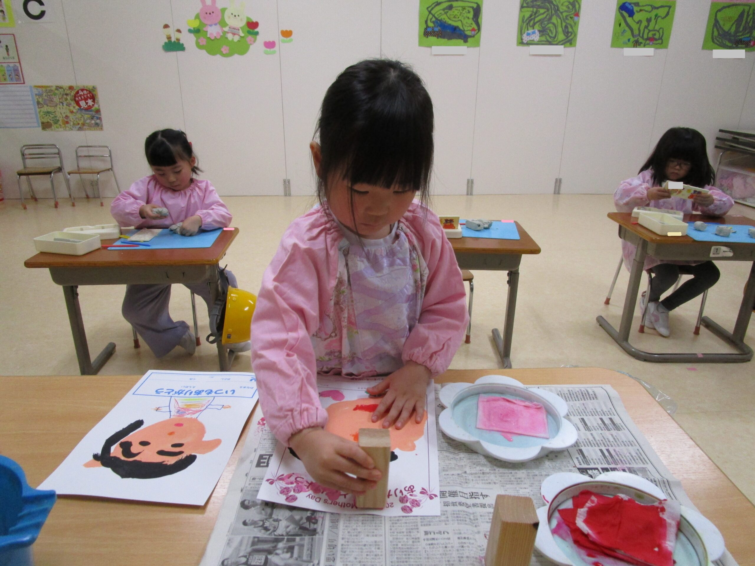 母の日の似顔絵展に向けて、お母さんの絵を描き、お花やハートのスタンプで飾りつけしている様子です。