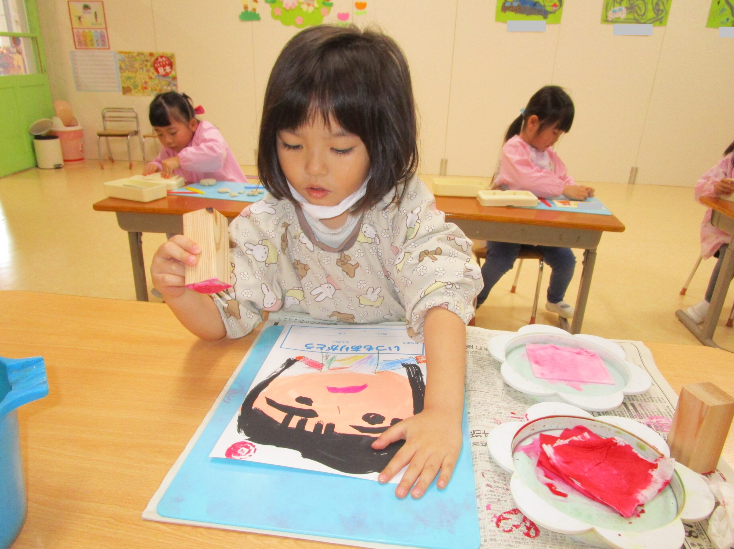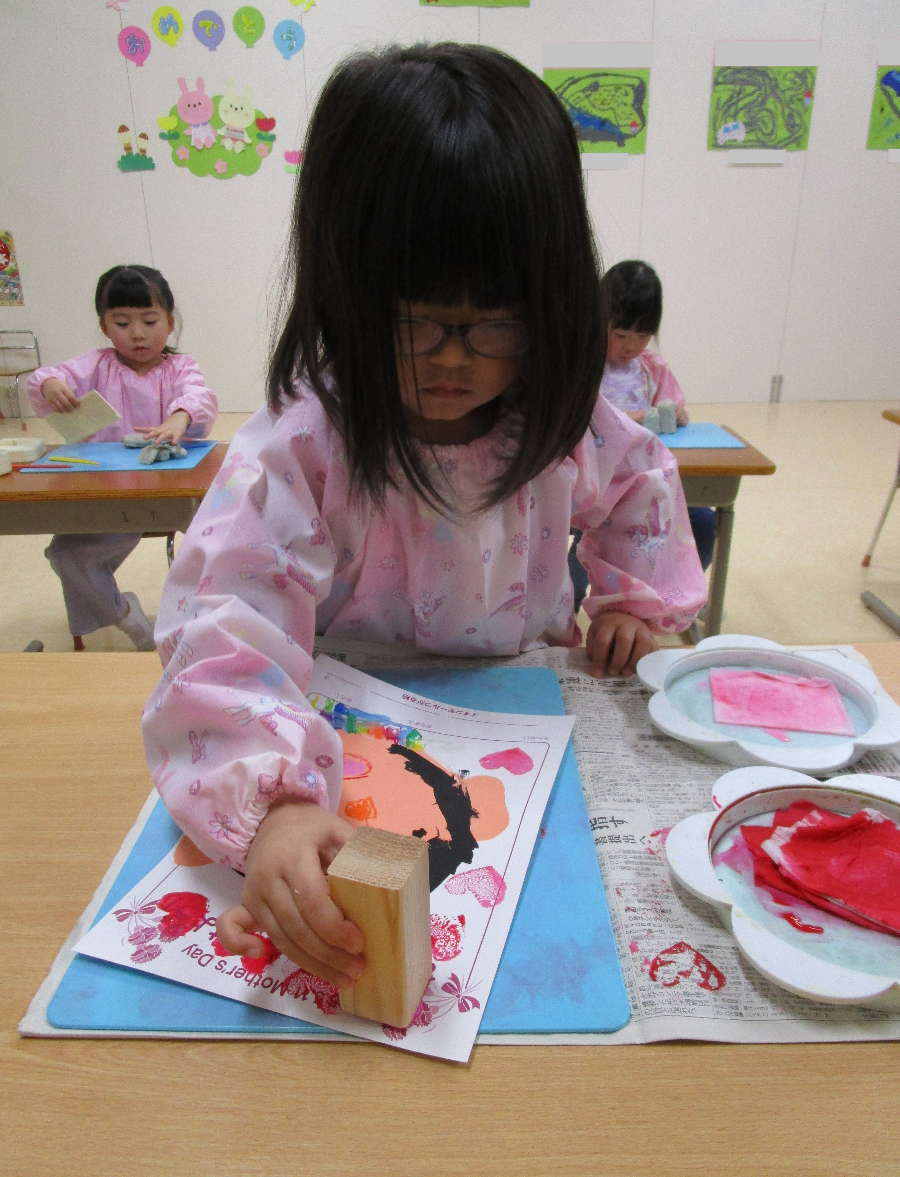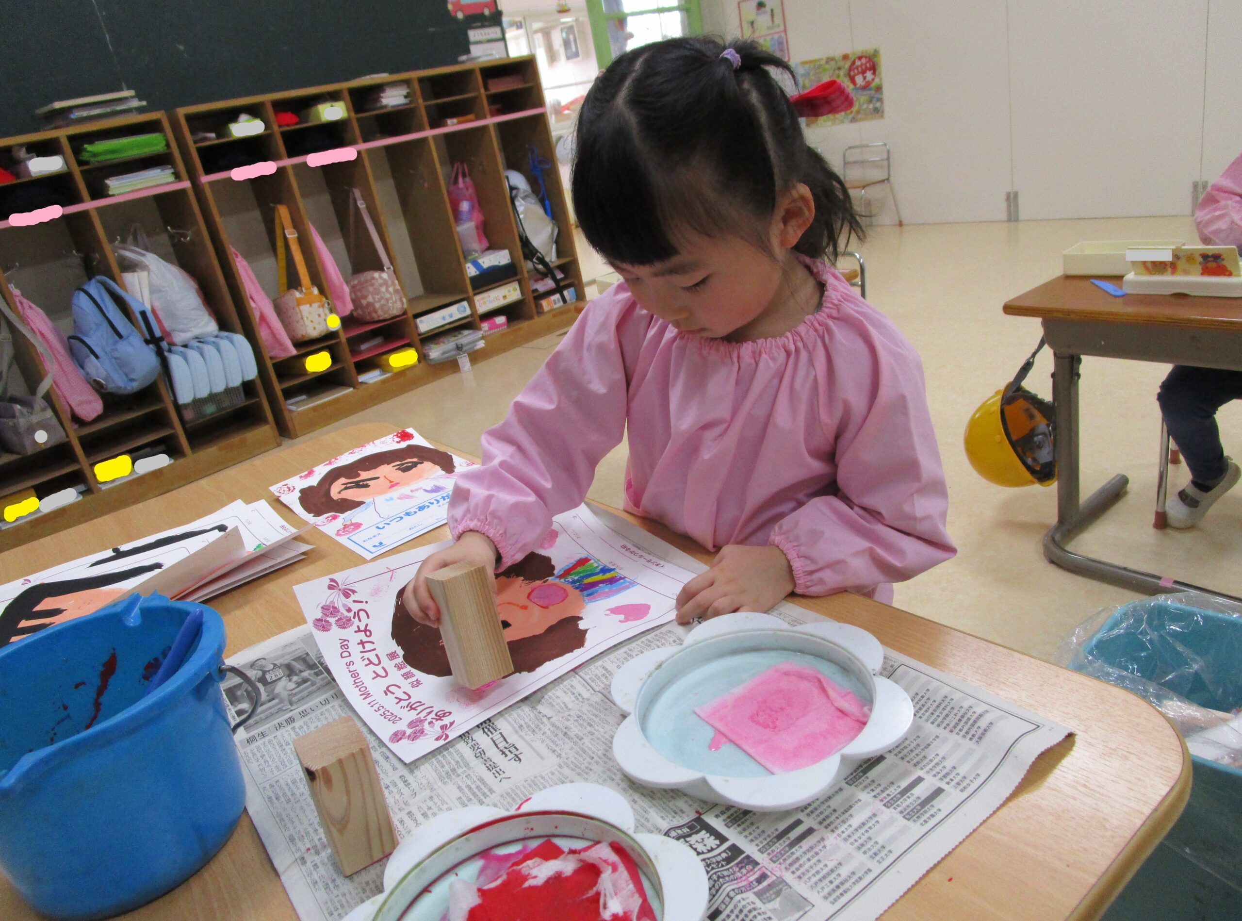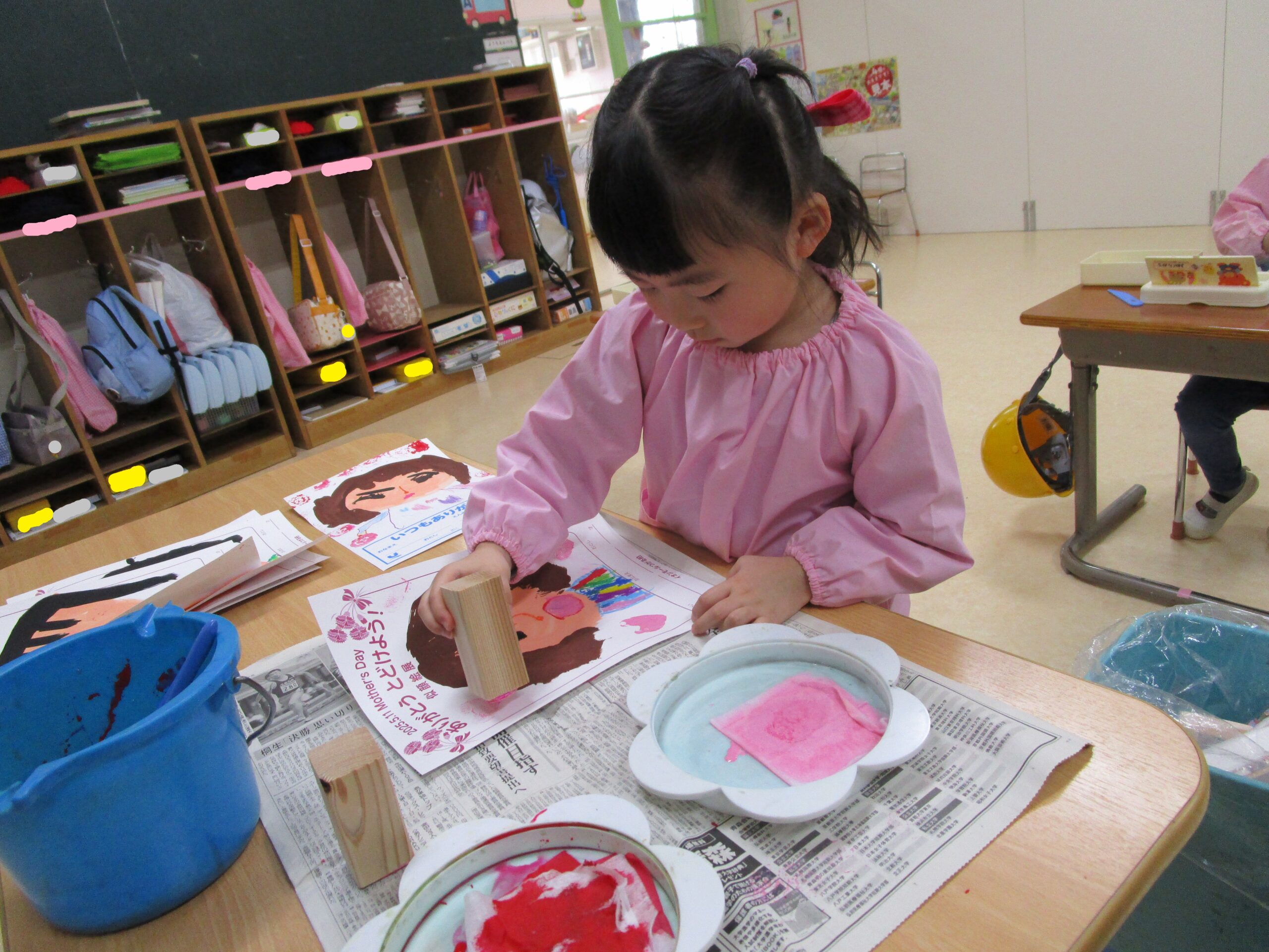 かわいく描けたお母さんのお顔の周りにお花の形やハートの形のスタンプを押している様子です。