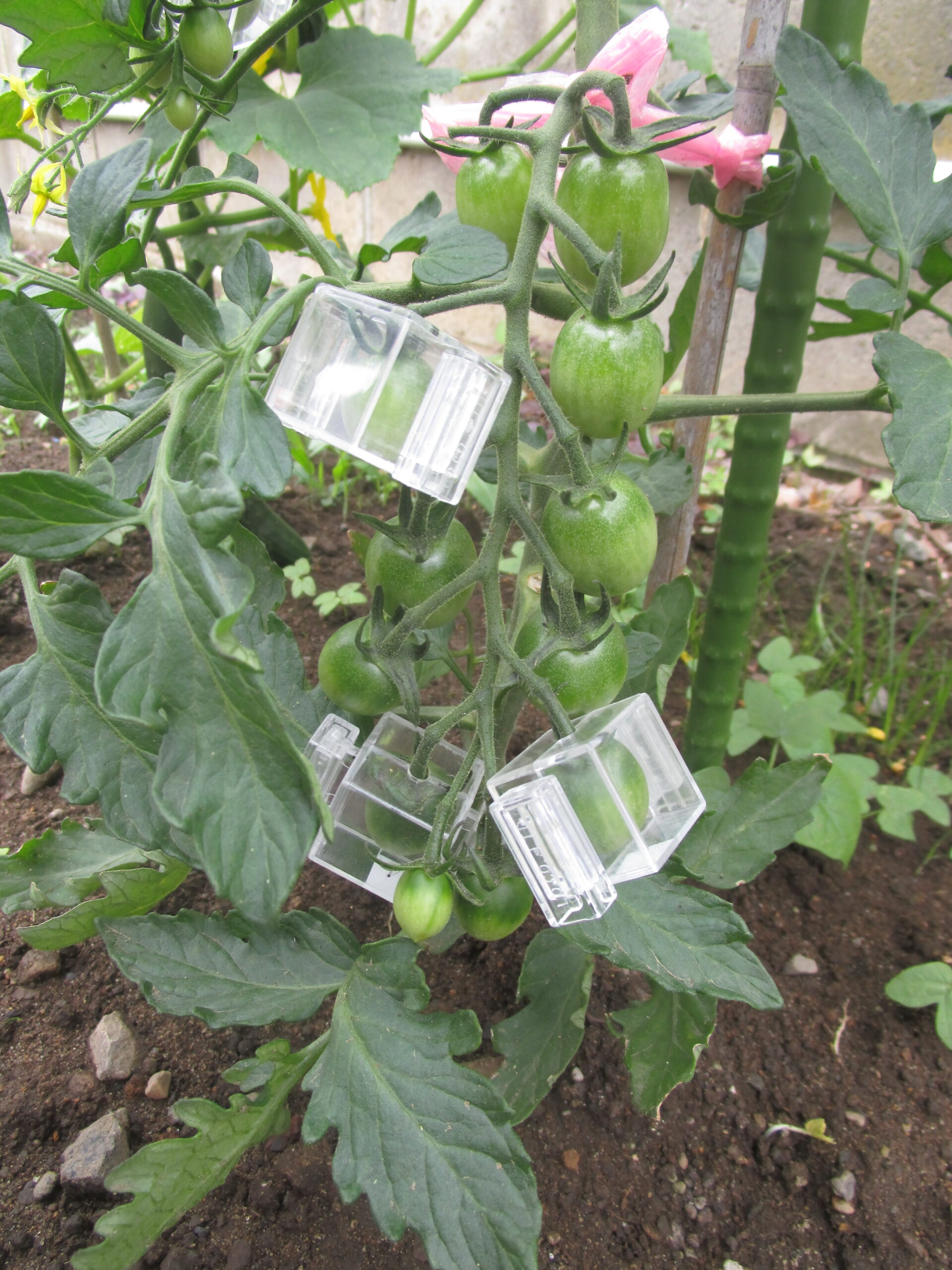 まだ小さい実に四角いケースを取り付け、四角いミニトマトを作ってみようということになりました。
