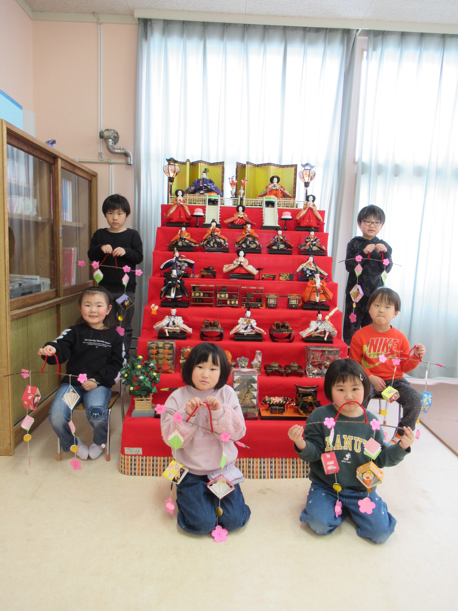 ひな祭りお誕生会で飾った、手作りの雛飾りを持って記念の写真を撮りました。