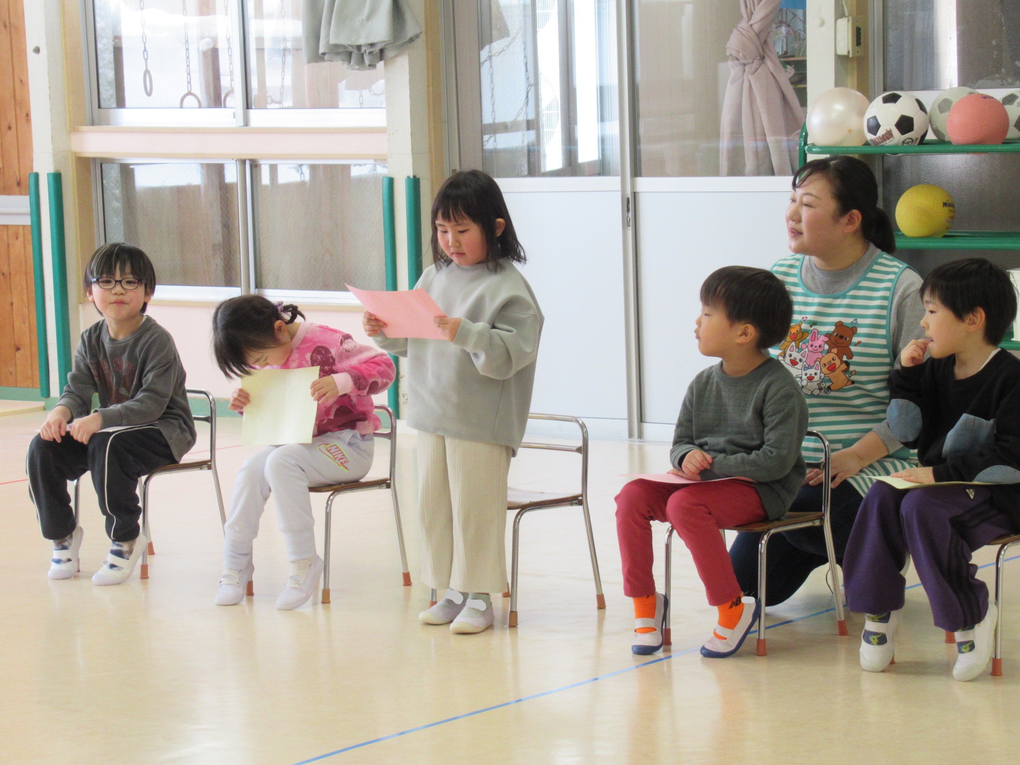 はと組の活動内容は、運動発表とドッチボールとおうちの人への感謝のメッセージを読むことでした。
