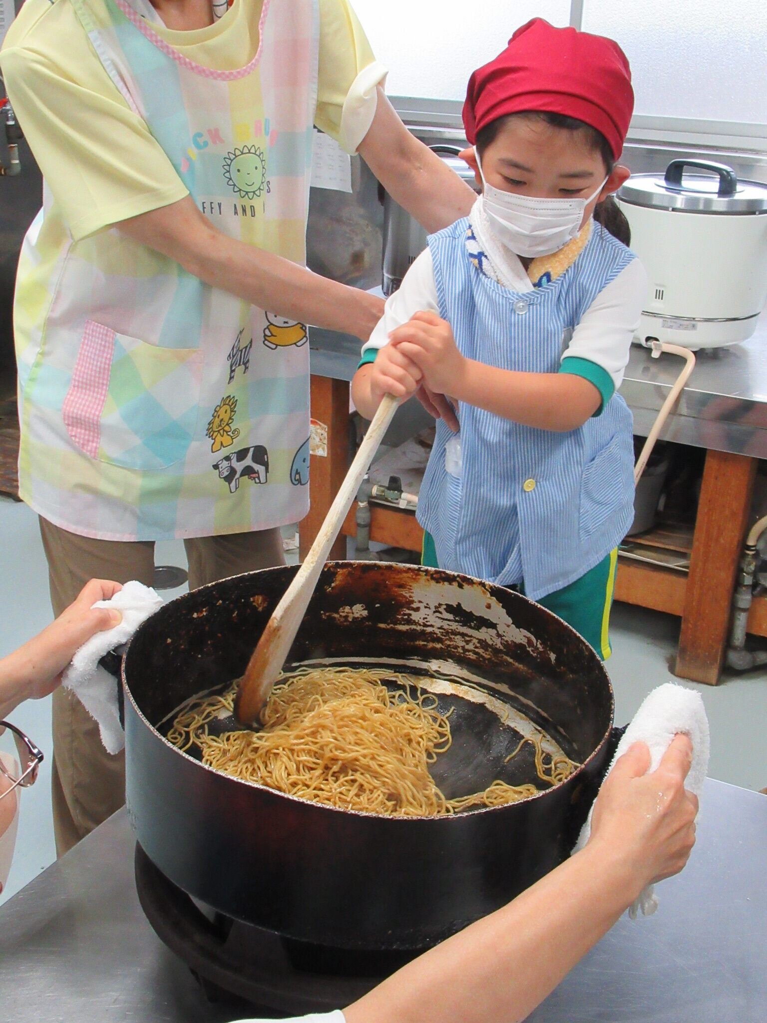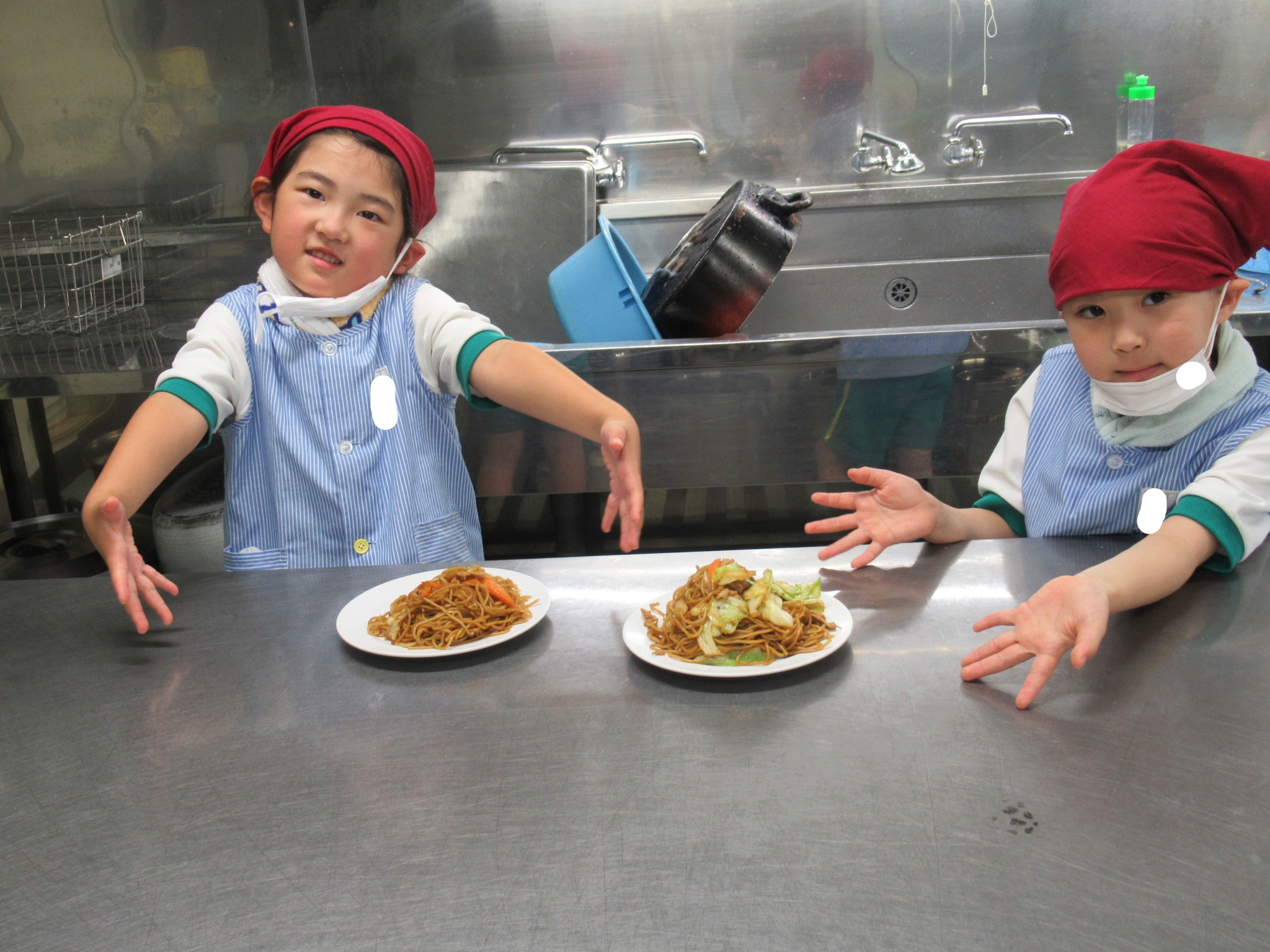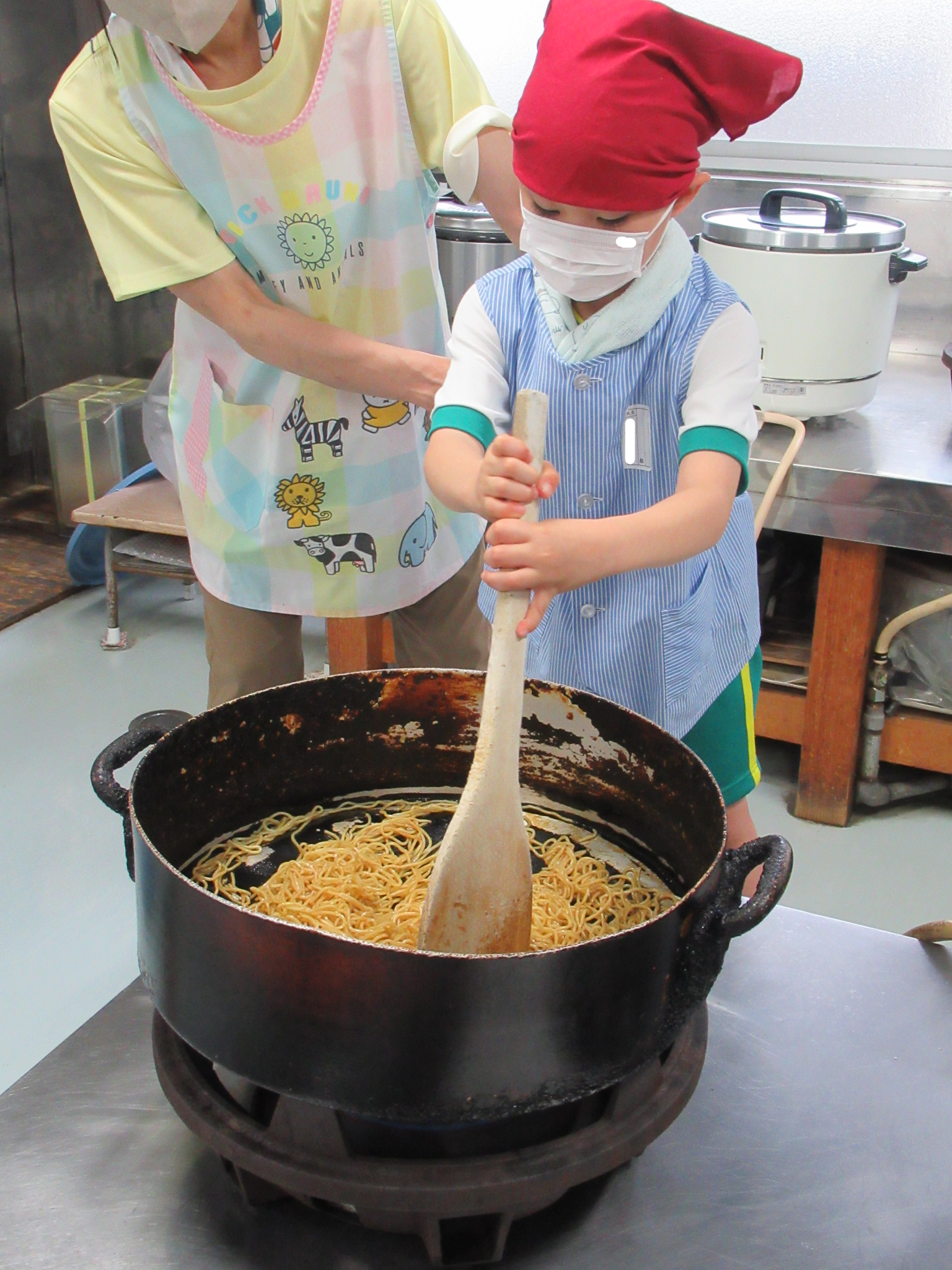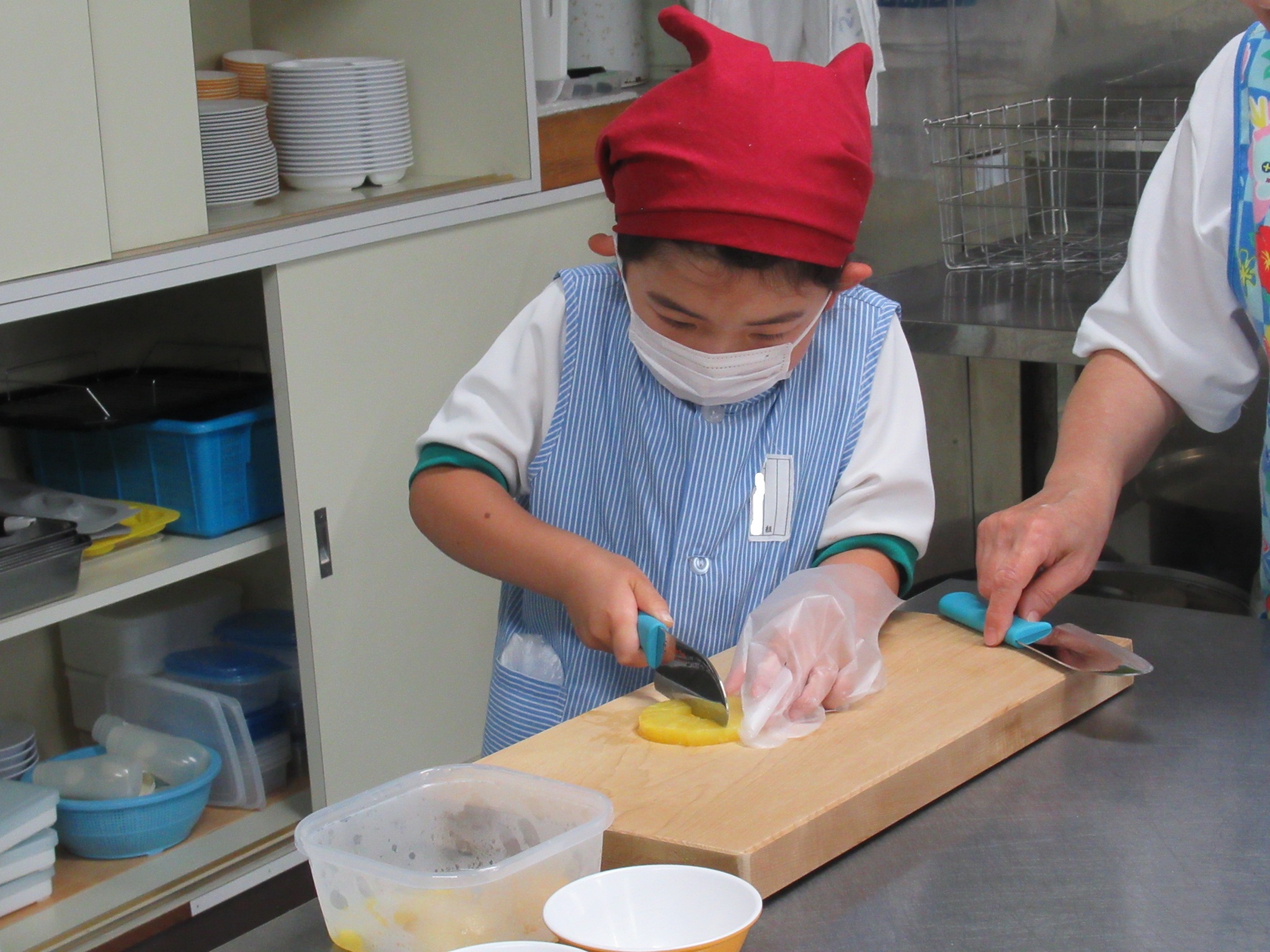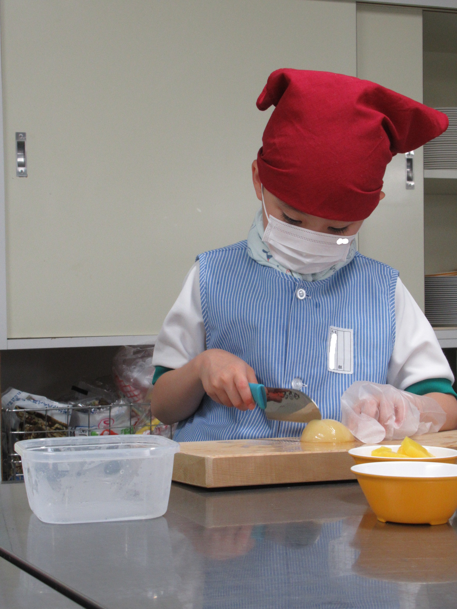 6番目は、園に戻って「給食室で夕食作りと片づけ体験」