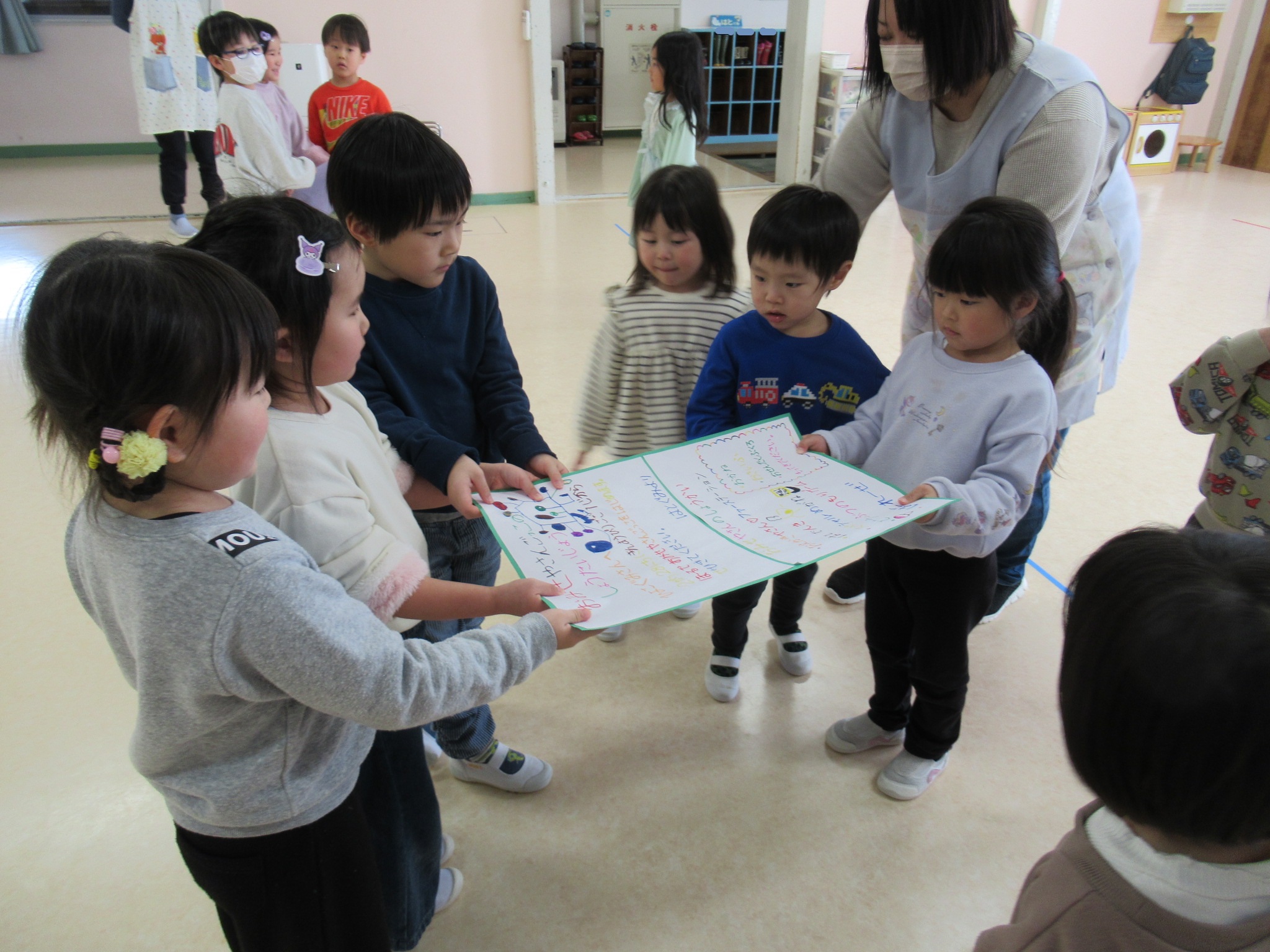 ひよこ組さんとうさぎ組さんにお店屋さんごっこの招待状を渡しました。