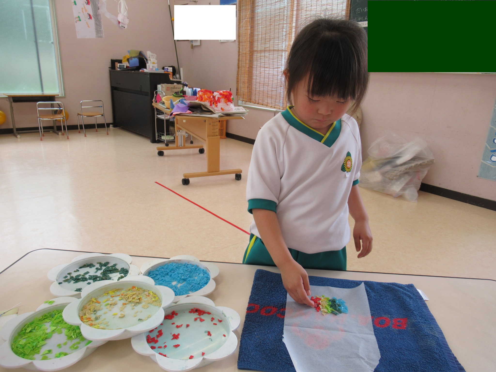 ペットボトルのふたの色を選び、少しずつクッキングペーパーに挟んでいます。