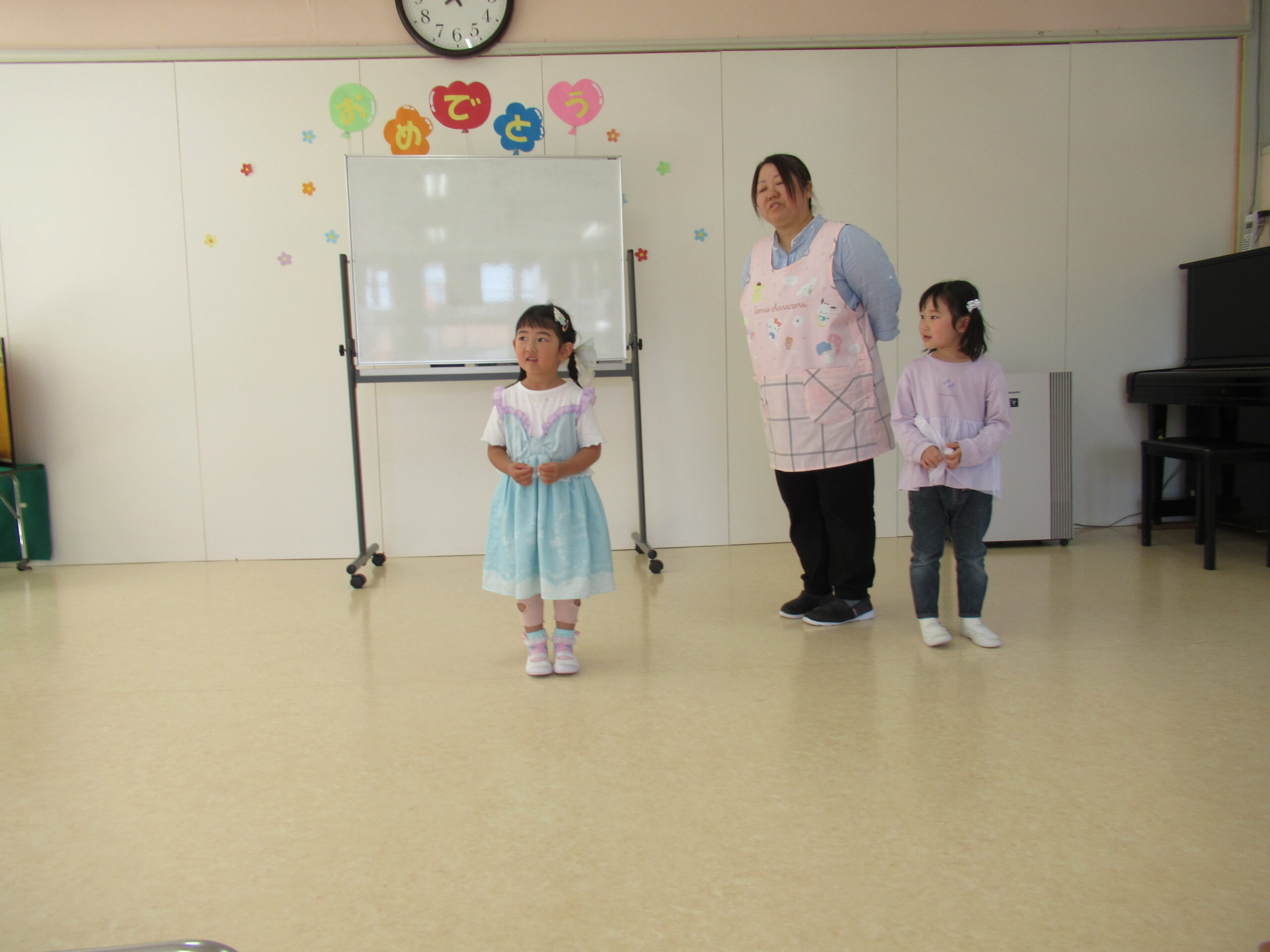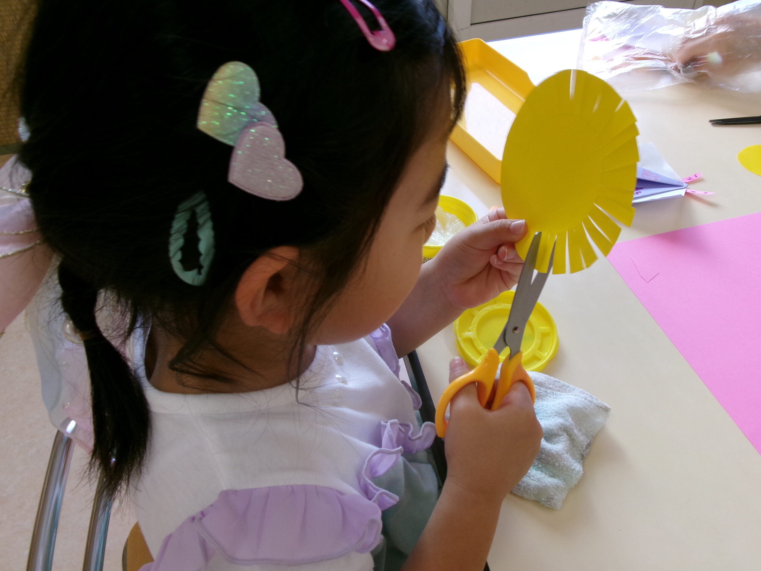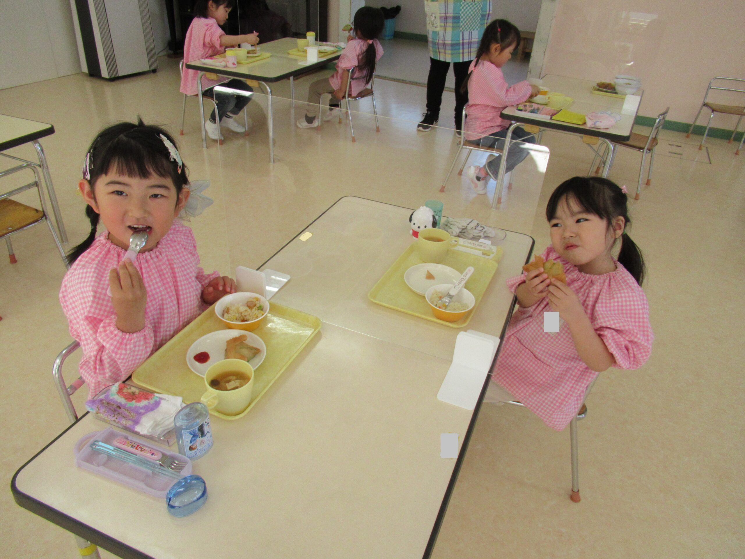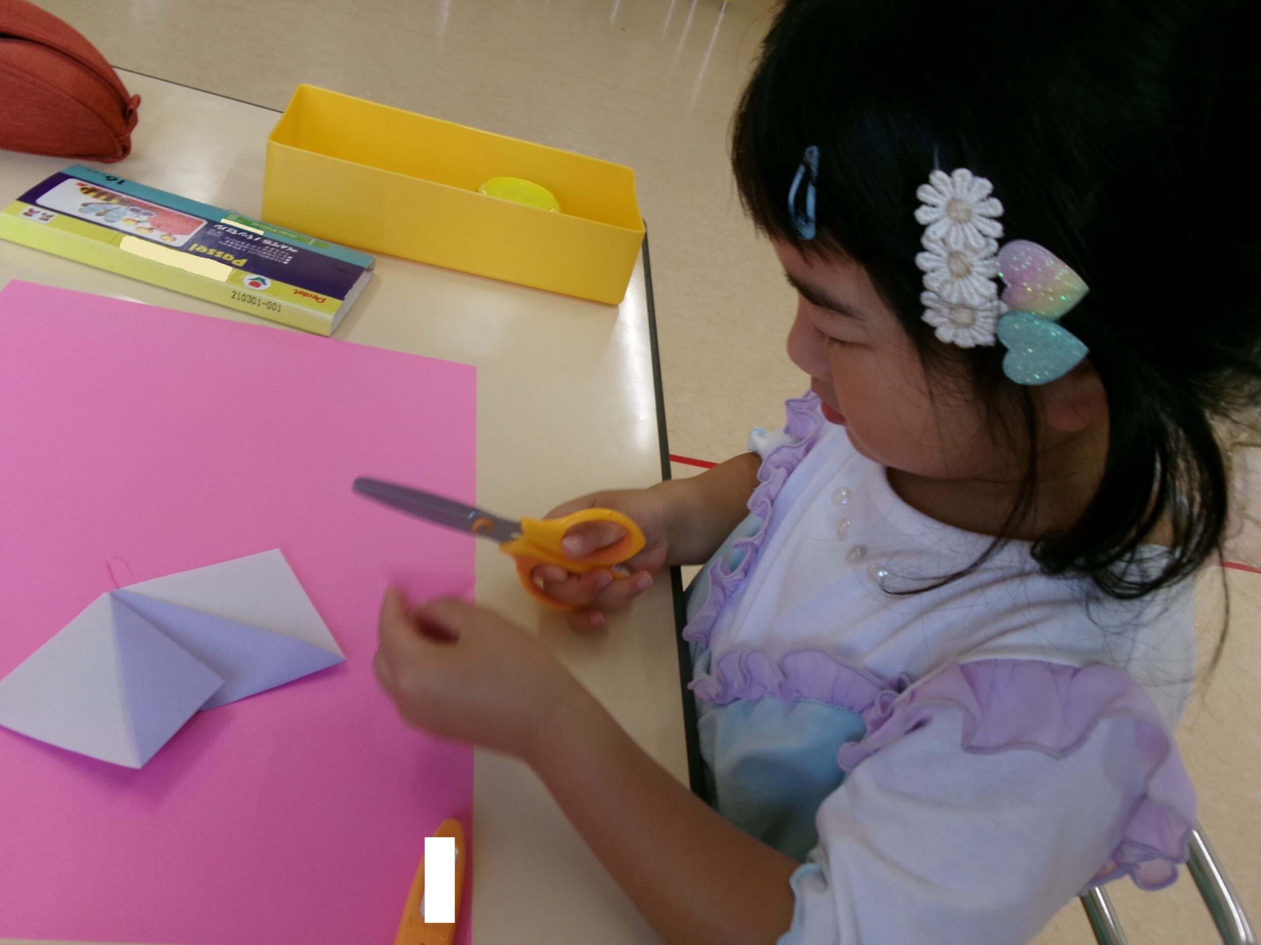 🦋折り紙製作と🎏こどもの日のお祝い会🐇 4月の折り紙製作「ちょうちょとたんぽぽ」を作っているところです。 真剣なまなざしで、紙を切っていますね。 こどもの日のお祝い会🎏 製作発表と終わりの言葉を元気な声で言いましたよ! 会食では、他のクラスのお友だちと一緒に食事をして楽しかったね!