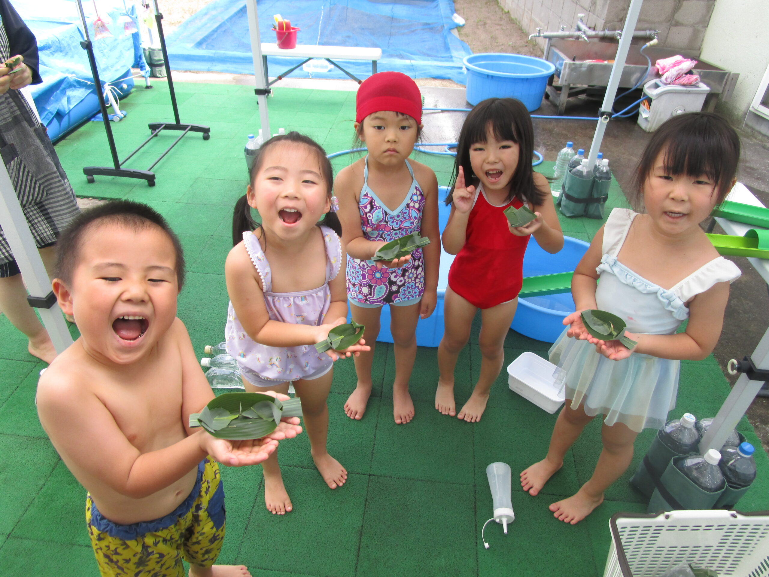 水遊びで笹舟作りにも挑戦しました。