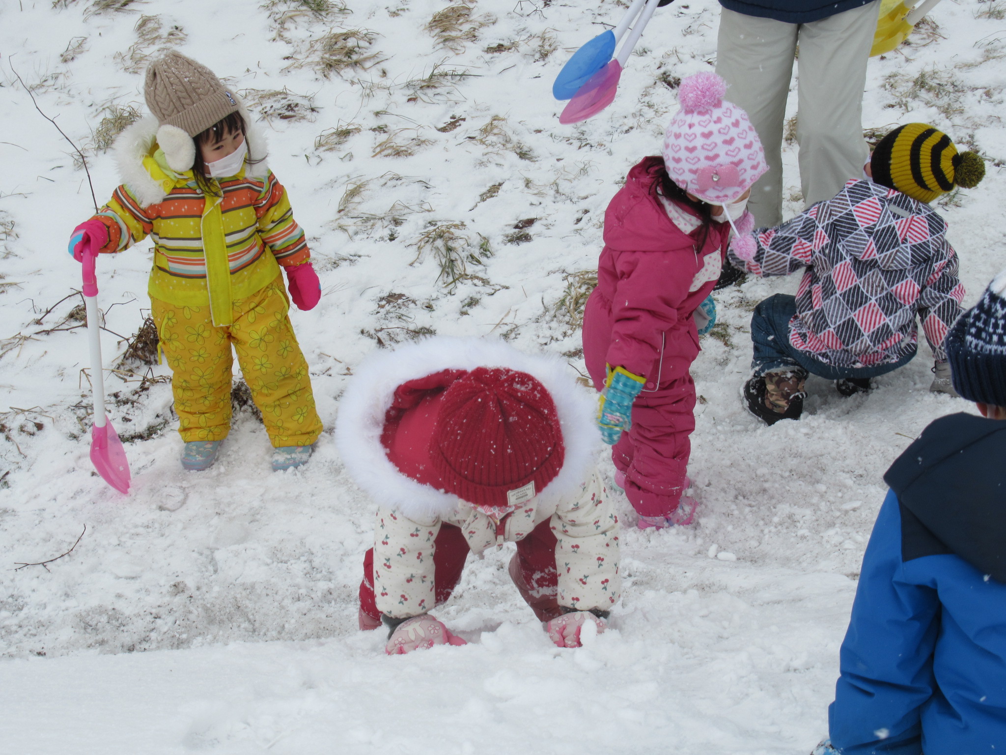 園外では土手でそり遊びやゴロゴロごっこ、スコップで穴掘り、