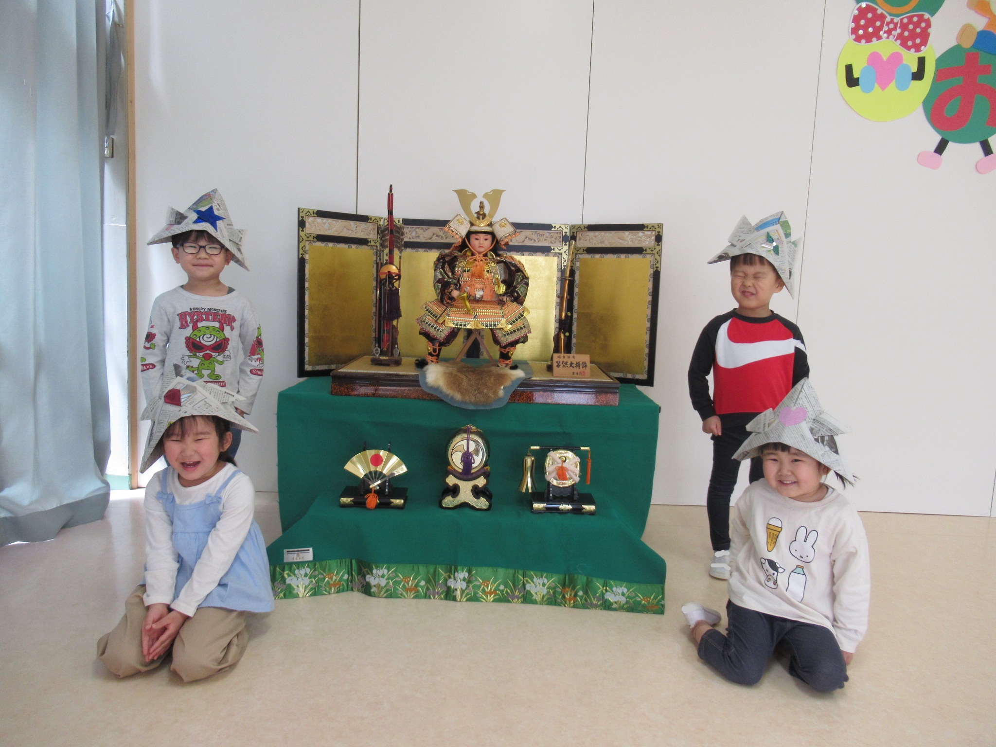 終了後は、五月人形の隣りで新聞紙で作った兜をかぶって
