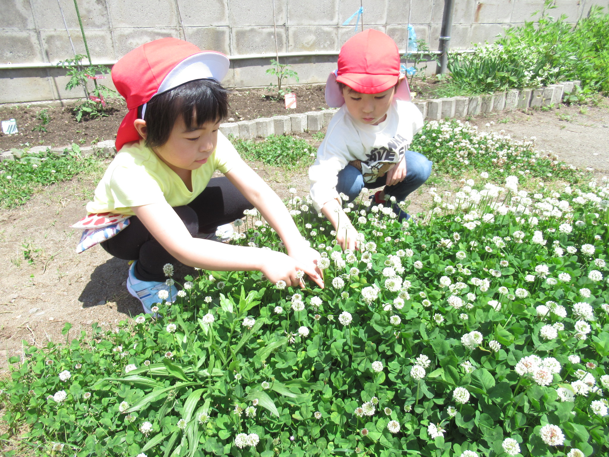 お外遊びでは、四つ葉のクローバー探しや、虫取り、すべり台やブランコなどの遊具で遊んでいます。