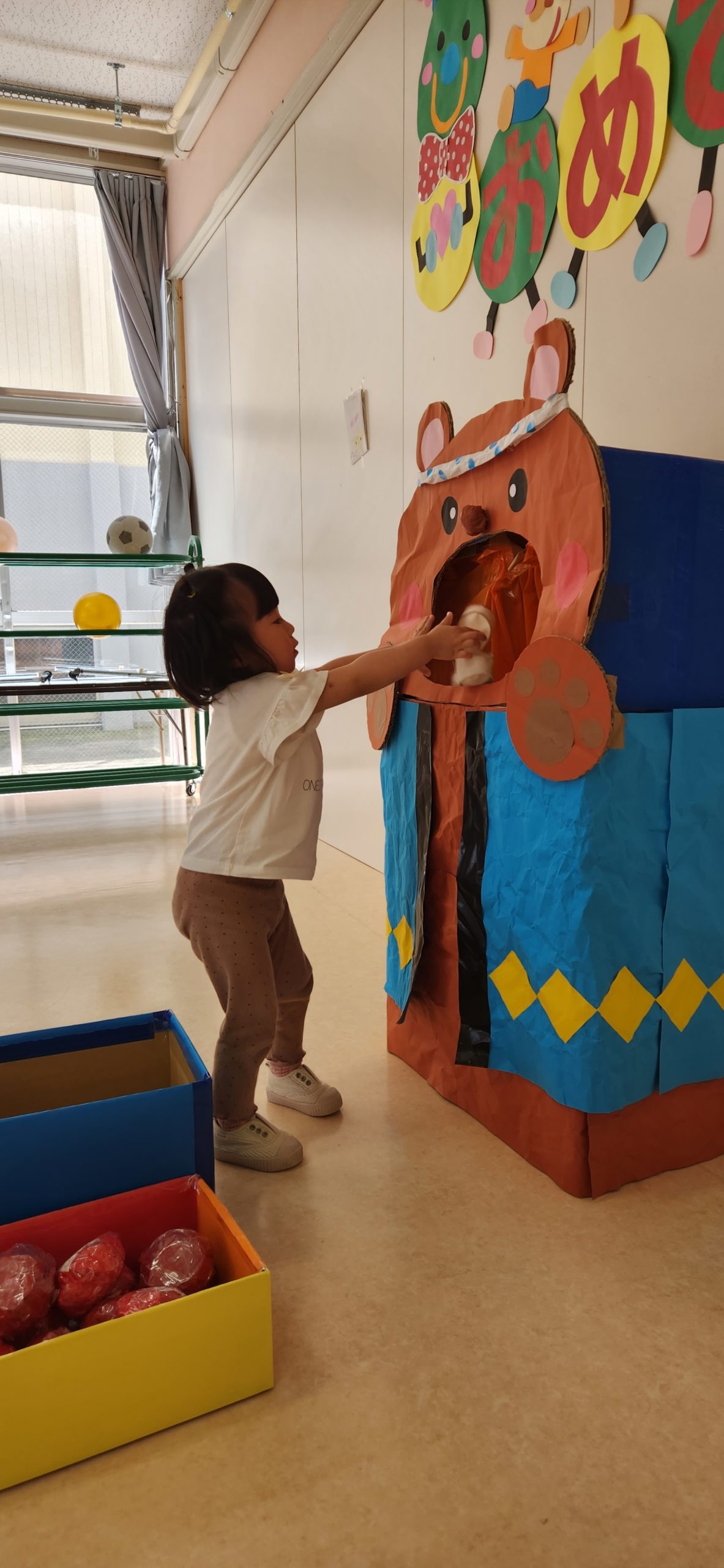 大きなクマさんのお口にリンゴを入れたり🍎