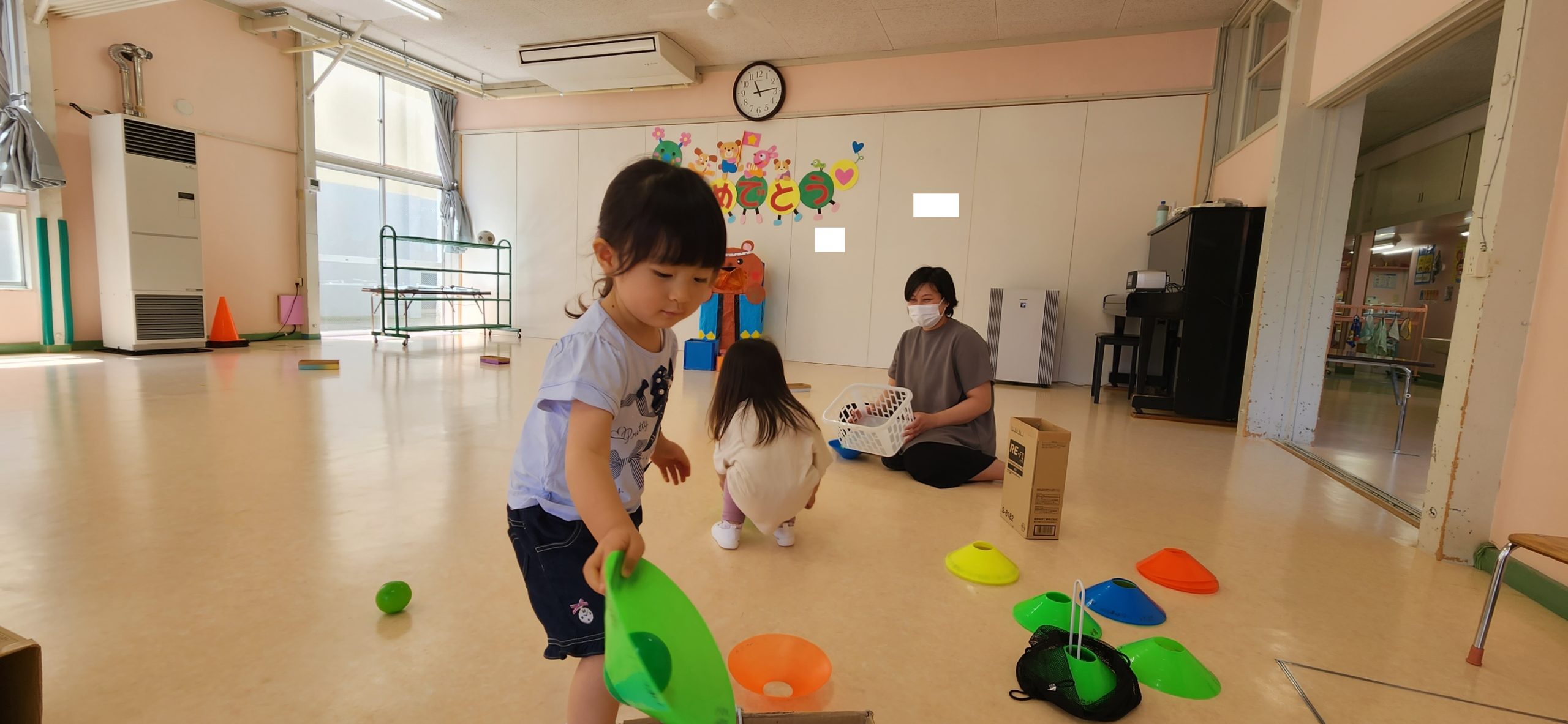 新聞紙で作ったテントに入ってみたり わっかで輪投げをしてみたり~
