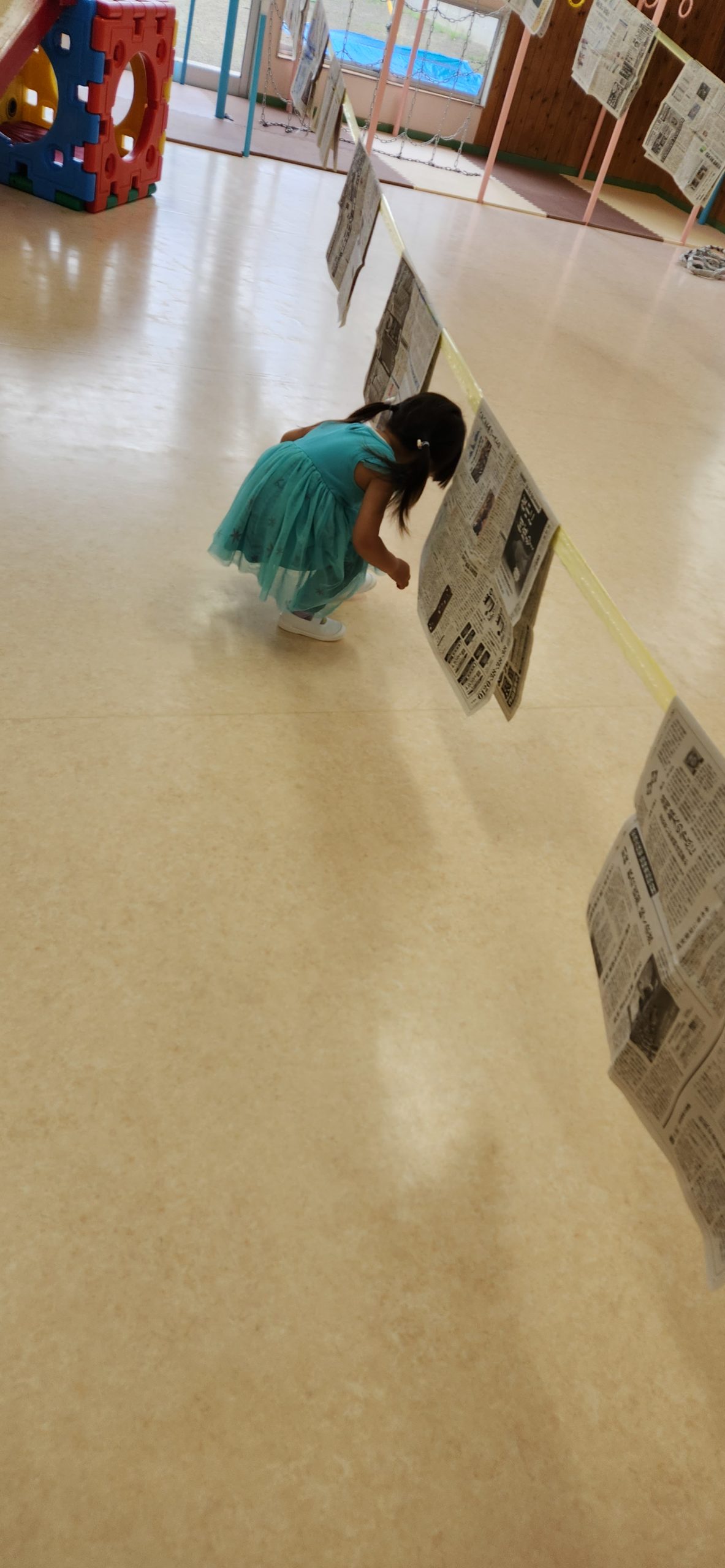 ホールに新聞紙を カーテンみたいにかけたり 床に置いてみたりしました🎵