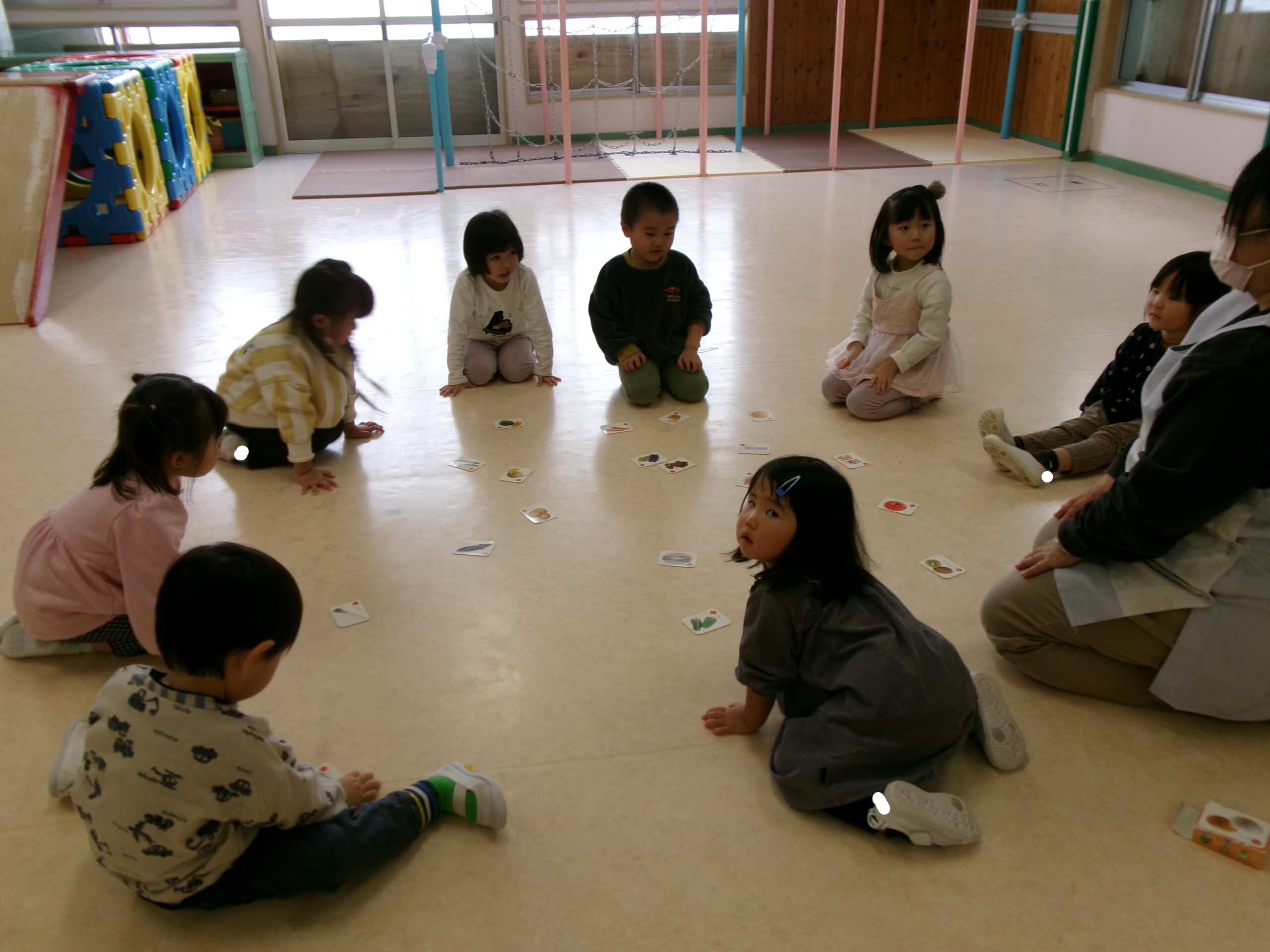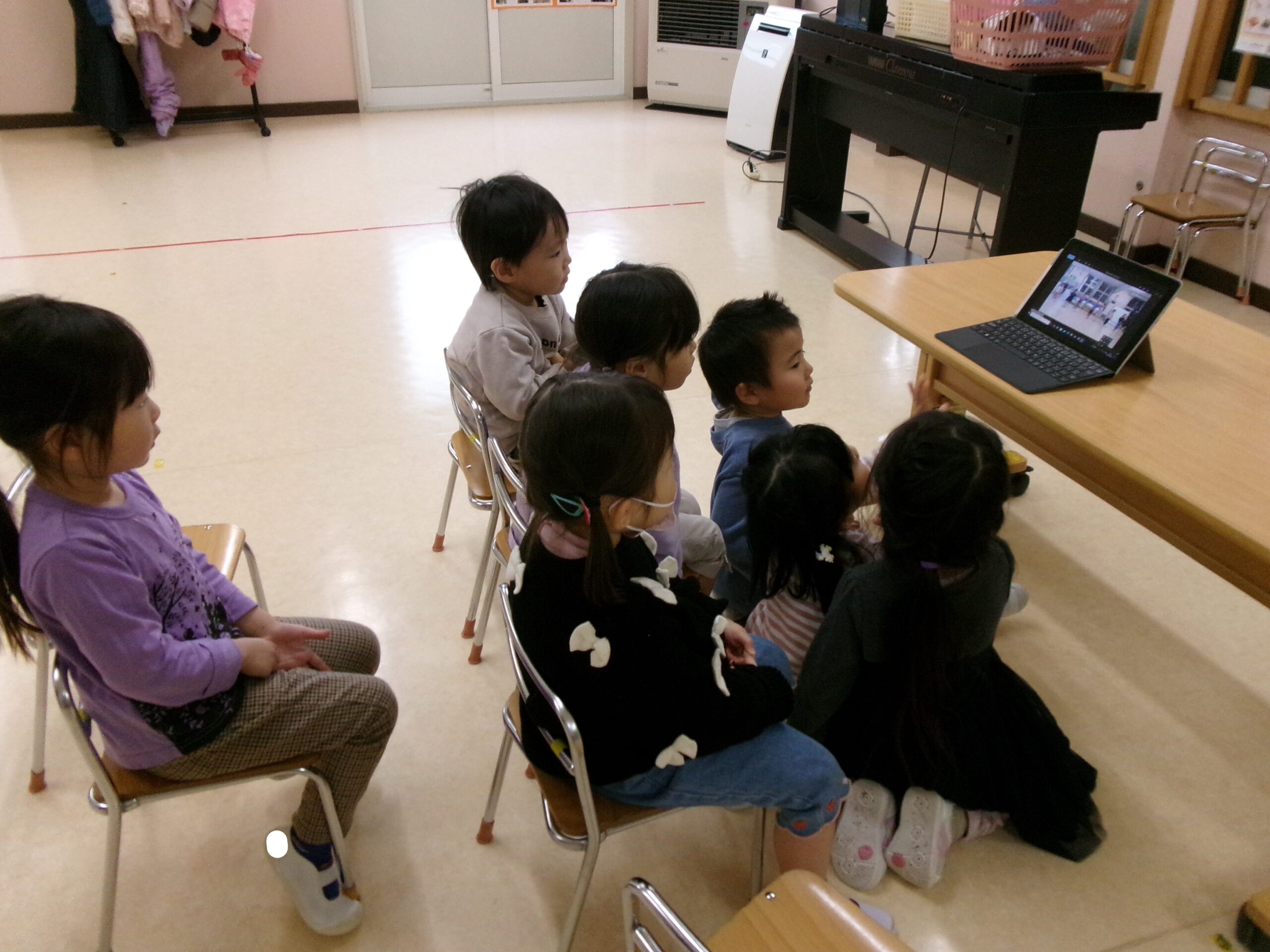 久しぶりに会うお友達と手をつないで遊んだりと、再会を喜んでいるひよこ組さん。