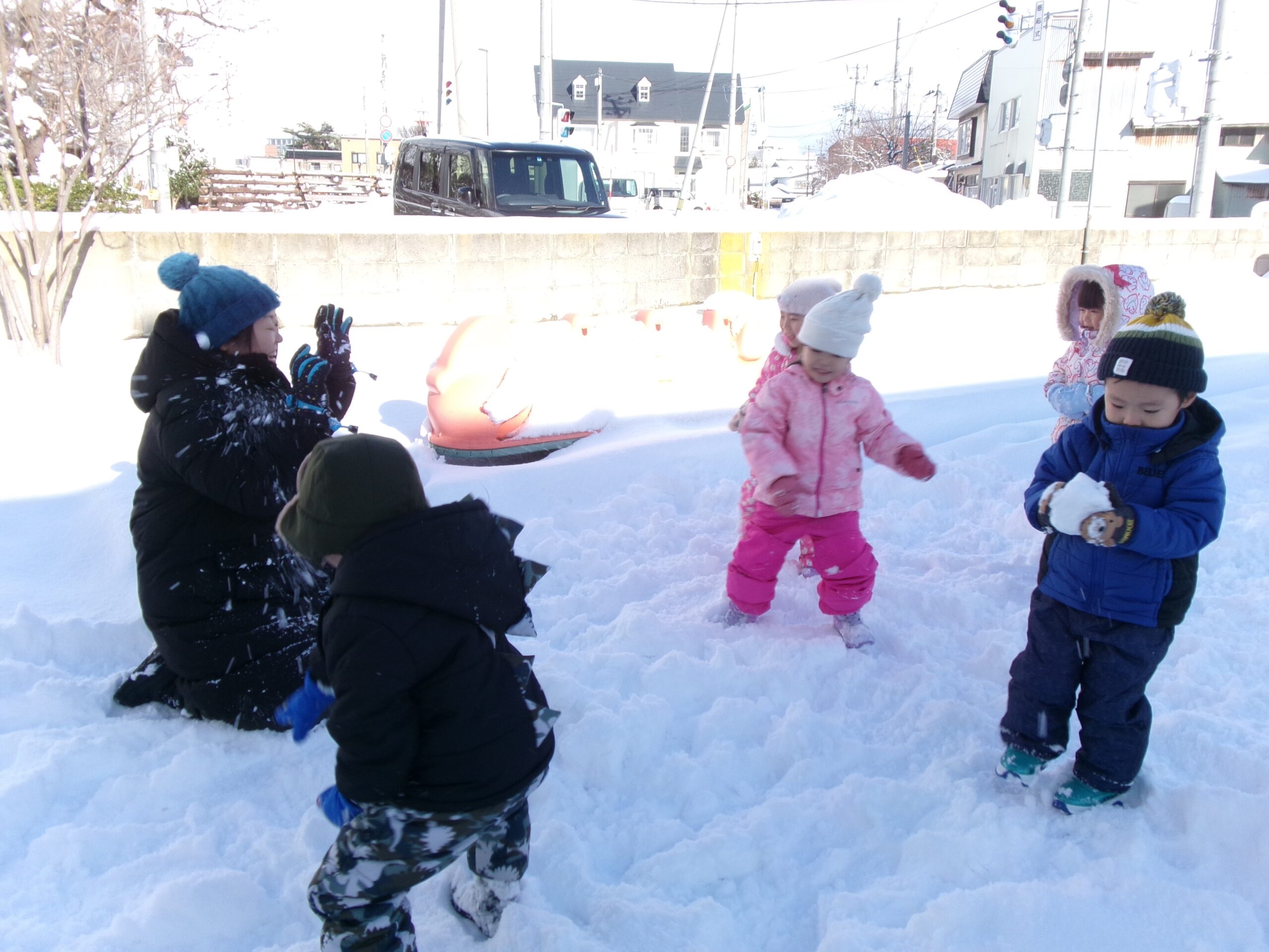 天気のいい日は園庭で雪遊びをしました。