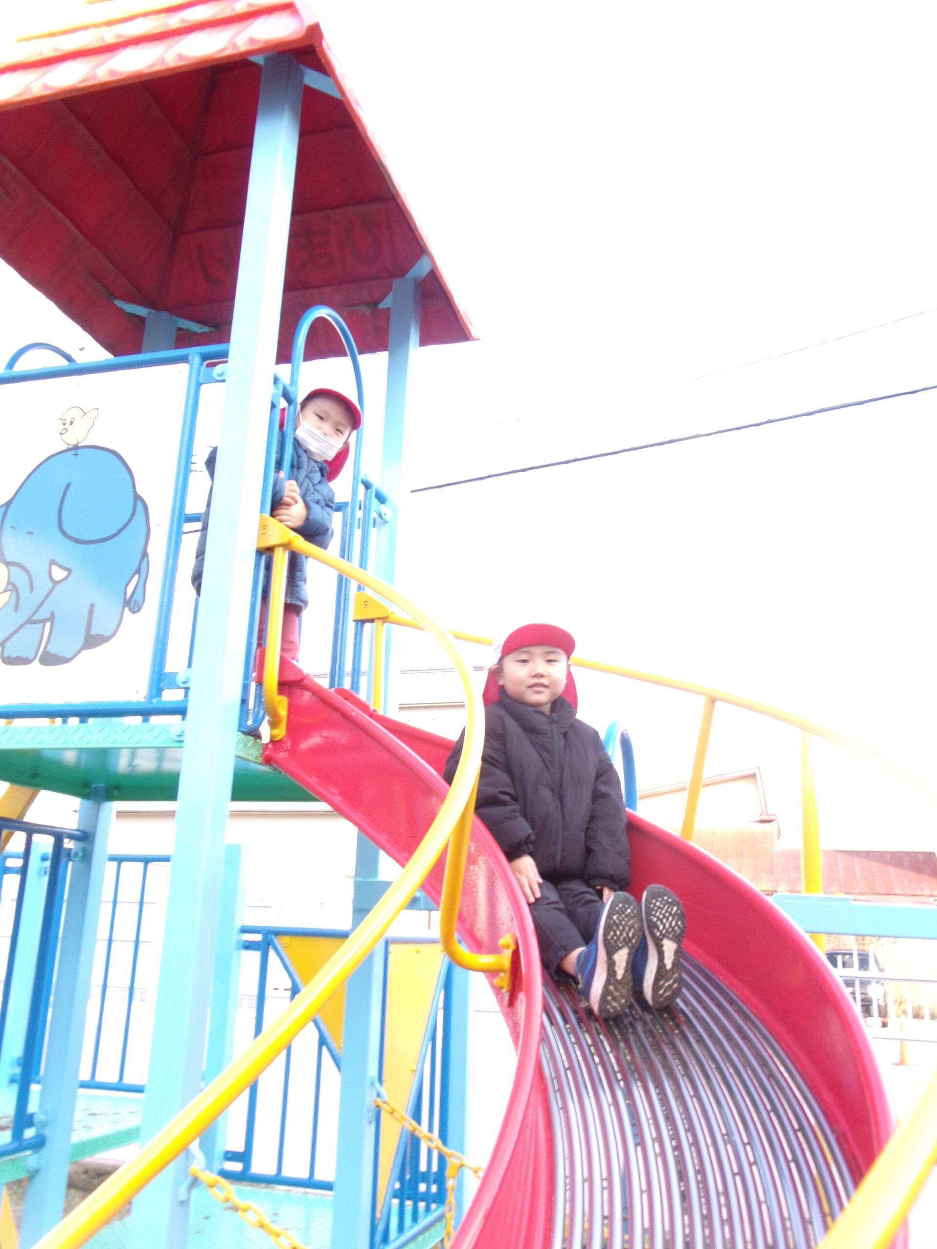 幼稚園の雪山は例年より高くなり、ソリはスピードが速いです🛷