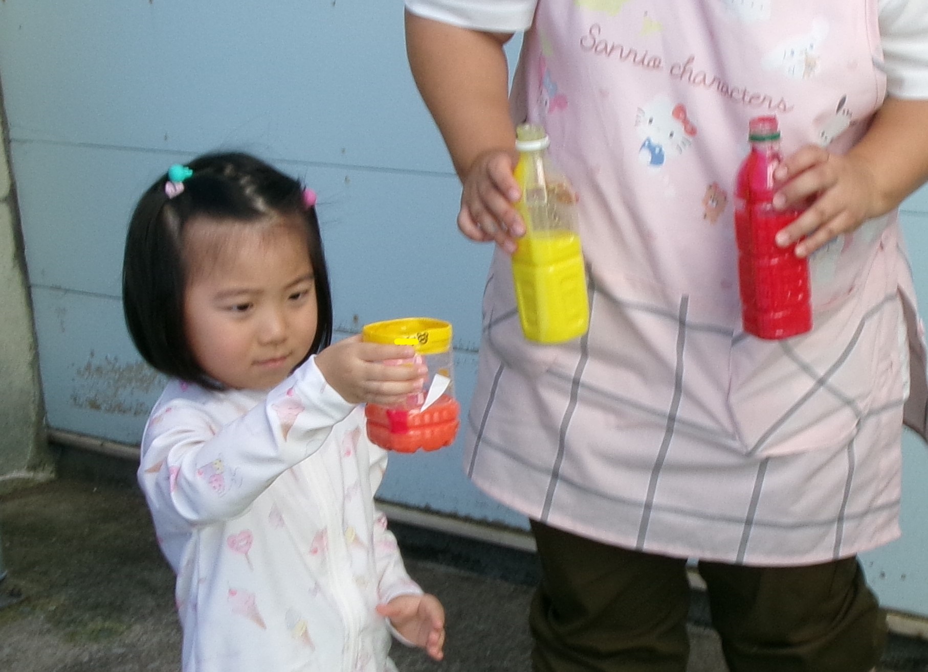 先日外遊びをした際に、虫網でコオロギとトンボとカマキリを捕まえたひよこ組さん。