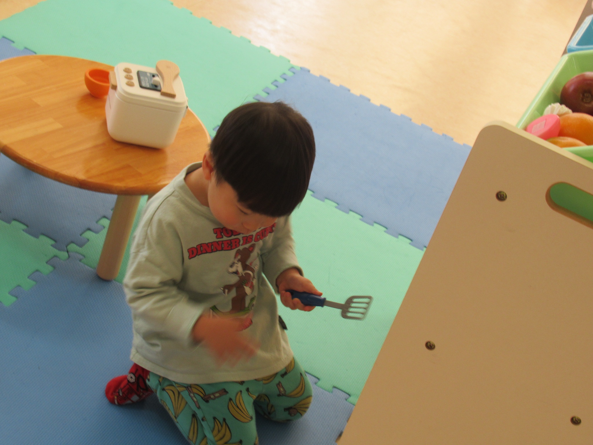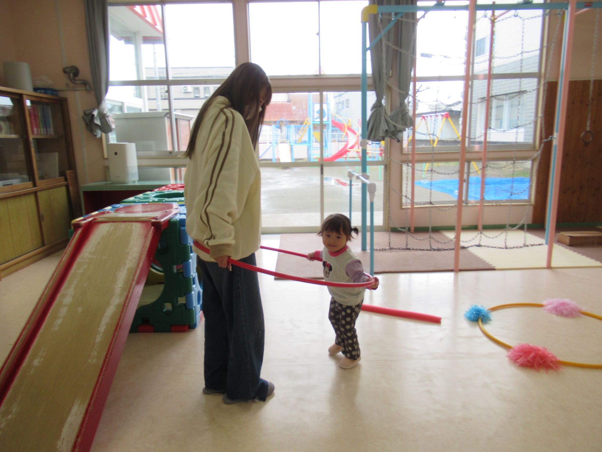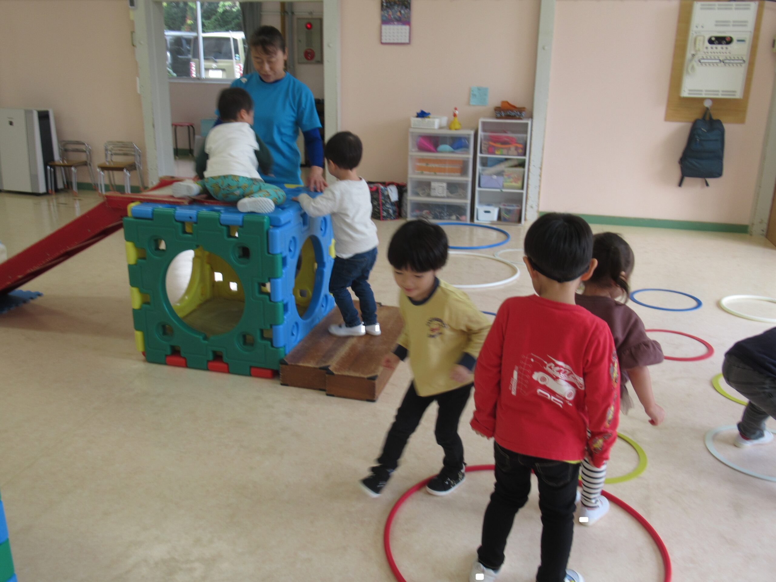 ひよこ組のお友だちと一緒にハイ・ホーの曲に合わせてリズム遊び! 色々な楽器の音が混ざり合って、素敵な演奏になりました♬