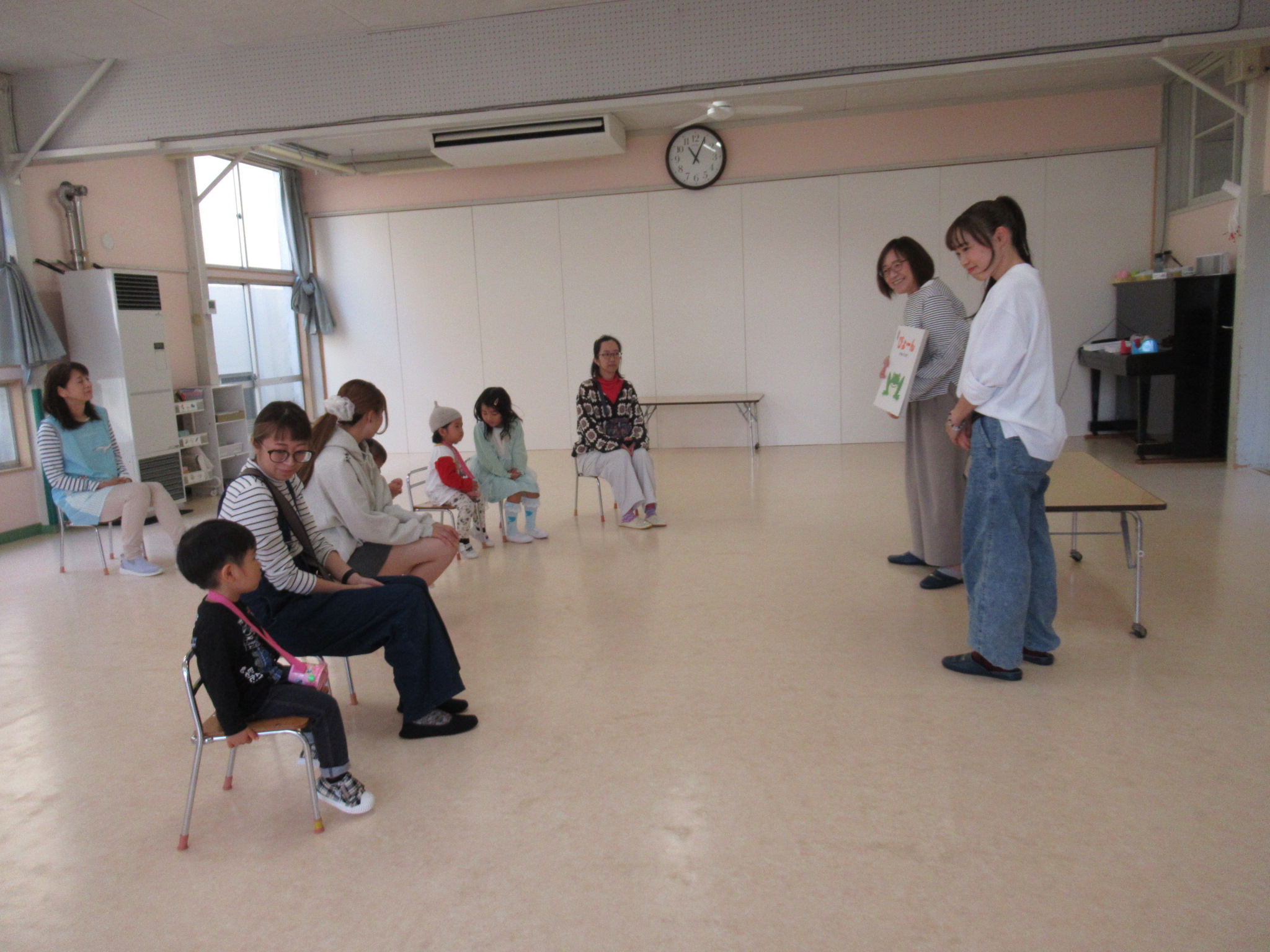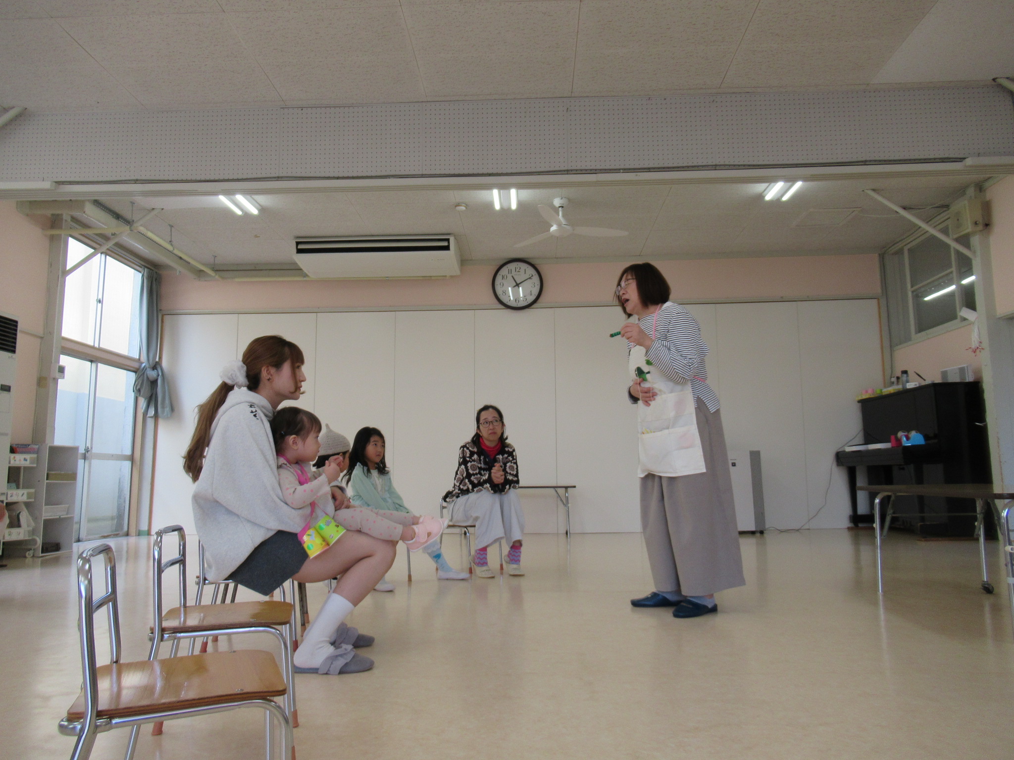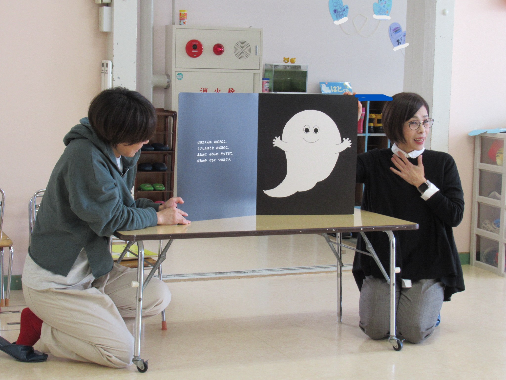 お菓子の後は「ぱぴぷぺ・ぽん」のお姉さんたちの読み聞かせを楽しみました😊