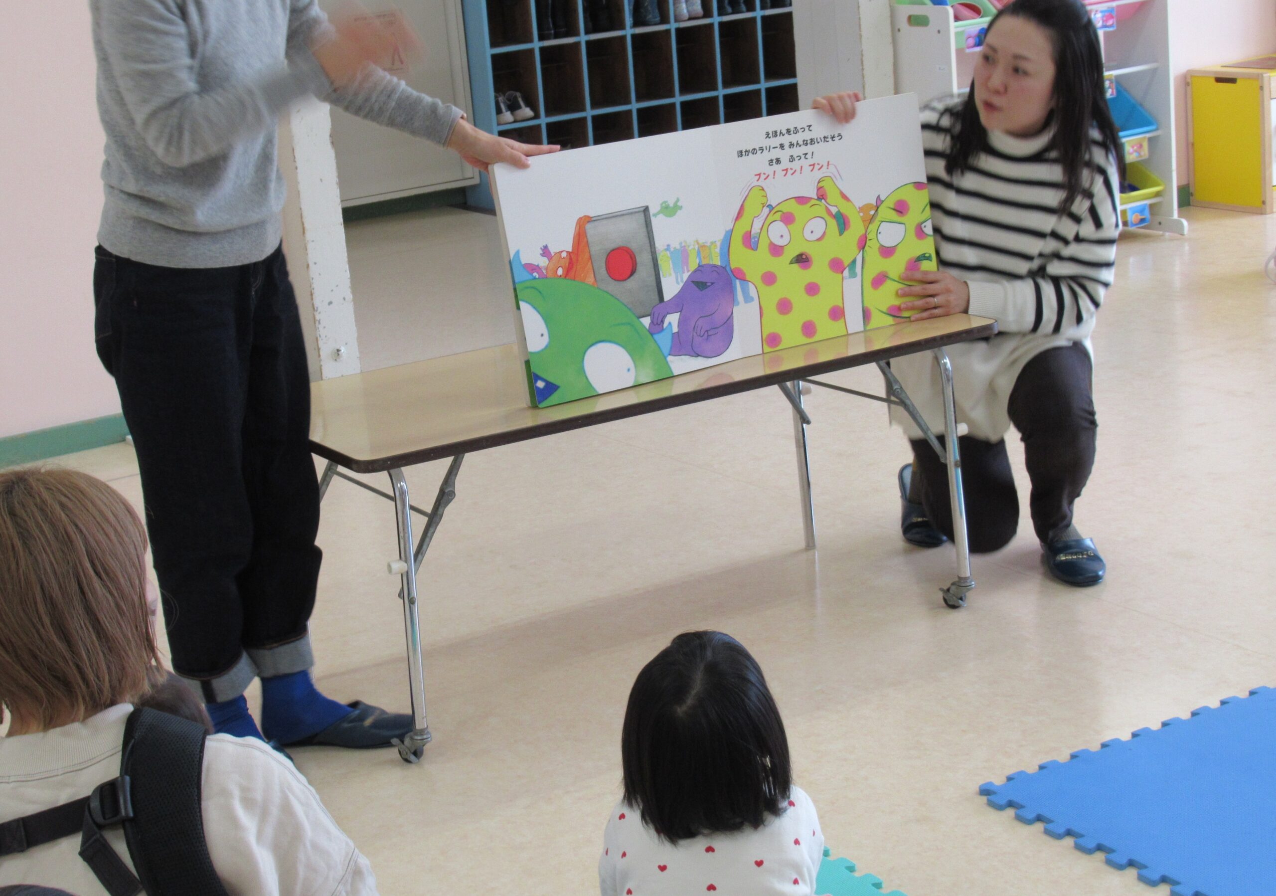読み聞かせでは、椅子に座って落ち着いて絵本を見ることができましたよ。ぱぴぷぺ・ぽんのみなさんとの掛け合いも楽しかったようです!