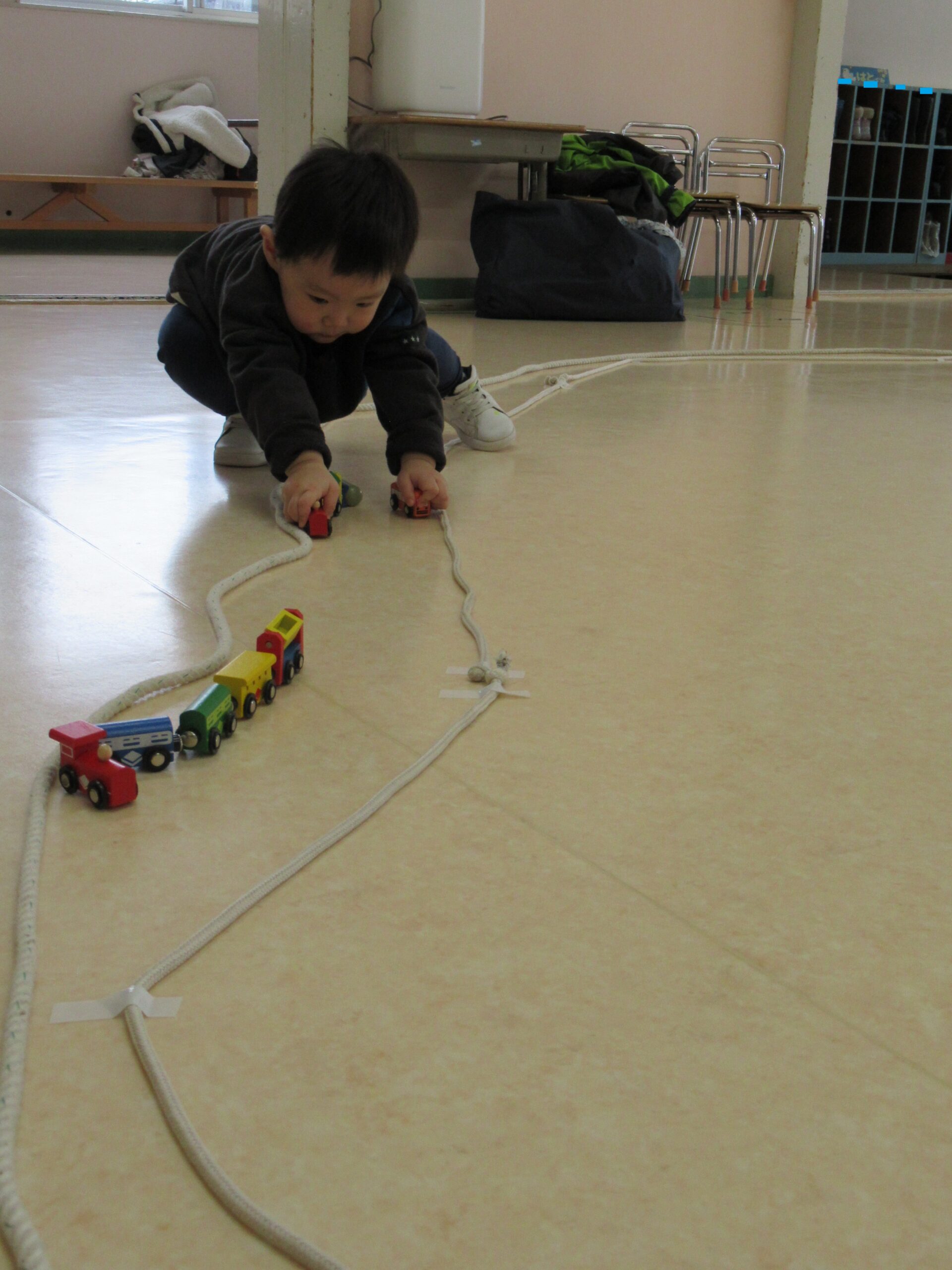 電車のおもちゃが大好きな僕は今日も夢中です。しばらく線路をつなげて遊んでいたけれど・・・長縄で作った線路にも興味をもってくれたようで、おもちゃの線路を飛び出して、長縄の線路を走らせて遊んでいましたよ。