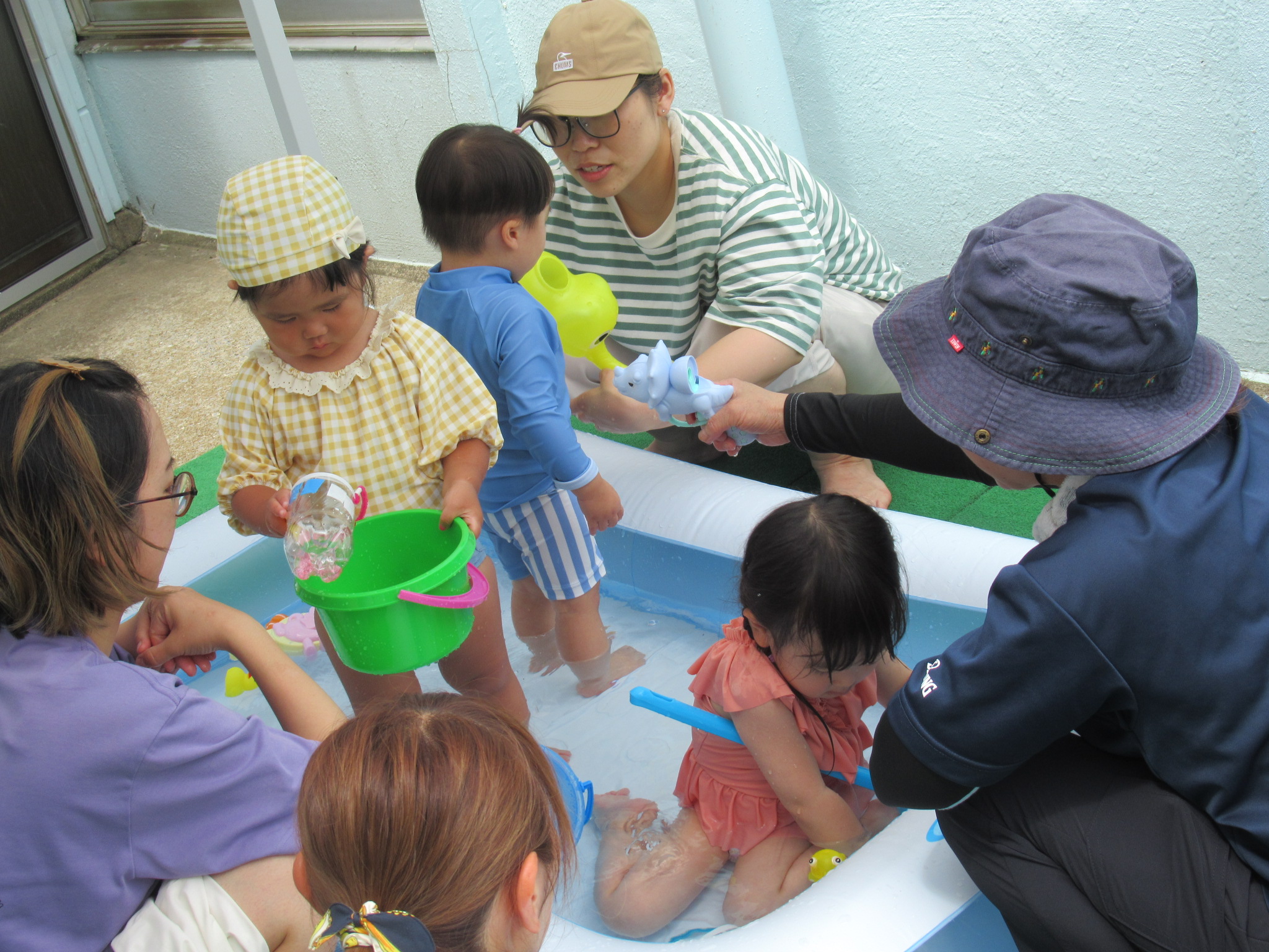 フィンガーペインティングの後は、お外で色水遊びをしました。