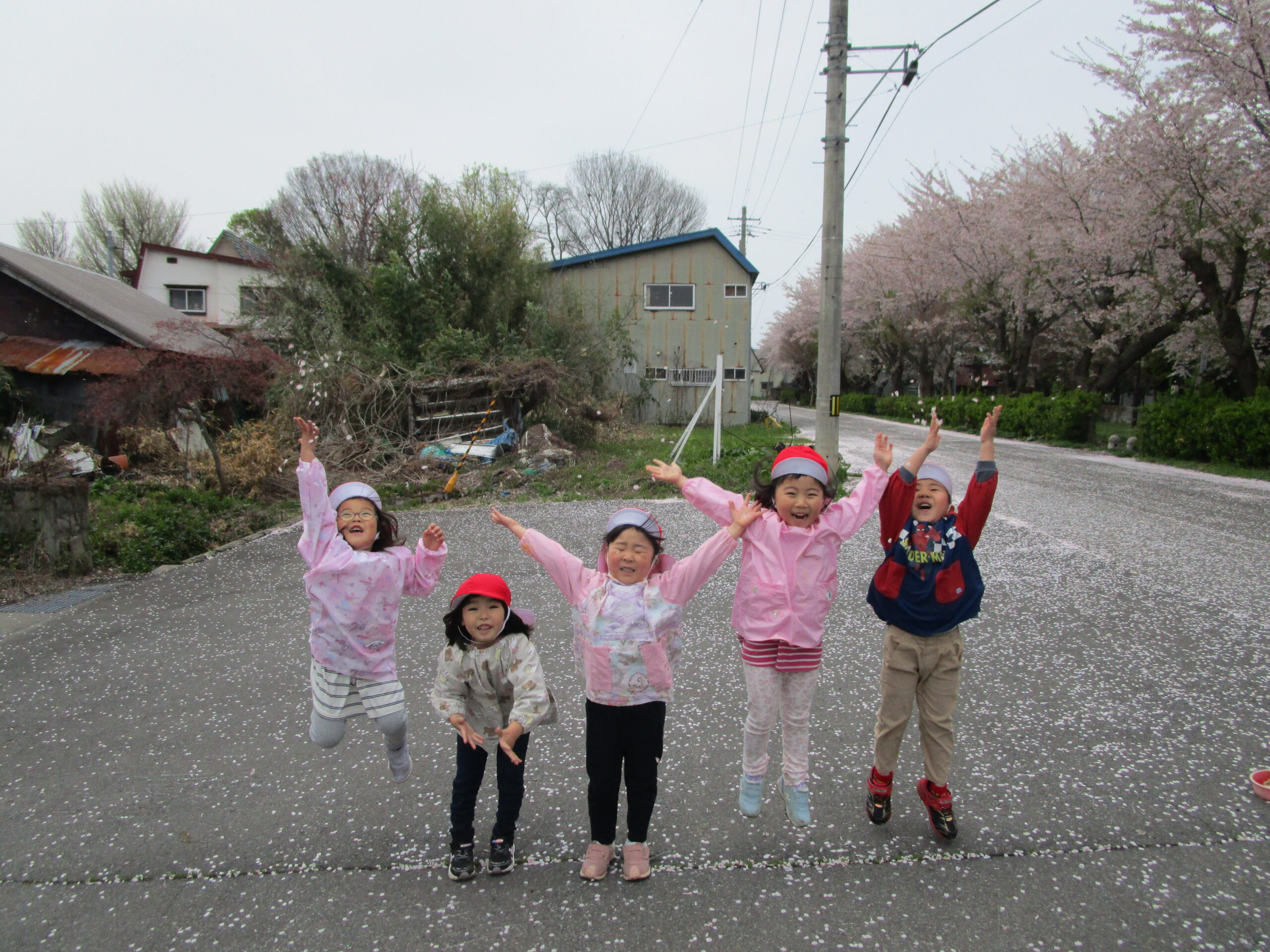 桜の花びらが散って道路がピンク色に染まっているのを見て、「きれいだね」と感動していた子ども達。