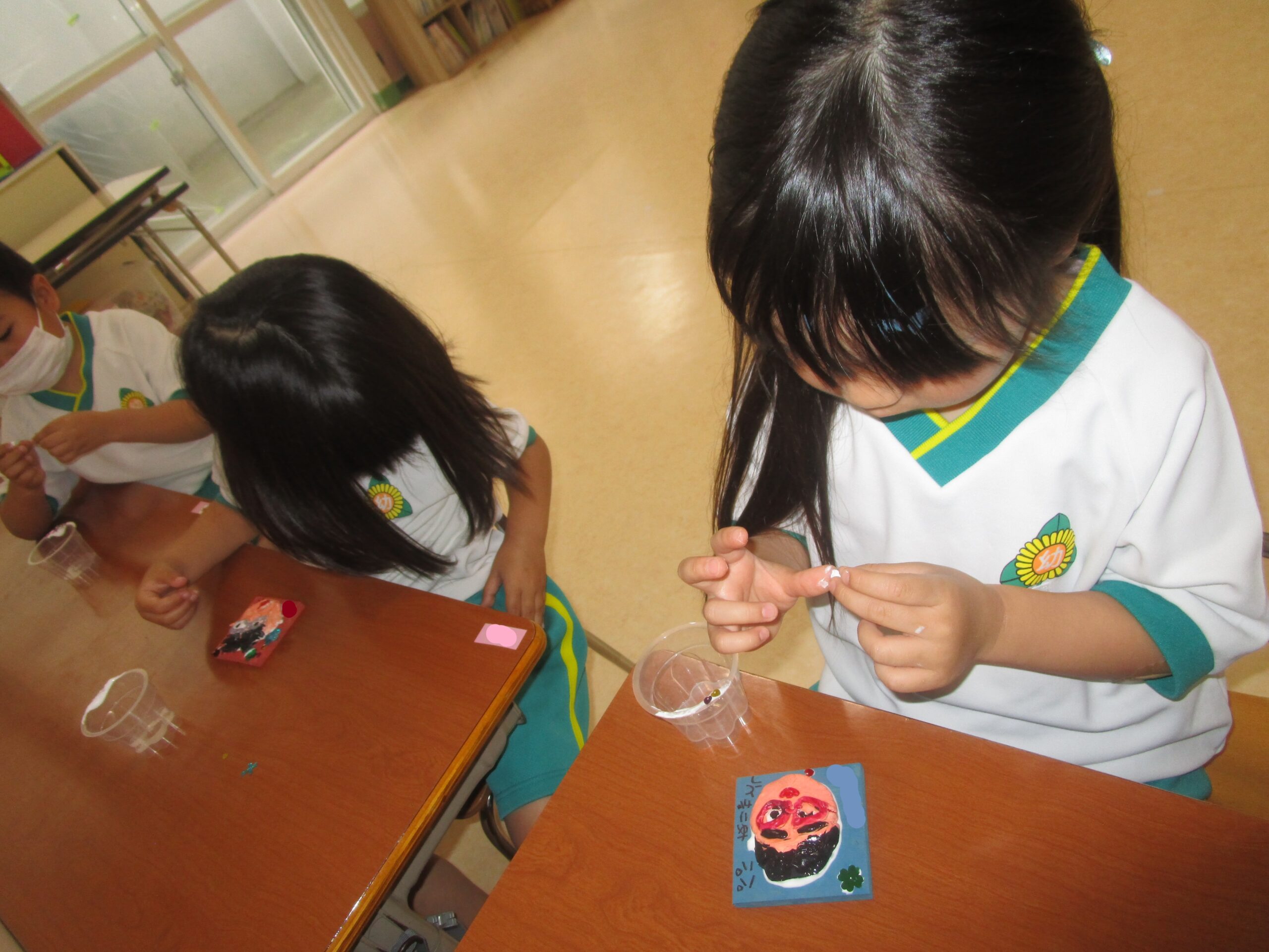 母の日の似顔絵展に向けて、お母さんの絵を描き、お花やハートのスタンプで飾りつけしている様子です。