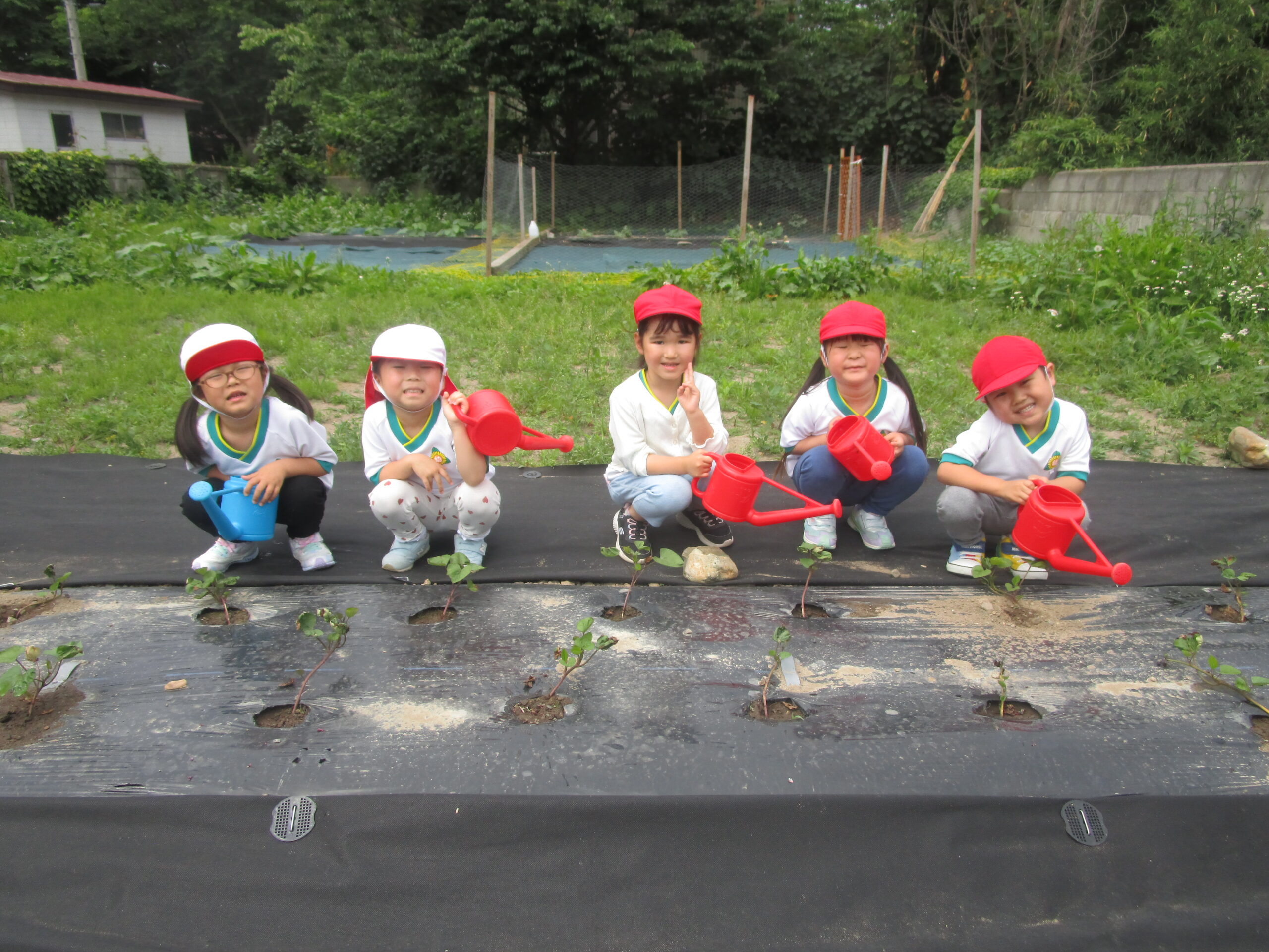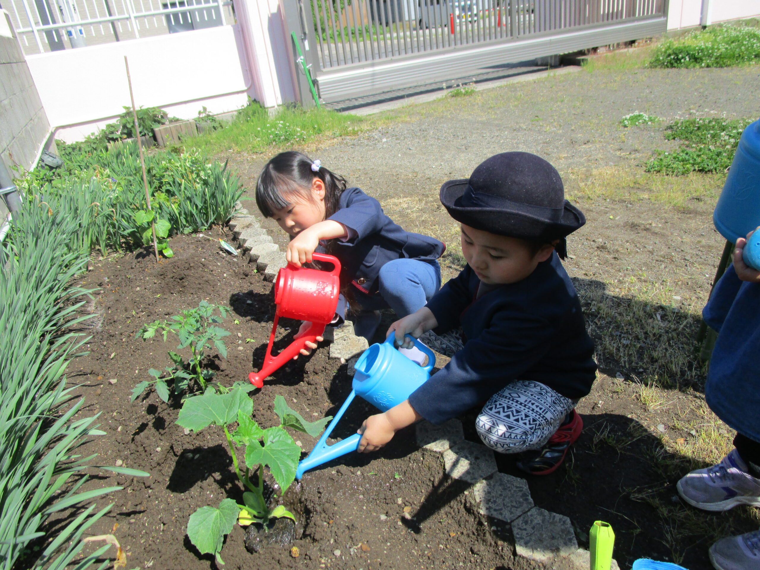 園庭の花壇にミニトマトときゅうりの苗を植えている様子です。