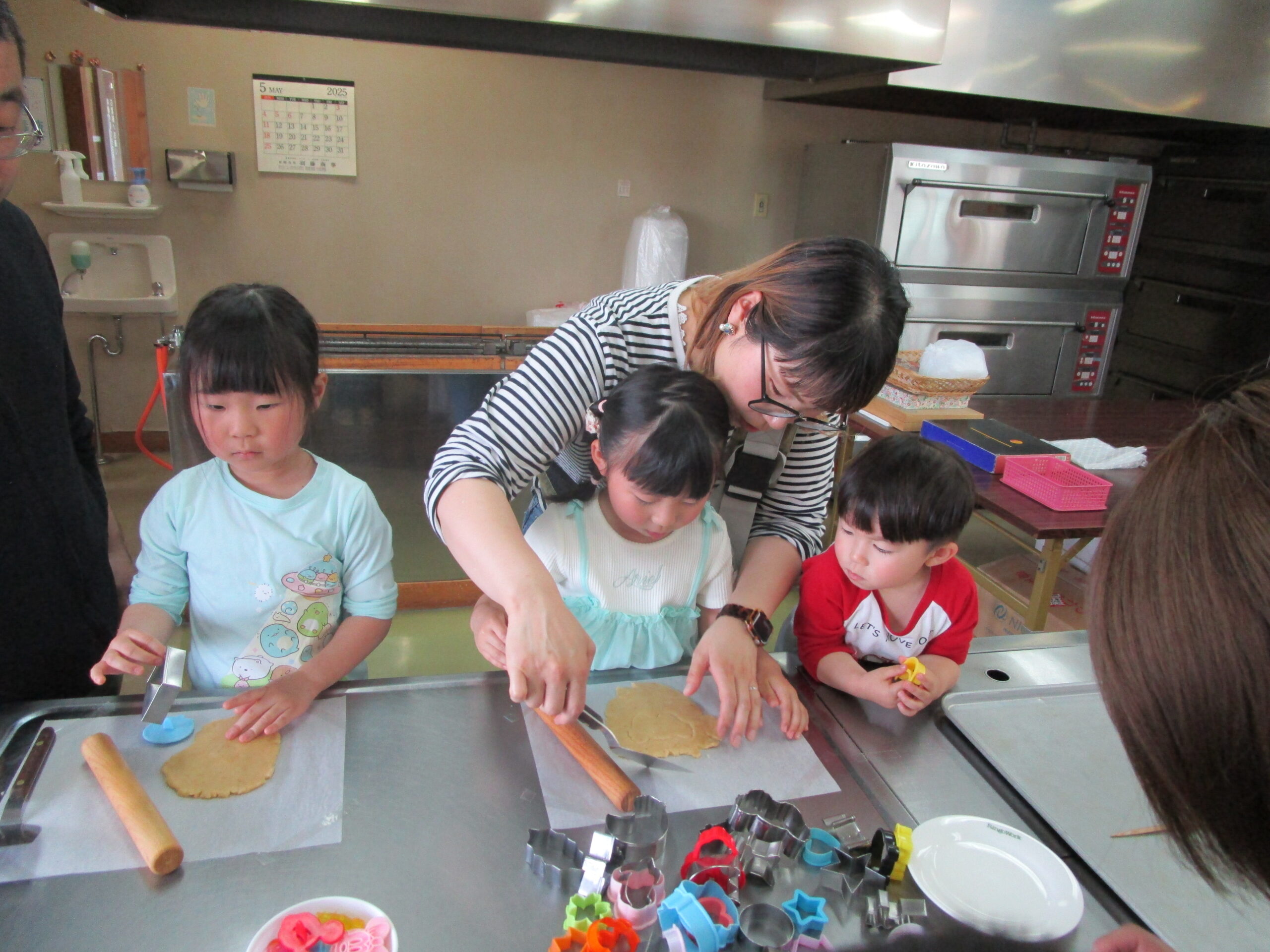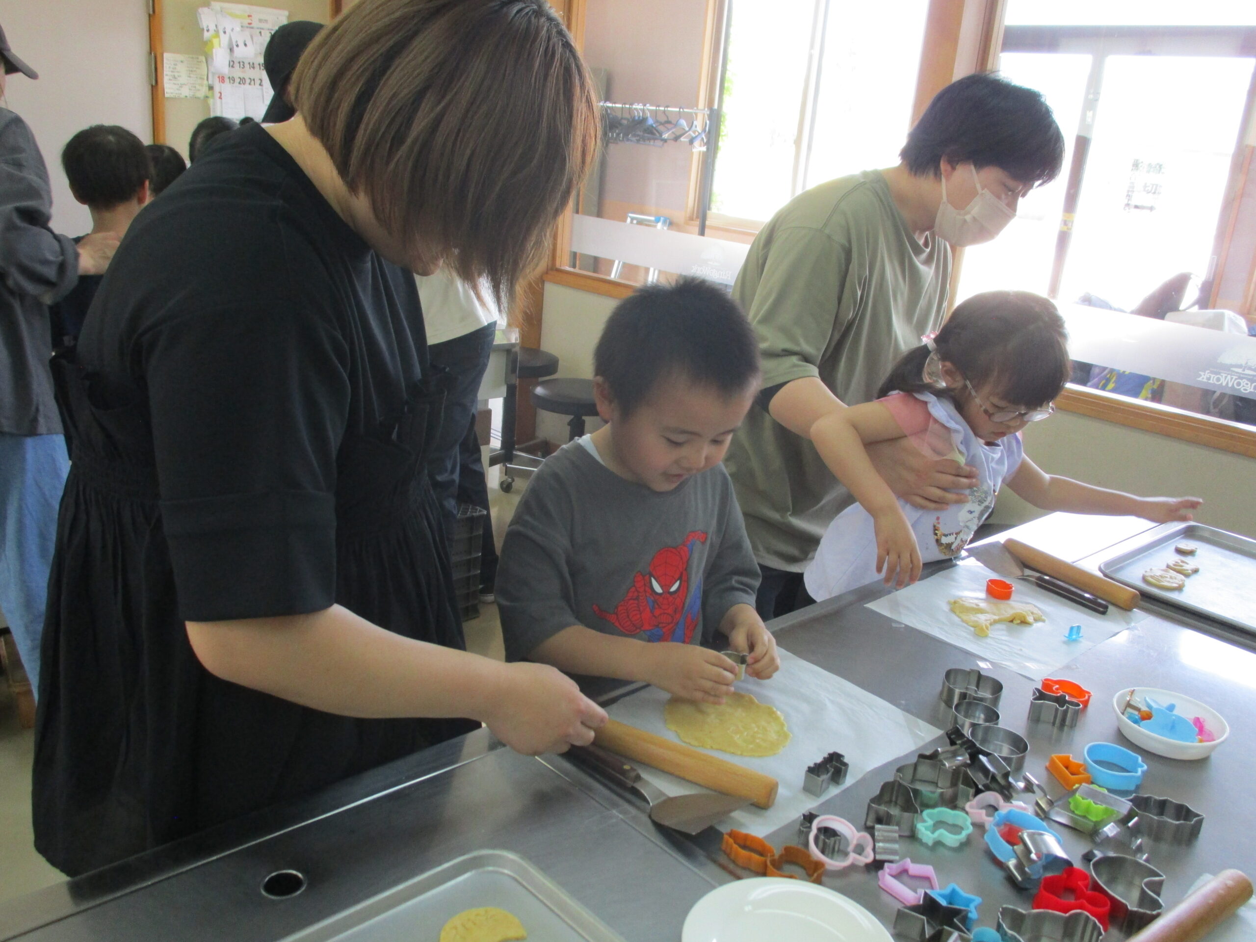 クッキー作り体験の様子です。親子で協力していろいろな形のクッキーを作りました。焼きあがったクッキーは、昼食後に食べることができました。