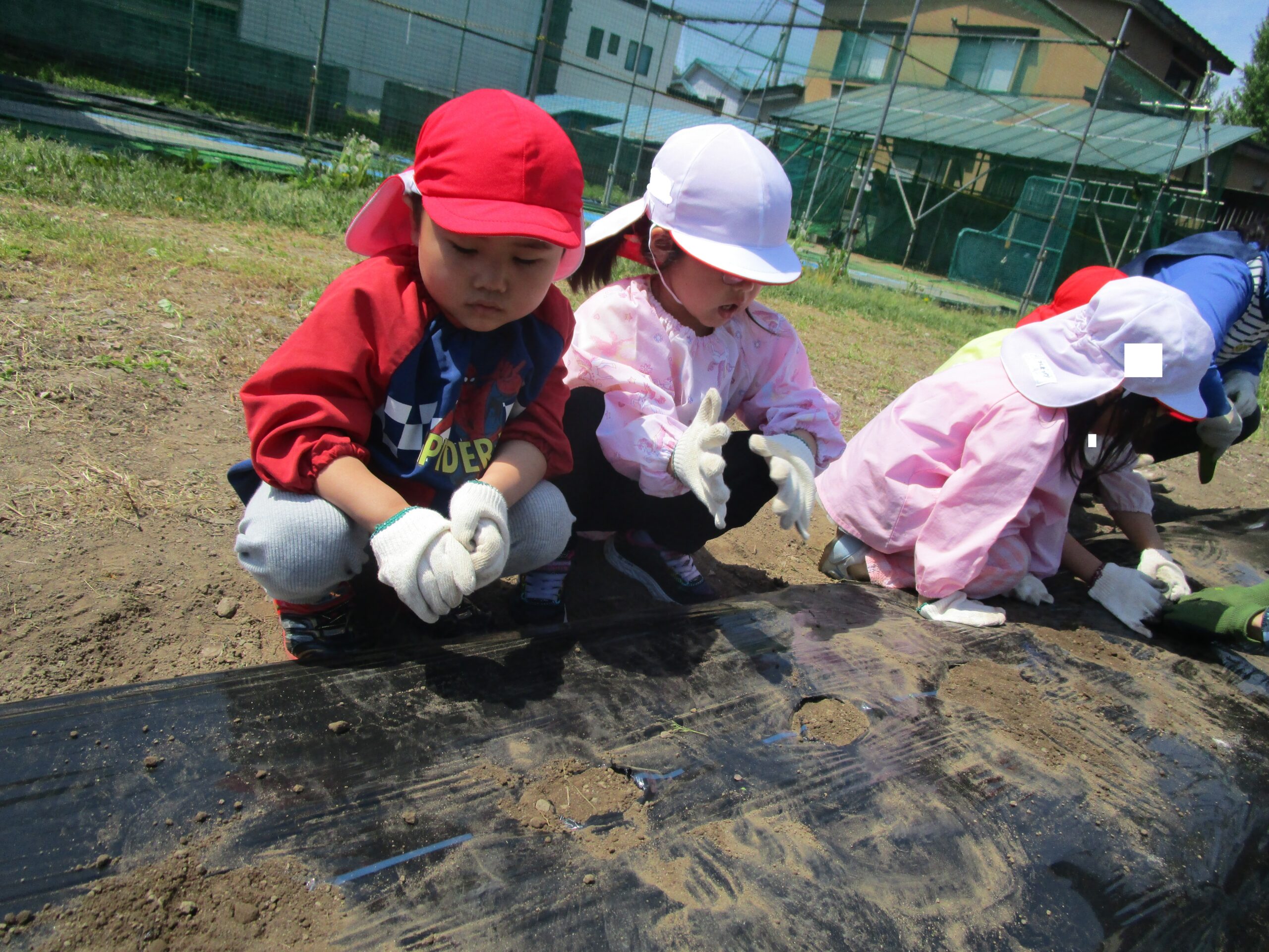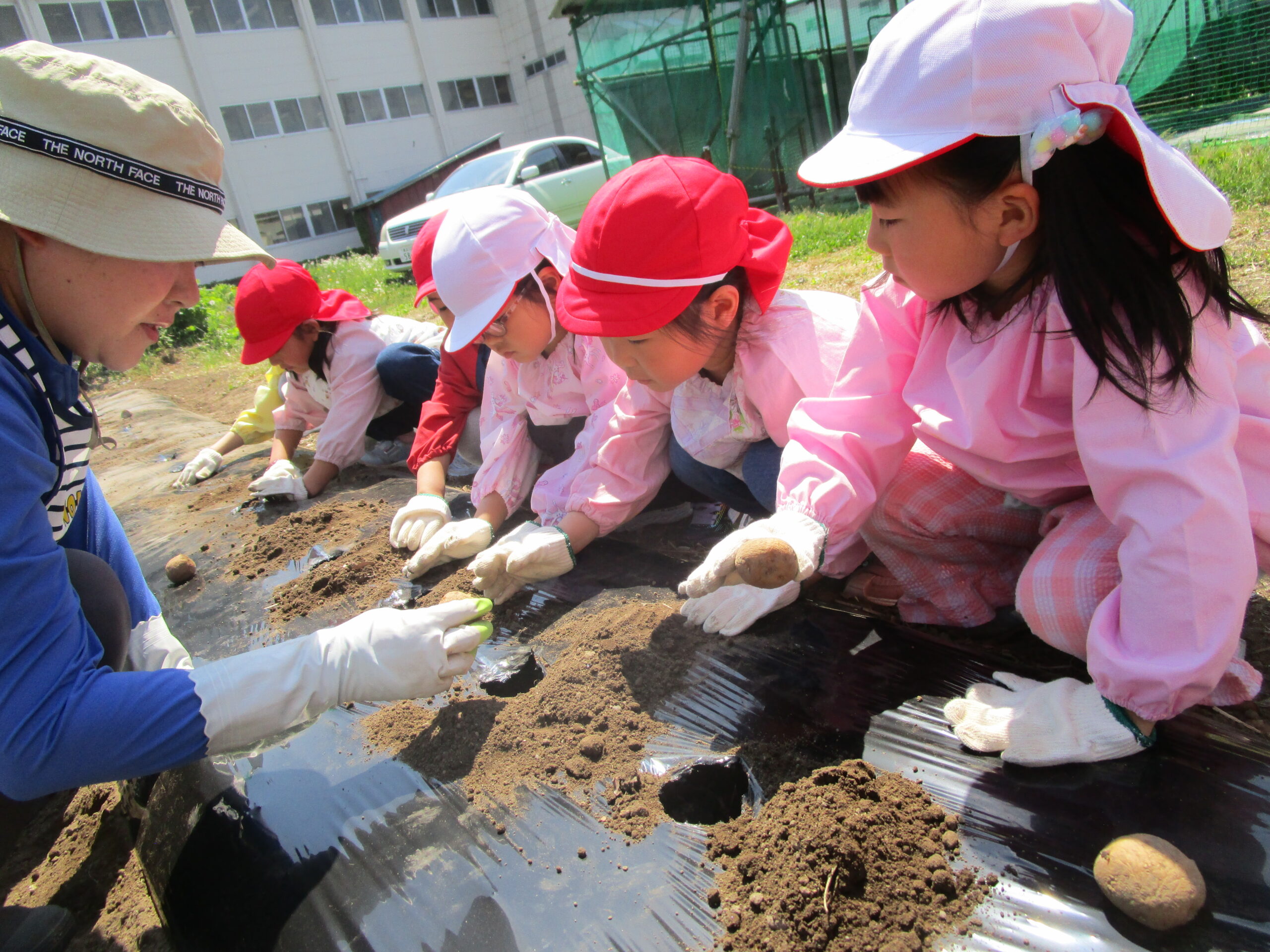 ひよこ組さん、はと組さんと一緒にじゃがいもを植えました。