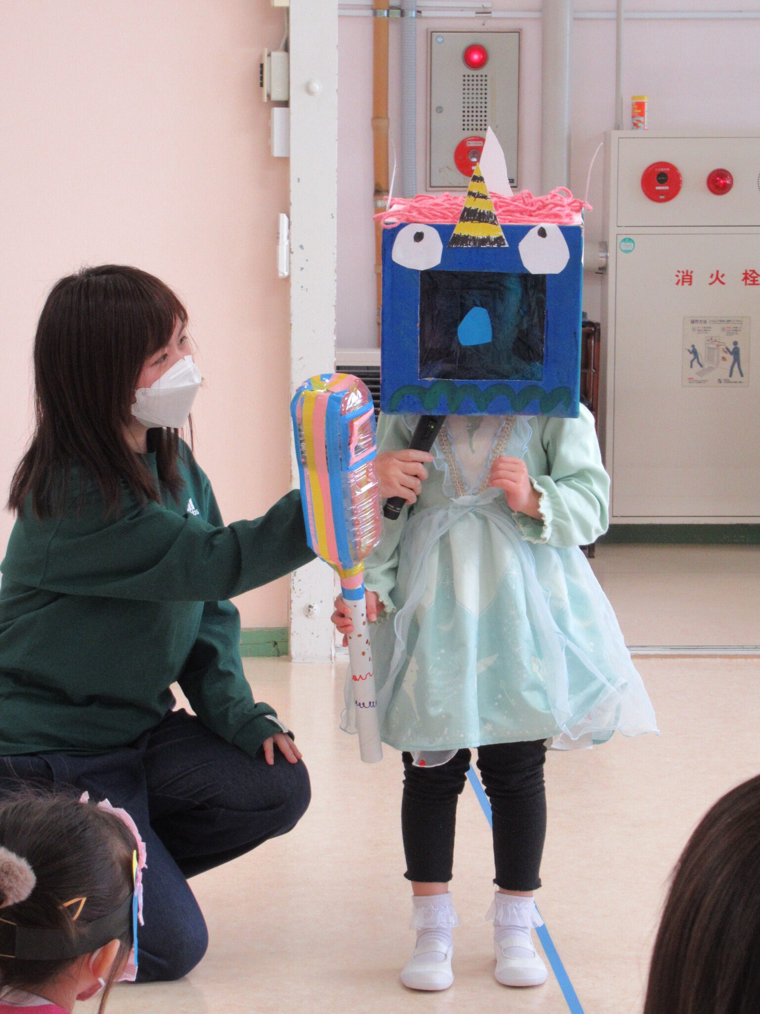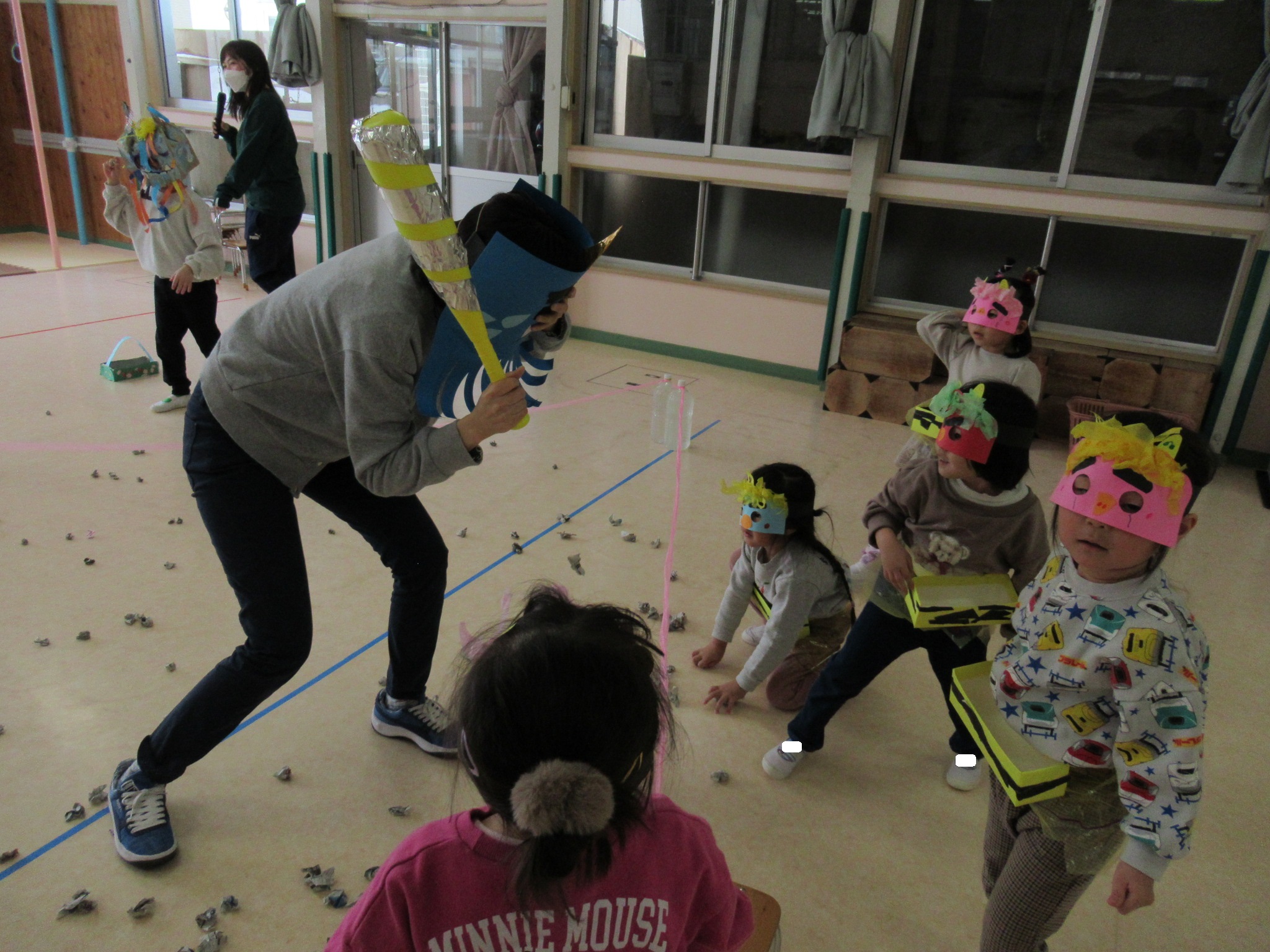 でも今年は大雪で山からオニが下りてくることができず・・・先生たちが鬼になって豆まきをすることになりました。 すこしホッとした子ども達。