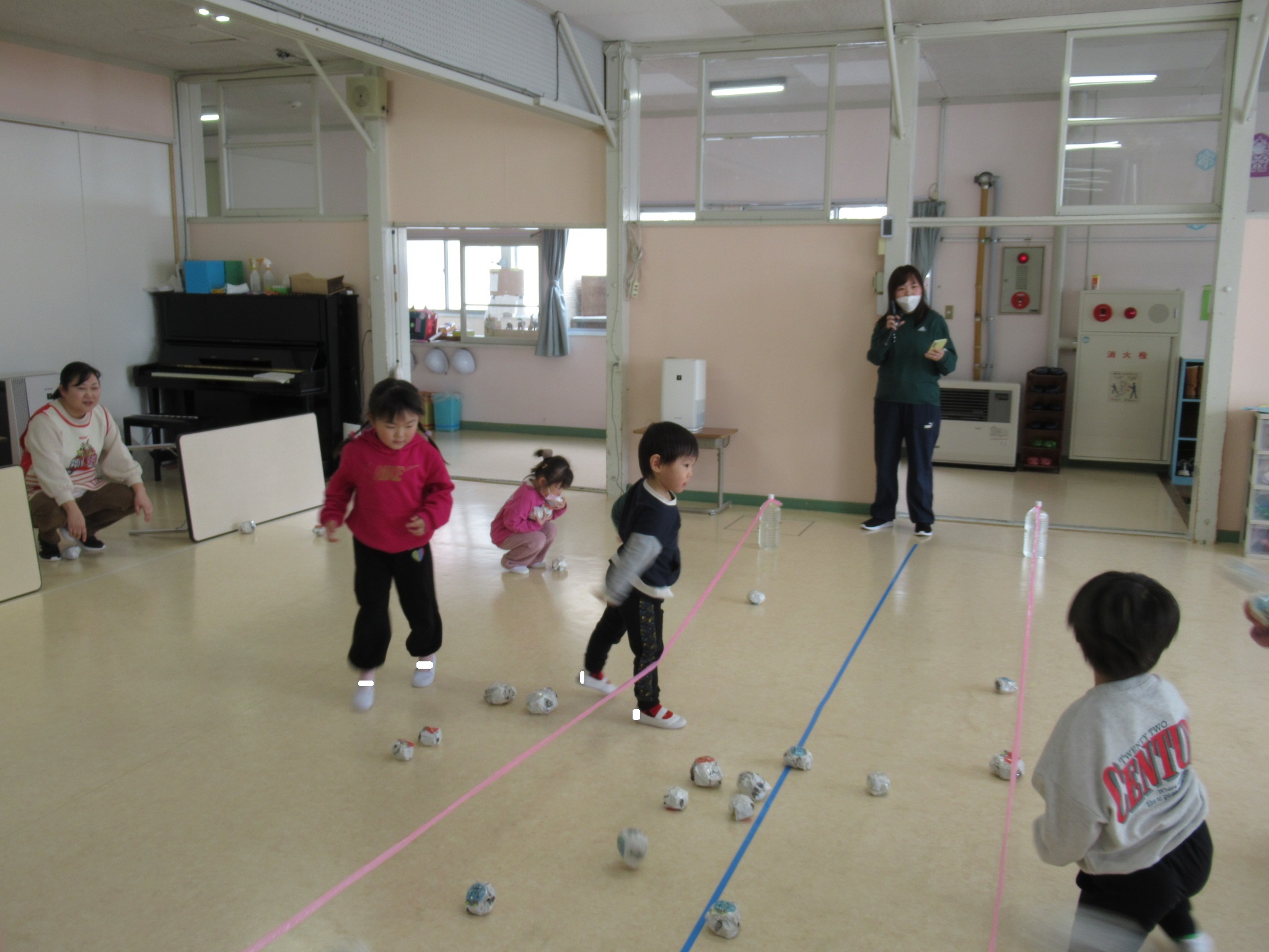 「鬼はあっちへ」ゲームでは相手チームの陣地にオニをたくさん投げて、大盛り上がりでした。白チームが勝って、大喜び!!