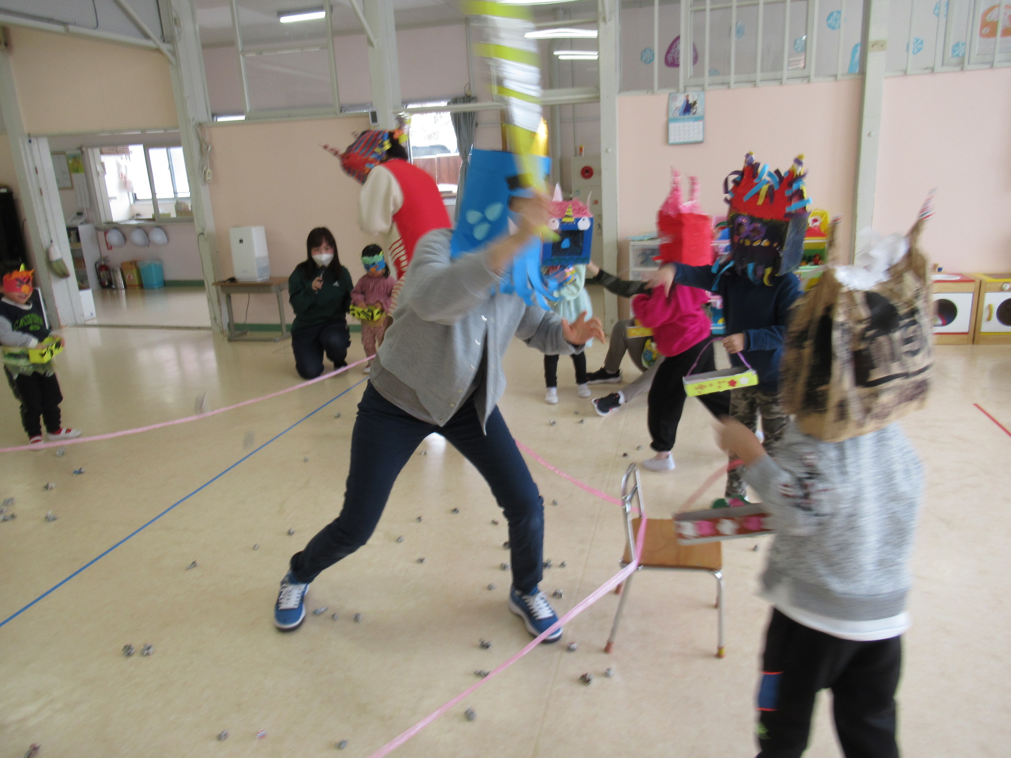 いよいよ豆まきです!「あっ〇〇先生だ!!」と言いながら、笑顔で豆まき。無事に心の中のオニを追い払い、福を呼び込むことができました。