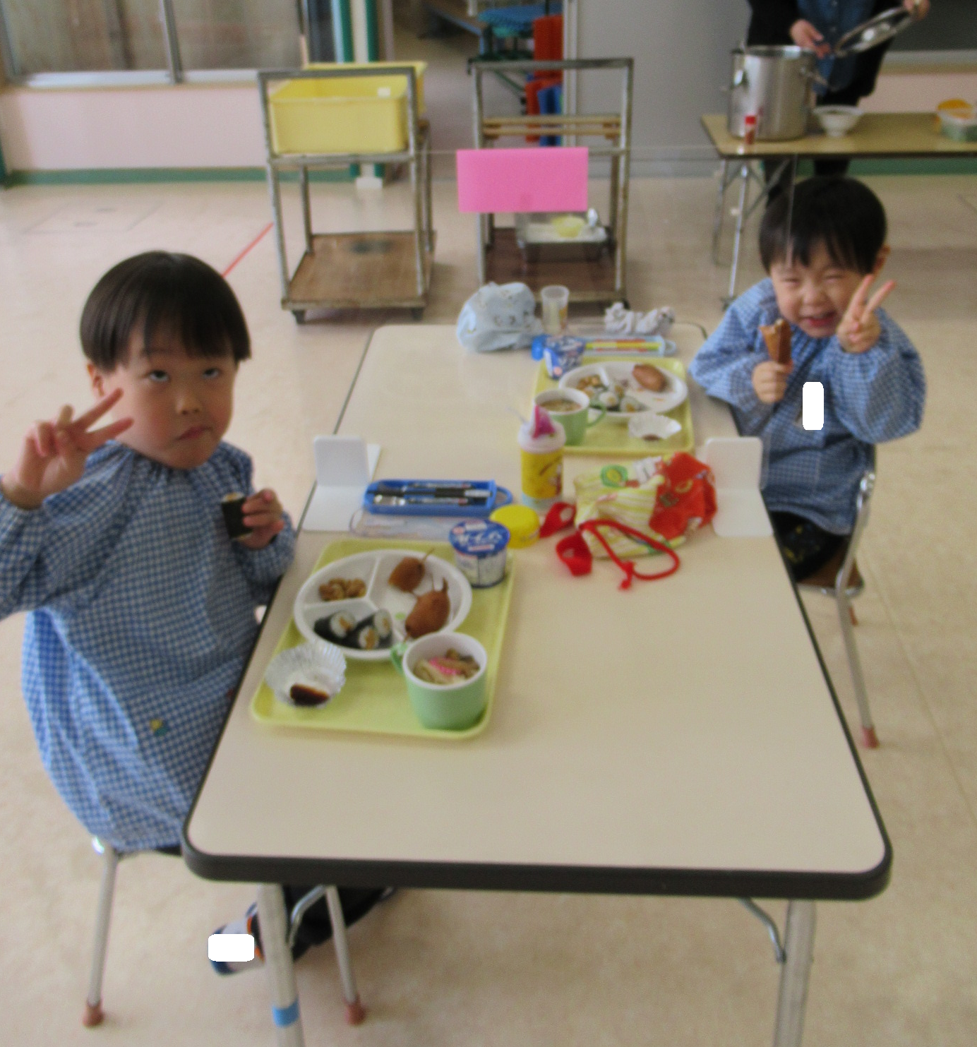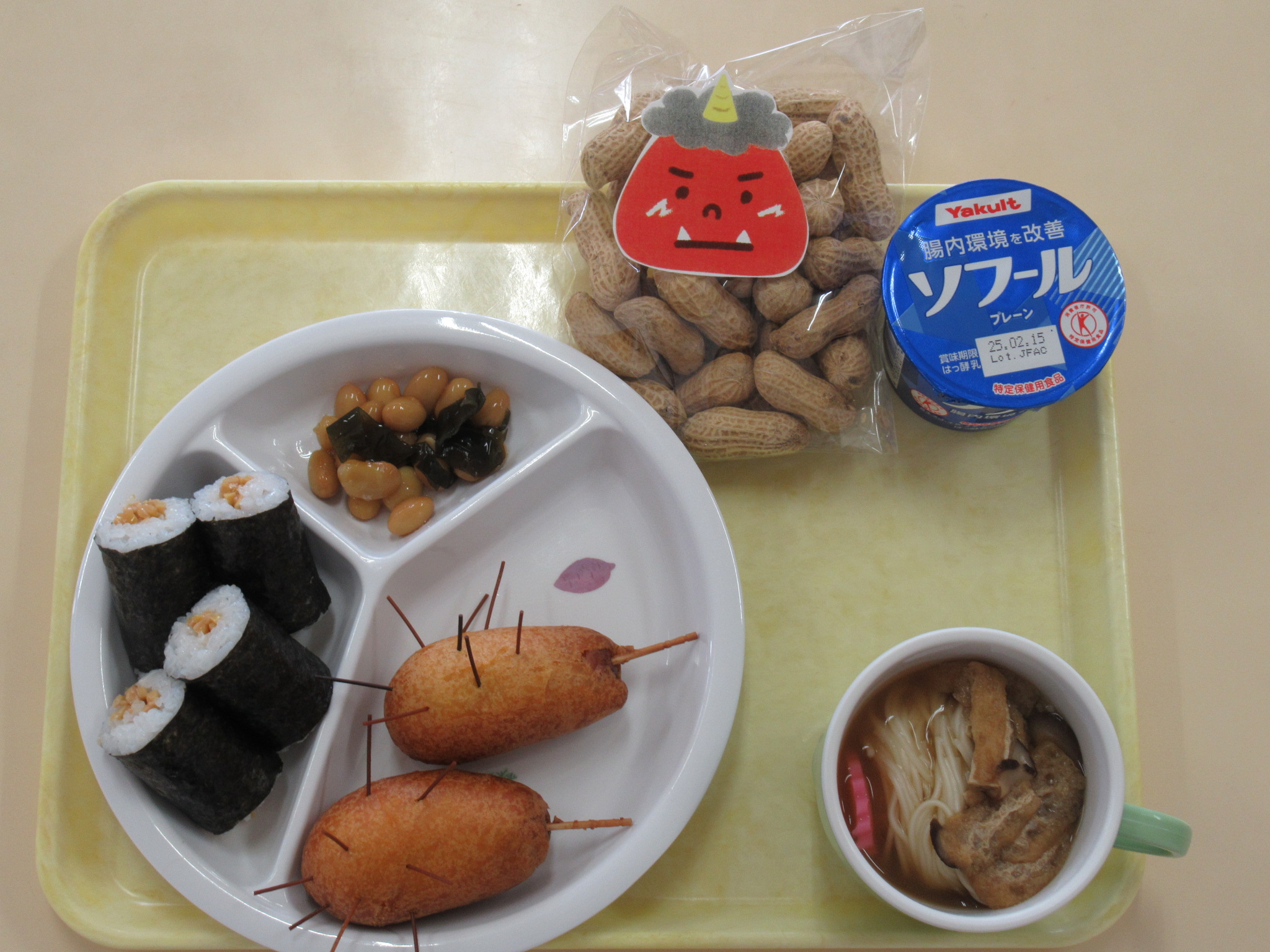 豆まきの後は給食です。恵方を向いて無言で納豆巻きをたべる子どもやミニ金棒ホットドッグをおいしそうに食べる子・・・楽しい会食になりました。