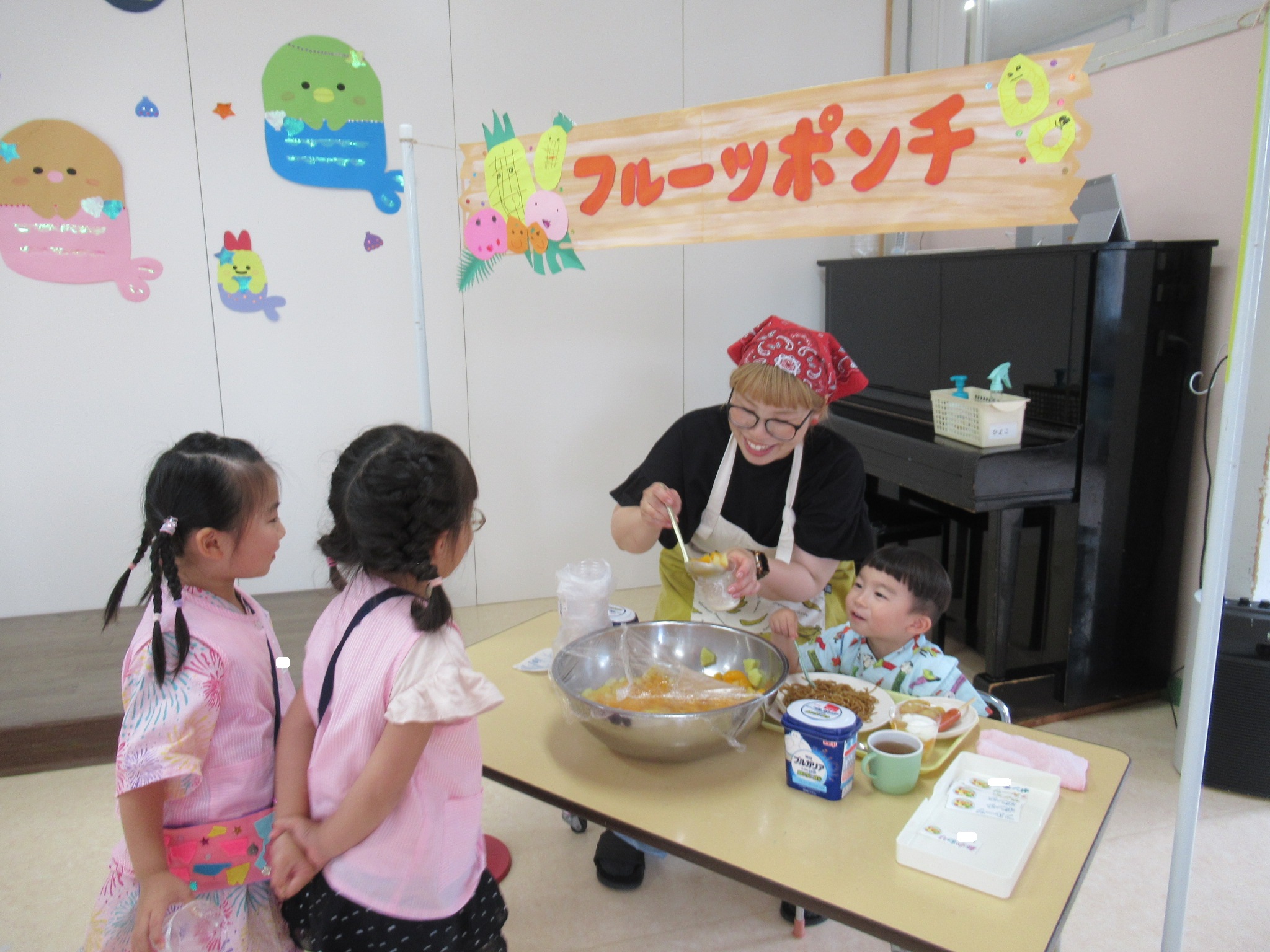 計画や当日の司会進行はうさぎ組さんが担当しましたよ。司会の練習やゲームなどの準備、会場の飾りつけなどを毎日少しずつ頑張っていました。会場の飾りつけはひよこ組さんもお手伝いをして、協力しながら当日を迎えました。