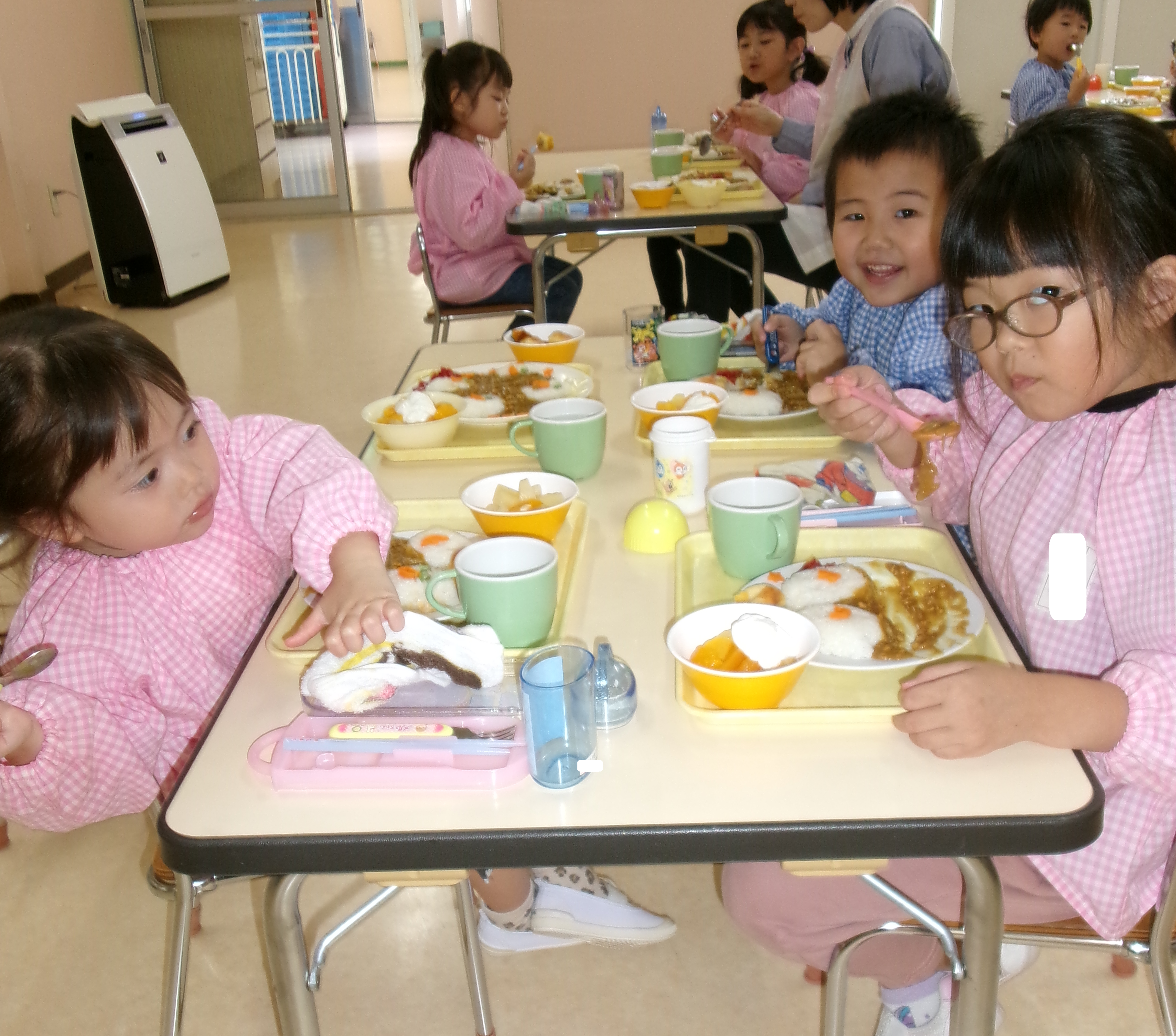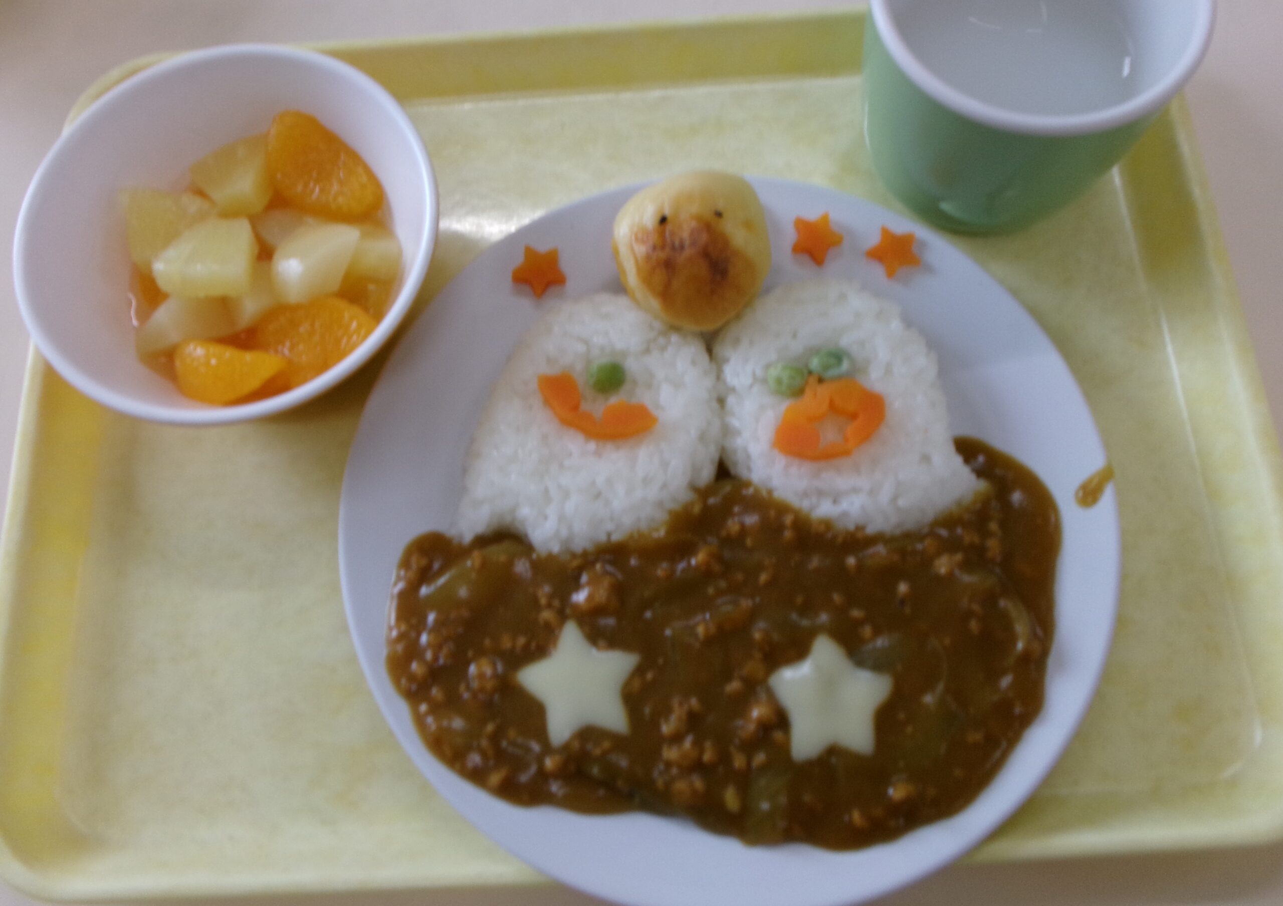 ハロウィンの日の給食は ハロウィンカレーとスイートおばけ、フルーツポンチです。「かわいいね」「おいしね」とニコニコ笑顔で食べていましたよ😊