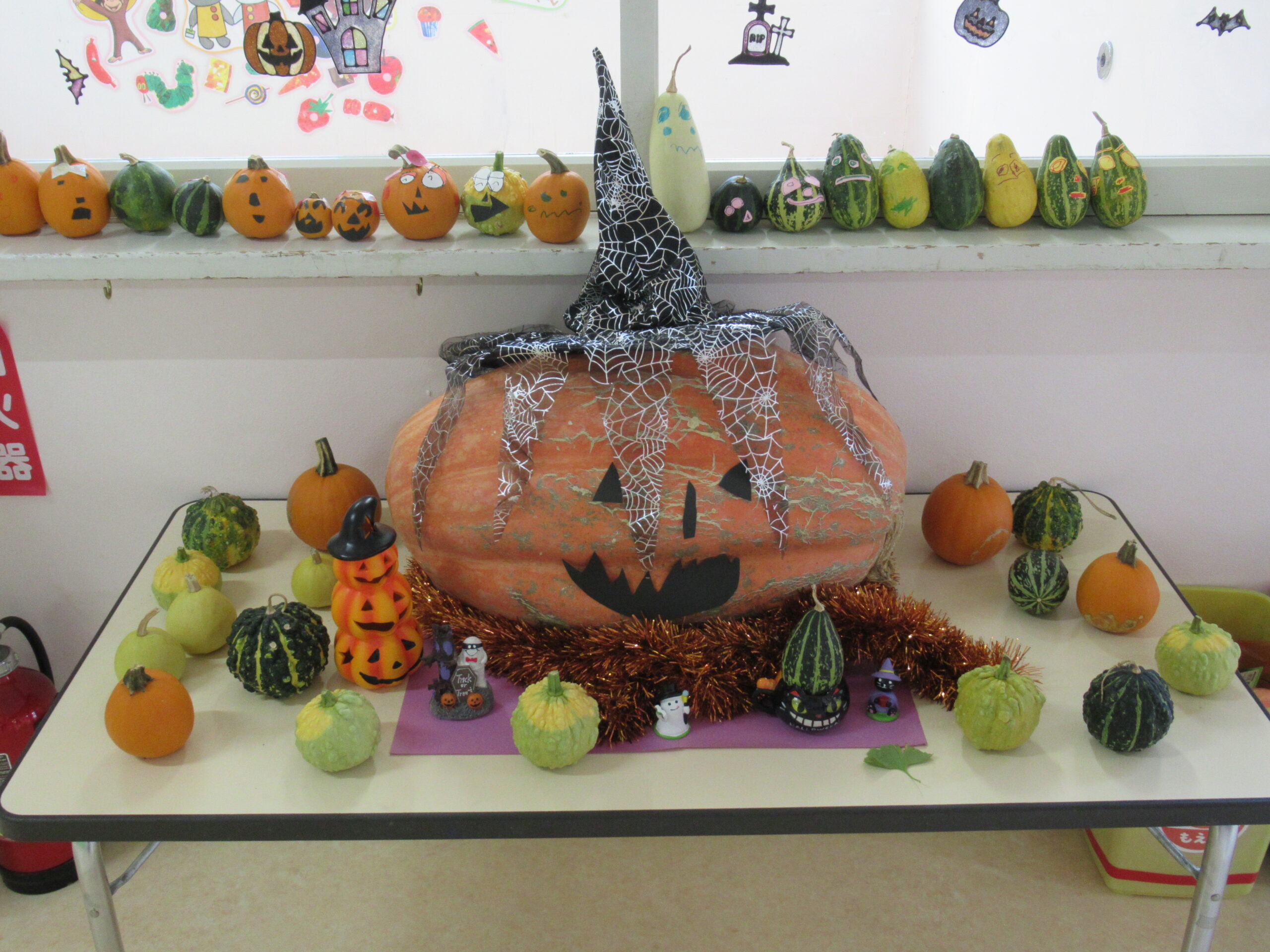 園医の先生の畑で育てたかぼちゃをたくさんいただいたので、みんなで目や口をつけて飾りつけをしました。