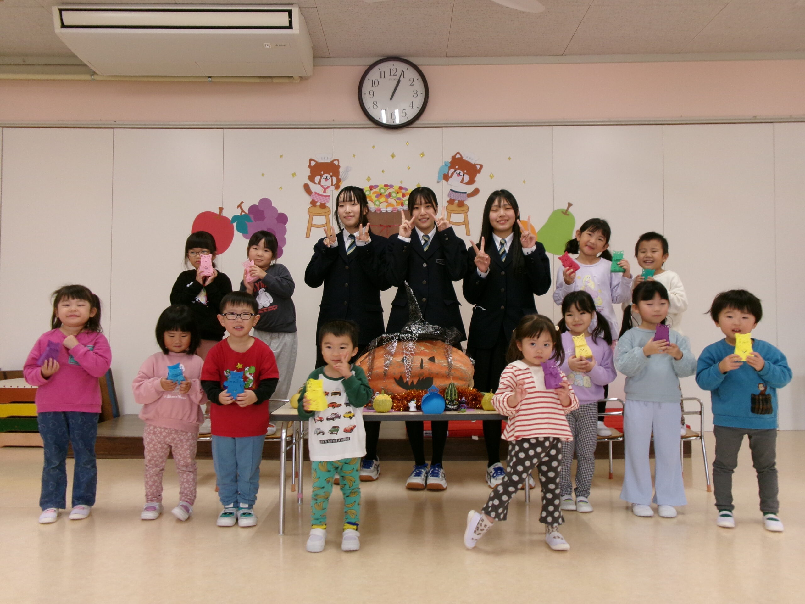 31日は高校のお姉さんたちがお菓子のプレゼントをしてくれました。かわいい入れ物を作って、その中にお菓子を入れてハロウィンの日にいつも持ってきてくれるキルト部のお姉さんたちと一緒に写真も撮りましたよ📷