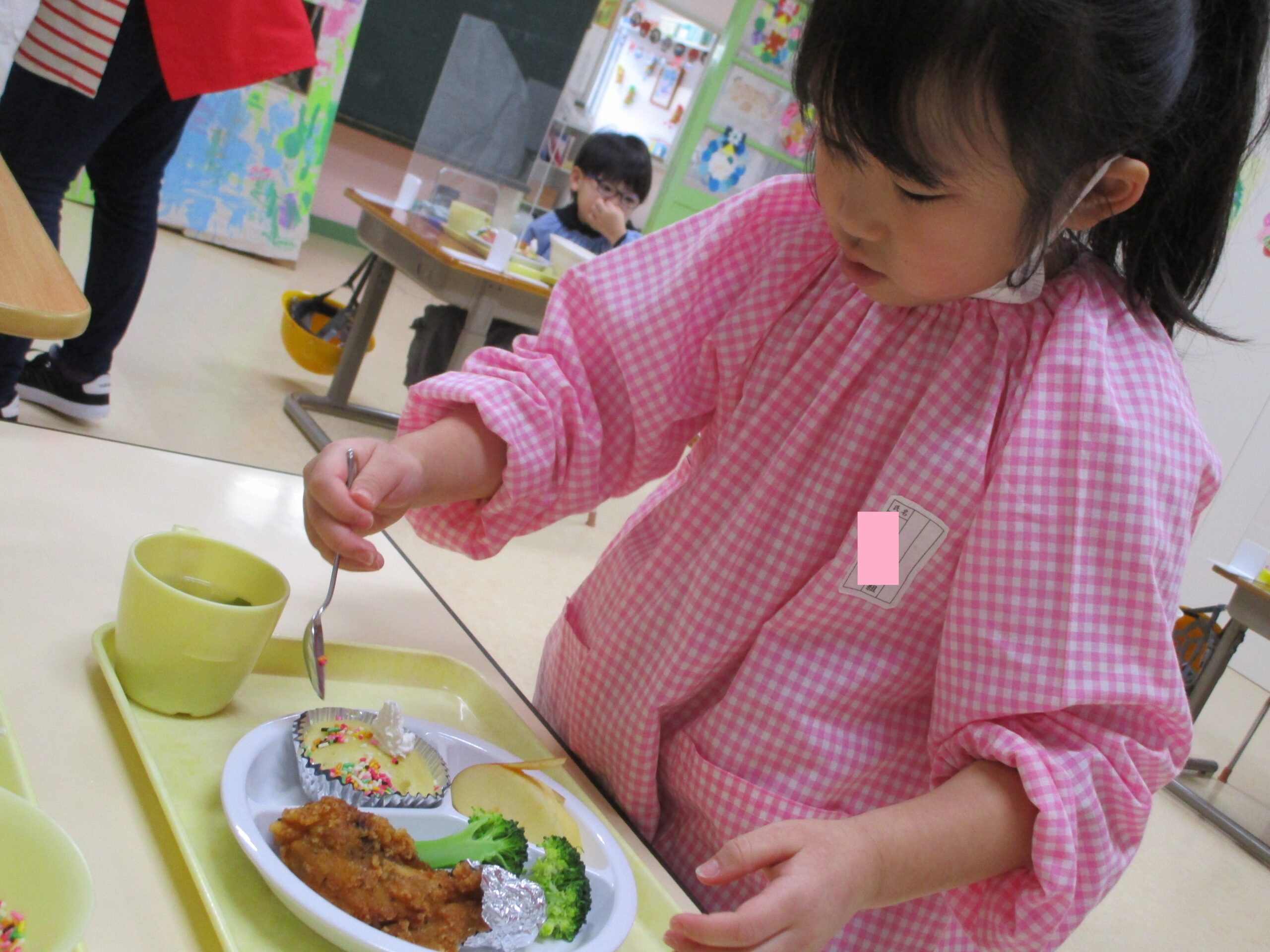 給食先生の手作りデザート「りんごの蒸しパン」に、子ども達が生クリームとチョコスプレーでデコレーションしました。デコレーションするときの表情は真剣そのもの✨